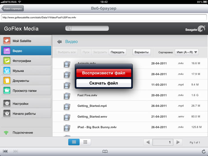 Отсутствие Android или iOS или нелюбовь к установке «лишних приложений» — не помеха. К GoFlex Media можно спокойно подключаться из браузера или через альтернативные плееры вроде VLC, AVPlayer HD или OPlayer. И все же на поддерживаемых устройствах лучше пользоваться фирменной утилитой, — хотя бы потому, что она позволяет не только просматривать, но и скачивать файлы в локальный каталог даже на iPad и iPhone. Такое может пригодиться, если батарея заканчивается, а фильм просмотреть хочется. Копирование не особенно быстро — получается примерно 3 Мбайт/с.