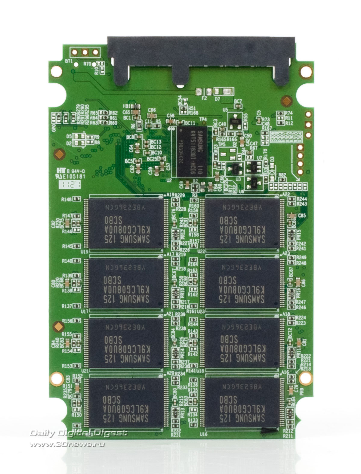 ⇡#Комплект поставки, конструкцияВ комплекте поставки накопителя нет ничего, кроме бумажной инструкции по установке и комплекта винтиков. Конструкция пластикового корпуса такова, что шляпки двух из четырех скрепляющих его винтов закрыты лицевой пластиной, которая, судя по всему, посажена на клей. Чтобы добраться до печатной платы, нам пришлось прорезать корпус с одной стороны. Благо материал мягкий и податливый. А вот и плата с контроллером JMicron JMF616. Массив памяти набран микросхемами Samsung.