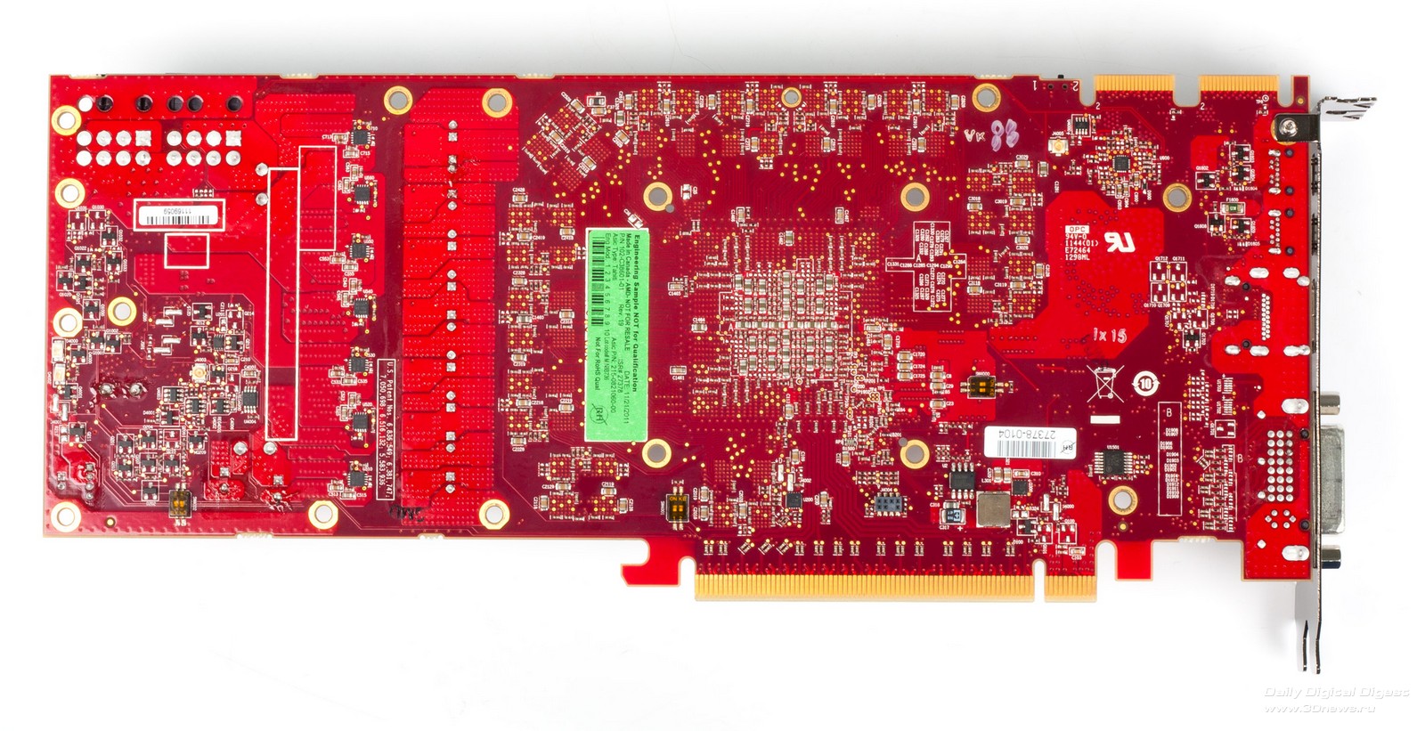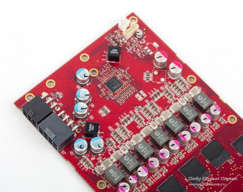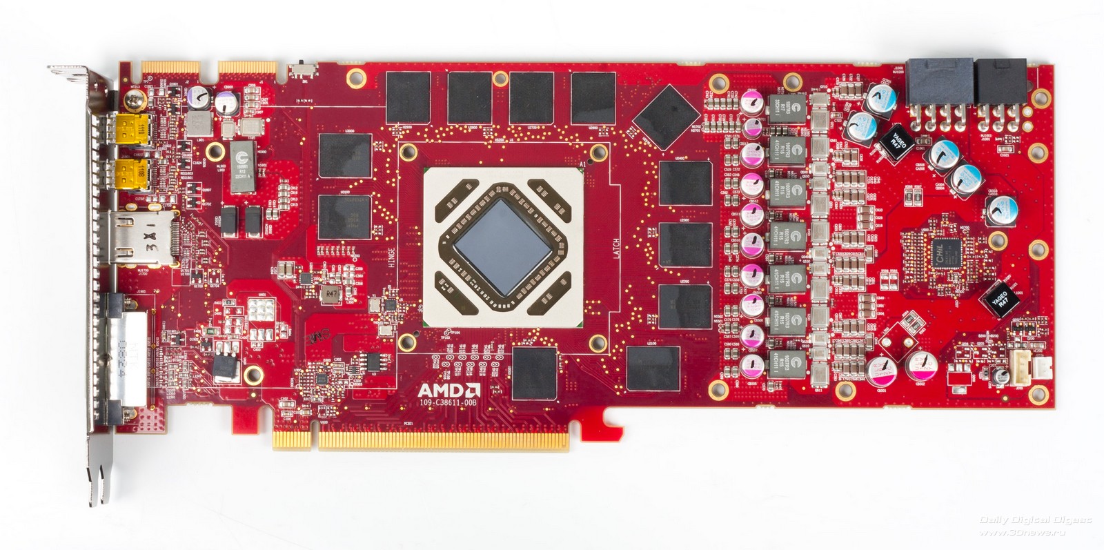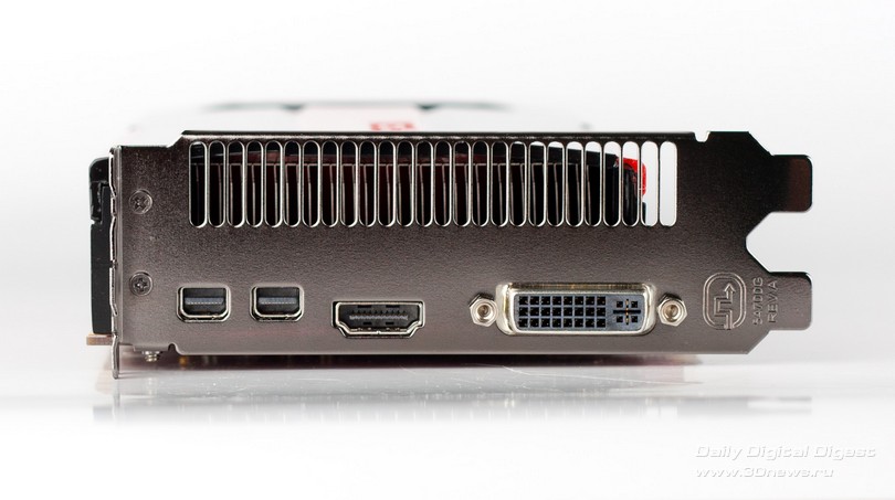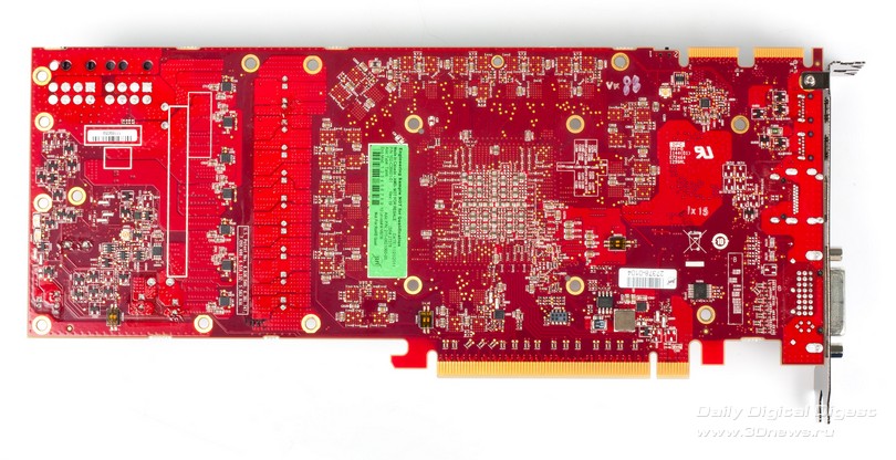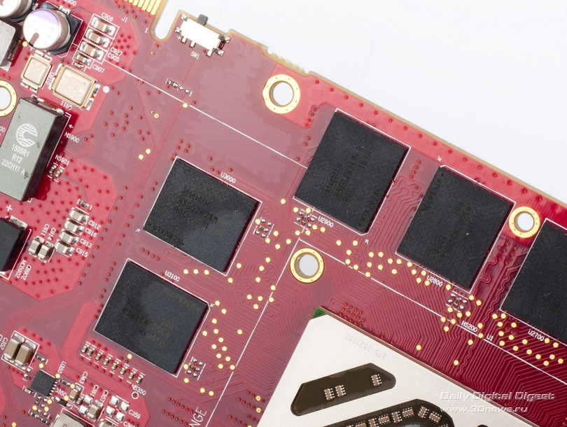 Новые Radeon поддерживают DisplayPort 1.2, а значит – технологию Multi-Stream. С ее помощью можно подключать к одному выходу три дисплея по цепочке или через специальный хаб. Причем на выходе хаба может быть не только DisplayPort, но и интерфейсы HDMI, DVI и VGA. AMD обещает, что хабы появятся в продаже летом 2012 года. ![]() HDMI-выход соответствует стандарту 1.4а, поэтому может передавать двойной сигнал на 3D-телевизор с частотой 24 кадра на каждый канал. А специально для игр есть поддержка 3 GHz HDMI с частотой 60 Гц на канал. Кроме того, стандарты DisplayPort 1.2 HBR 2 и 3 GHz HDMI пригодятся для подключения грядущих дисплеев с разрешением 4096x2160. ⇡#Radeon HD 7970⇡#Технические характеристикиHD 7970 – одночиповый флагман линейки, представляющий архитектуру GCN во всей мощи. Его GPU называется Tahiti и содержит 32 CU (Compute Units), устройство которых подробно описано выше. Если пересчитать это на количество отдельных ALU, как AMD делала до сих пор, то получится 2048 штук – в полтора раза больше, чем в ядре Cayman! И блоков TMU (texture mapping units) в Tahiti тоже 128 против 96. Шина памяти – 384-битная вместо 256-битной. Если учесть, сколько дополнительной логики добавили в архитектуру, то совершенно не удивительно, что Tahiti состоит из 4,31 миллиарда транзисторов. Просто для сравнения: в Cayman – 2,64 миллиарда, а в GF110 от NVIDIA – три. Работает все хозяйство на частоте 925 МГц. ![]() ![]() Однако чипы с архитектурой GCN печатают по техпроцессу 28 нм, так что по электрической мощности новинка удержалась в рамках HD 6970 – те же 250 Вт, да и сам кристалл не выглядит устрашающе. Карта комплектуется видеопамятью GDDR5 объемом 3 Гбайт. Массив набран микросхемами Hynix H5GQ2H24MFR со штатной частотой 1500 МГц (эффективная частота – 6 ГГц), но здесь они работают на частоте 1375 (5500) МГц. Рекомендованная цена HD 7970 составляет 549 долларов, что делает его самым дорогим одночиповым адаптером Radeon за всю их историю. ⇡#Внешний вид, конструкцияВ оформлении семитысячной серии AMD отступила от брутальных форм Radeon HD 6000 и выбрала броский дизайн с плавными линиями и глянцевой поверхностью кожуха. Вернулся узнаваемый красный текстолит, в этот раз – с малиновым оттенком. По габаритам Radeon HD 7970 не отличается от предшествующих одночиповых флагманов AMD/ATI. Продукция кирпичного завода AMD Карта тяжелая. Берешь в руку – и чувствуется мощь. Все дело в системе охлаждения с крупной испарительной камерой, приделанной к толстой раме. Со времен Radeon HD 6970 конструкция не претерпела больших изменений, разве что вентилятор-турбинка стал шире. Для лучшего охлаждения с заглушки убрали один порт DVI, чтобы целиком занять слот выхлопной решеткой. С задней стороны, как и раньше, есть прижимная крестовина. От сплошной крышки решили отказаться. На печатной плате, как и у HD 6970, есть переключатель между основным и резервным BIOS. А еще по задней поверхности разбросано несколько мелких сдвоенных переключателей неизвестного назначения, которые мы, от греха подальше, решили не трогать. Возможно, что перед нами лишь инженерный образец HD 7970 и на серийных платах этих странных элементов уже не будет. В хвосте платы расположены семь катушек индуктивности и восьмифазный контроллер напряжения CHiL CHL8228G, чему, без сомнения, будут рады оверклокеры, ведь он уже использовался на картах Radeon HD 6970, . Скорее всего, и схема питания карты организована по-старому: шесть фаз приходятся на GPU и одна отдана для питания внутренних цепей микросхем GDDR5. В противоположн