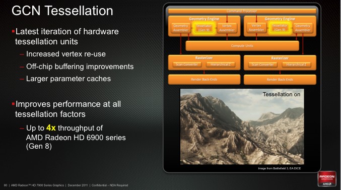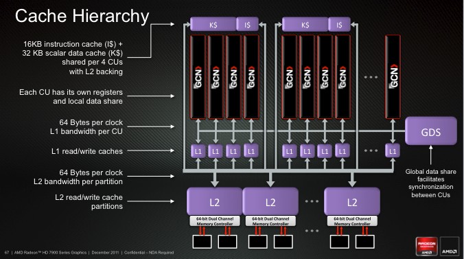 ⇡#ВведениеАрхитектура графических процессоров AMD (ATI) не подвергалась существенным изменениям со времен серии Radeon HD 2000: вплоть до HD 6000 в GPU использовался VLIW-дизайн. Что это такое? Сначала вспомним, как работает центральный процессор в наших персоналках. Современные CPU – суперскалярные, то есть их вычислительные блоки могут выполнять несколько инструкций из одного потока одновременно. Но инструкции при этом должны быть независимыми друг от друга, поэтому процессор непрерывно проверяет, когда можно выполнять параллельные операции, а когда нужно подождать разрешения очередной зависимости. Кроме того, CPU занимается предсказанием ветвлений и может делать часть работы заранее (out-of-order). Оптимизация этих функций – сложная техническая задача, а схемы, на которых они построены, занимают добрую часть кристалла CPU. Но есть другой путь: задать порядок исполнения инструкций на этапе компиляции кода. Компилятор сам находит инструкции, которые можно выполнять одновременно, и формирует из них длинные составные конструкции. Отсюда и термин VLIW – very long instruction word. VLIW в общем случае показывает высокую эффективность, когда код содержит мало зависимостей, а ход программы предсказуем. Компилятор «знает» код от начала до конца и может задать исполнение определенных фрагментов с большим запасом по времени. Но планирование получается жестким, и в случае когда ход программы зависит от внешних данных, хитроумная компиляция уже мало помогает, исполнительные блоки простаивают и производительность идет вниз. Но рендеринг 3D-графики – предсказуемая задача и отлично распараллеливается. Поэтому ставка на VLIW, которую сделала тогда еще независимая канадская компания, себя полностью оправдала. Переложив функции планировщика на компилятор, ATI могла делать относительно компактные чипы с бешеными сотнями исполнительных элементов внутри, и видеокарты в результате получились относительно недорогими. Звездный час VLIW в исполнении AMD пришелся на время Radeon HD пятитысячной серии, когда дебют архитектуры Fermi от NVIDIA (GeForce 400) немного забуксовал. И неудивительно, ведь «зеленым» приходится делать огромные чипы, вплоть до трех миллиардов транзисторов. И даже сейчас, когда в адаптерах GeForce 500 архитектура Fermi уже работает на полную мощность, а топовые ускорители NVIDIA побеждают в бенчмарках продукцию AMD, шеститысячные Radeon все еще обеспечивают отличную производительность в играх. В таком случае, зачем AMD решилась на столь резкий поворот? Казалось бы, достаточно немного отполировать дизайн GPU, нарастить вычислительных блоков тут и там, внедрить более тонкий технологический процесс — и VLIW будет жить долго и счастливо. Зачем тратить время и деньги на разработку совершенно новой архитектуры? Но дело не только и не столько в играх. GPU медленно превращаются из устройств, предназначенных исключительно для 3D-рендеринга, в процессоры общего назначения (GPGPU – general purpose GPU), которые можно использовать для любых массированных параллельных вычислений. Однако на сегодняшний день вышло так, что если мы говорим GPGPU, то подразумеваем CUDA. Ни родной для «красных» API под названием ATI Stream, ни Open CL не имеют такой популярности, как CUDA от NVIDIA. Между тем AMD очень хочет откусить кусок от этого рынка, но чтобы это стало возможным, со старой доброй архитектурой VLIW придется расстаться. Для неграфических вычис