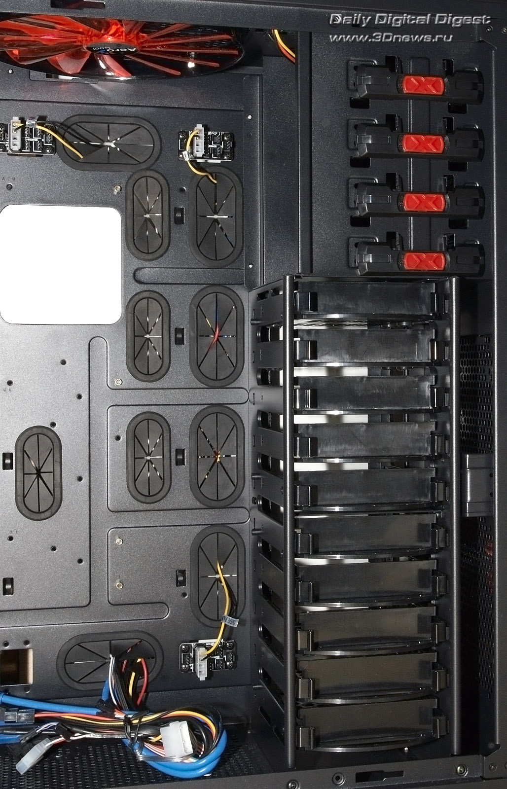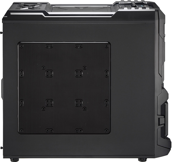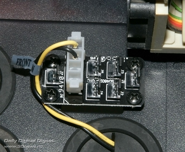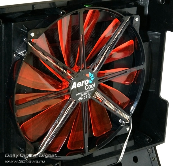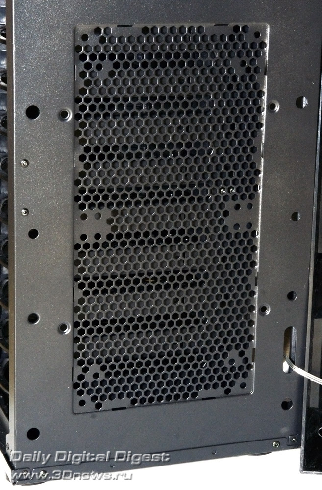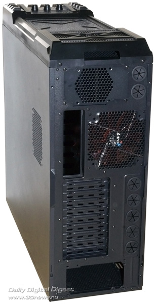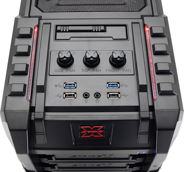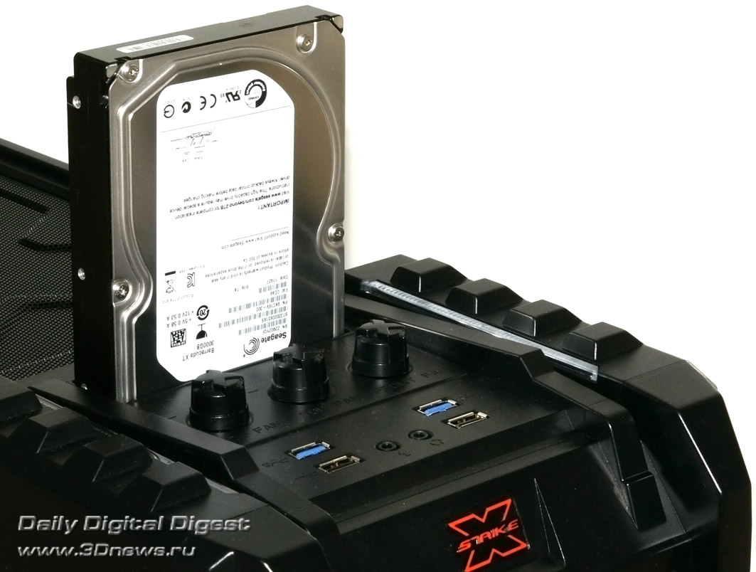 Aerocool Strike-X ST Black с разных ракурсов Тяжёленький (14,5 кг — не шутка!) полноразмерный (Full Tower) корпус вынимать из коробки и переносить с места на место неудобно даже пустым — ручек в конструкции для этого не предусмотрено (разве что две режущие пальцы выемки — сзади в пластиковой верхней крышке и снизу в передней, обе не внушают особого доверия в плане прочности из-за тонкой пластмассы). Так что, нагибаясь, поберегите поясницу. А корпус лучше размещать на полу, предварительно прикрутив специальные колёсики из комплекта, чтобы его легче было выдвигать из-под стола (с ними высота корпуса возрастает до 680 мм). Оперативность замены/добавления комплектующих здесь не самая высокая, корпус скорее удобен для «стационарного» компьютера, чем для частых энтузиастских экспериментов с разным железом. Об этом говорит и наличие всего лишь 4 передних 5,25-дюймовых отсеков — для полноразмерного корпуса это необычно мало, в ином компактном Midi Tower передних отсеков побольше будет. Кстати, прикрыты они простенькими сплошными (без вентиляционных отверстий) пластмассовыми накладками, не больно-то удобными для частого снятия/установки, так что в этих отсеках лучше сразу смонтировать все необходимые приводы/корзины и больше их не трогать. ![]() А вообще цельнолитая пластиковая «морда» (иного слова для неё я просто не подберу) этого корпуса, выполненная в стиле антуража подземелий шутеров вроде Doom и Half Life, рассчитана явно на «очень узкого» любителя, элегантностью здесь не пахнет даже близко. Многочисленные выступы и выемки на передней панели никакой функциональной нагрузки не несут и призваны подчеркнуть лишь бурную фантазию дизайнеров этого изделия. Сам пластик передней панели в плане качества и фактуры поверхности тоже «не самых благородных кровей» (и это видно на наших фото, хотя на картинках от производителя вид явно облагорожен — см. фото под таблицей ранее). Переднюю сторону корпуса спасает лишь металлическая решётка вентилятора снизу (правда, она неплотно посажена и может дребезжать при вибрациях корпуса). Впрочем, как я уже говорил выше, этот корпус лучше сразу задвинуть под стол «с глаз подальше» и наслаждаться установленными внутрь комплектующими. Благо здесь простора несравнимо больше, чем у «передка» корпуса. Кстати, напольному использованию Aerocool Strike-X ST способствует и верхняя панель корпуса, «утопленная» центральная часть которой содержит широкую (170х250 мм) металлическую вентиляционную решётку (над верхним 200-миллиметровым корпусным пропеллером, см. фото), а передняя часть насыщена разъёмами (по паре USB 2.0, синих USB 3.0 и одноцветных HD Audio, которые очень легко перепутать), содержит удобные плавные регуляторы оборотов трёх групп вентиляторов (Side/Top/Front) и очень полезный SATA-док для горячего подключения HDD/SSD форм-фактора 3,5 или 2,5 дюйма. В отсутствие накопителя приёмная щель дока прикрыта подпружиненной двухстворчатой шторкой. Диск в док вставляется вертикально, при этом заметно выдается над корпусом, так что место над ним лучше держать пустым (это хорошо и для вентиляции). В свете этого (и высоты корпуса на колёсиках в 680 мм) корпус Aerocool Strike-X ST, скорее всего, придётся эксплуатировать не под столом, а рядом с ним. Переходная плата дискового дока под верхней крышкой корпуса Платы разъёмов верхней панели (вверху) и трёхканального реобаса (внизу) К сожалению, 