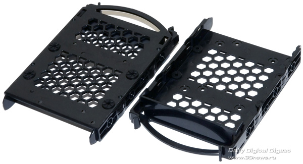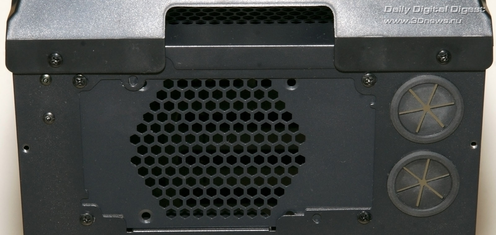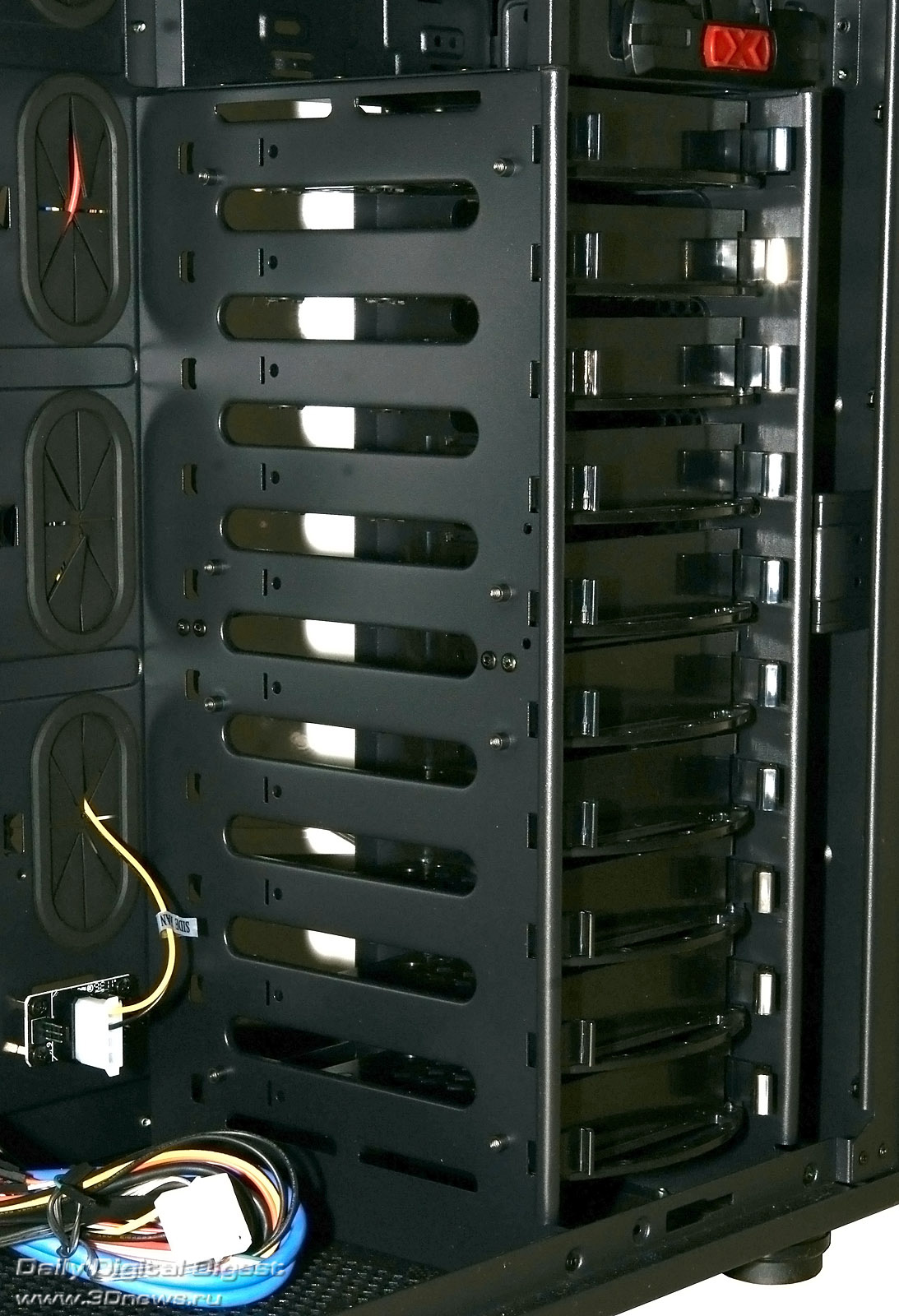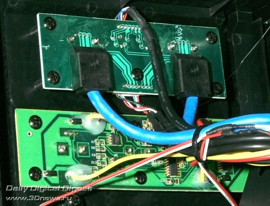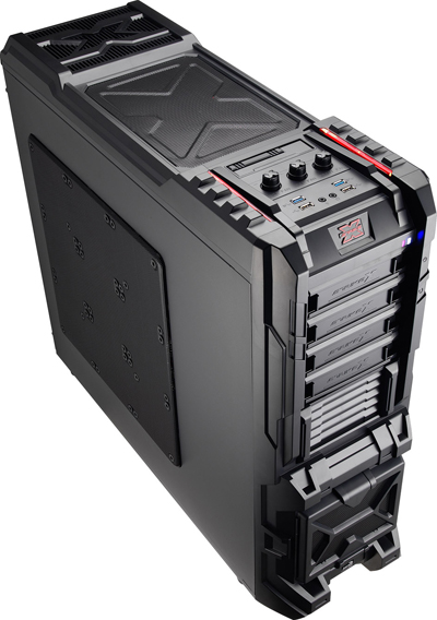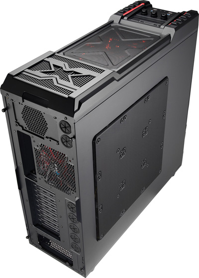 Aerocool Strike-X ST Black с разных ракурсов Тяжёленький (14,5 кг — не шутка!) полноразмерный (Full Tower) корпус вынимать из коробки и переносить с места на место неудобно даже пустым — ручек в конструкции для этого не предусмотрено (разве что две режущие пальцы выемки — сзади в пластиковой верхней крышке и снизу в передней, обе не внушают особого доверия в плане прочности из-за тонкой пластмассы). Так что, нагибаясь, поберегите поясницу. А корпус лучше размещать на полу, предварительно прикрутив специальные колёсики из комплекта, чтобы его легче было выдвигать из-под стола (с ними высота корпуса возрастает до 680 мм). Оперативность замены/добавления комплектующих здесь не самая высокая, корпус скорее удобен для «стационарного» компьютера, чем для частых энтузиастских экспериментов с разным железом. Об этом говорит и наличие всего лишь 4 передних 5,25-дюймовых отсеков — для полноразмерного корпуса это необычно мало, в ином компактном Midi Tower передних отсеков побольше будет. Кстати, прикрыты они простенькими сплошными (без вентиляционных отверстий) пластмассовыми накладками, не больно-то удобными для частого снятия/установки, так что в этих отсеках лучше сразу смонтировать все необходимые приводы/корзины и больше их не трогать. ![]() А вообще цельнолитая пластиковая «морда» (иного слова для неё я просто не подберу) этого корпуса, выполненная в стиле антуража подземелий шутеров вроде Doom и Half Life, рассчитана явно на «очень узкого» любителя, элегантностью здесь не пахнет даже близко. Многочисленные выступы и выемки на передней панели никакой функциональной нагрузки не несут и призваны подчеркнуть лишь бурную фантазию дизайнеров этого изделия. Сам пластик передней панели в плане качества и фактуры поверхности тоже «не самых благородных кровей» (и это видно на наших фото, хотя на картинках от производителя вид явно облагорожен — см. фото под таблицей ранее). Переднюю сторону корпуса спасает лишь металлическая решётка вентилятора снизу (правда, она неплотно посажена и может дребезжать при вибрациях корпуса). Впрочем, как я уже говорил выше, этот корпус лучше сразу задвинуть под стол «с глаз подальше» и наслаждаться установленными внутрь комплектующими. Благо здесь простора несравнимо больше, чем у «передка» корпуса. Кстати, напольному использованию Aerocool Strike-X ST способствует и верхняя панель корпуса, «утопленная» центральная часть которой содержит широкую (170х250 мм) металлическую вентиляционную решётку (над верхним 200-миллиметровым корпусным пропеллером, см. фото), а передняя часть насыщена разъёмами (по паре USB 2.0, синих USB 3.0 и одноцветных HD Audio, которые очень легко перепутать), содержит удобные плавные регуляторы оборотов трёх групп вентиляторов (Side/Top/Front) и очень полезный SATA-док для горячего подключения HDD/SSD форм-фактора 3,5 или 2,5 дюйма. В отсутствие накопителя приёмная щель дока прикрыта подпружиненной двухстворчатой шторкой. Диск в док вставляется вертикально, при этом заметно выдается над корпусом, так что место над ним лучше держать пустым (это хорошо и для вентиляции). В свете этого (и высоты корпуса на колёсиках в 680 мм) корпус Aerocool Strike-X ST, скорее всего, придётся эксплуатировать не под столом, а рядом с ним. Переходная плата дискового дока под верхней крышкой корпуса Платы разъёмов верхней панели (вверху) и трёхканального реобаса (внизу) К сожалению, 