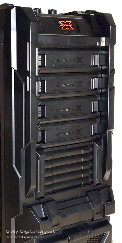 Тайваньская компания Aerocool в представлении не нуждается. Её изделия (компьютерные корпуса, системы охлаждения и прочие) давно известны большинству продвинутых пользователей ПК. Рассматриваемый в этой статье новый корпус Strike-X ST продолжает линейку внушительных продуктов для высокопроизводительных геймерских и оверклокерских систем, призванных удовлетворить почти любые запросы компьютерных энтузиастов. Кроме, возможно, эстетических. ⇡#Устройство и характеристикиОгромная коробка с корпусом весит 18 кг, а ее габариты составляют 810х733х335 мм — такую в автобус или метро просто так не занесёшь, да и не всякий багажник седана её примет. Огненно-чёрный «окрас» коробки подчёркивает направленность изделия на геймеров и оверклокеров. Помимо фотографий корпуса, грани коробки содержат спецификации изделия и мультиязычную «агитку», живописующую достоинства его конструкции: агрессивный дизайн серии Х, «высокую производительность» с возможностью установки в этом корпусе до 21 вентилятора, цельную конструкцию из 0,8-миллиметровой «японской стали» (хотя корпус изготовлен в континентальном Китае), поддержку сверхдлинных (до 430 мм) карт расширения, отверстия с резиновой окантовкой для кабелей и системы жидкостного охлаждения, антипылевые фильтры, резиновые «подушки» для защиты HDD и БП, возможность установки двух БП, 10 слотов для карт расширения (для Quad SLI и пр.). Здесь же упомянута поддержка длинных «материнок» формата XL-ATX, предустановленные 3 блока «переходников вентиляторов плат PCB» (это цитата), которые позволяют управлять 18 пропеллерами со встроенного в корпус реобаса, три больших вентилятора с красной подсветкой в базовом комплекте, колёсики для облегчения перевозки корпуса и прочее. Комплект поставки корпуса Aerocool Strike-X ST Black В комплекте с корпусом идут четыре пластиковые ножки-колёсика (с индивидуальными фиксаторами вращения), наборы винтов четырех типоразмеров (HDD, FDD, MB и «для колёсиков») и краткое (5-страничное) руководство пользователя на разных языках. ⇡#Спецификации корпуса Aerocool Strike-X ST (Black)