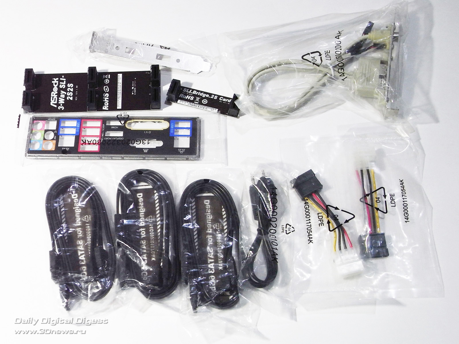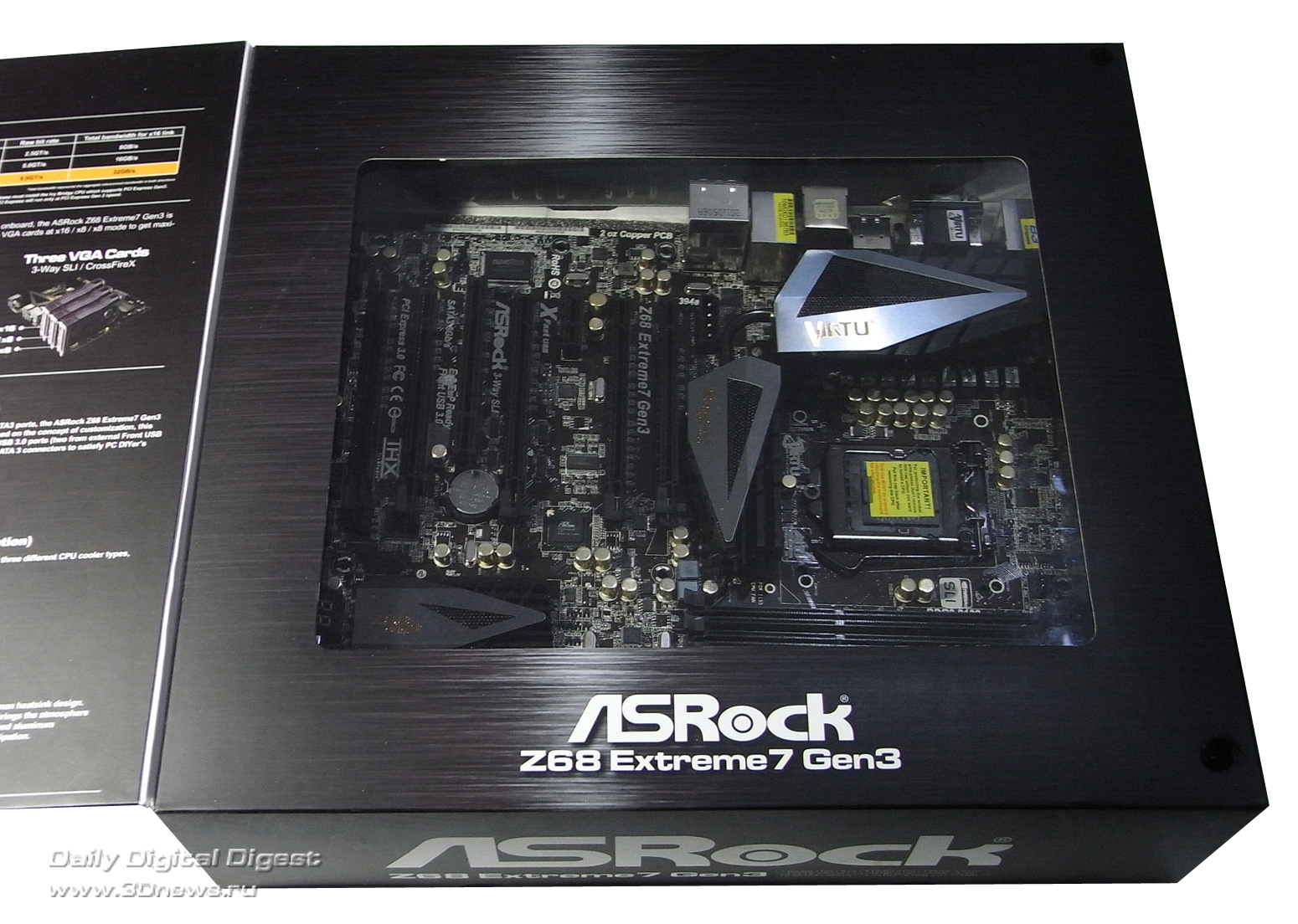 Коробка с платой ASRock Z68 Extreme7 снабжена ручкой для удобства переноски и выглядит следующим образом: Коробка выполнена в виде книжки. Открыв ее, покупатель может увидеть плату через большое окно: ⇡#Комплектация: