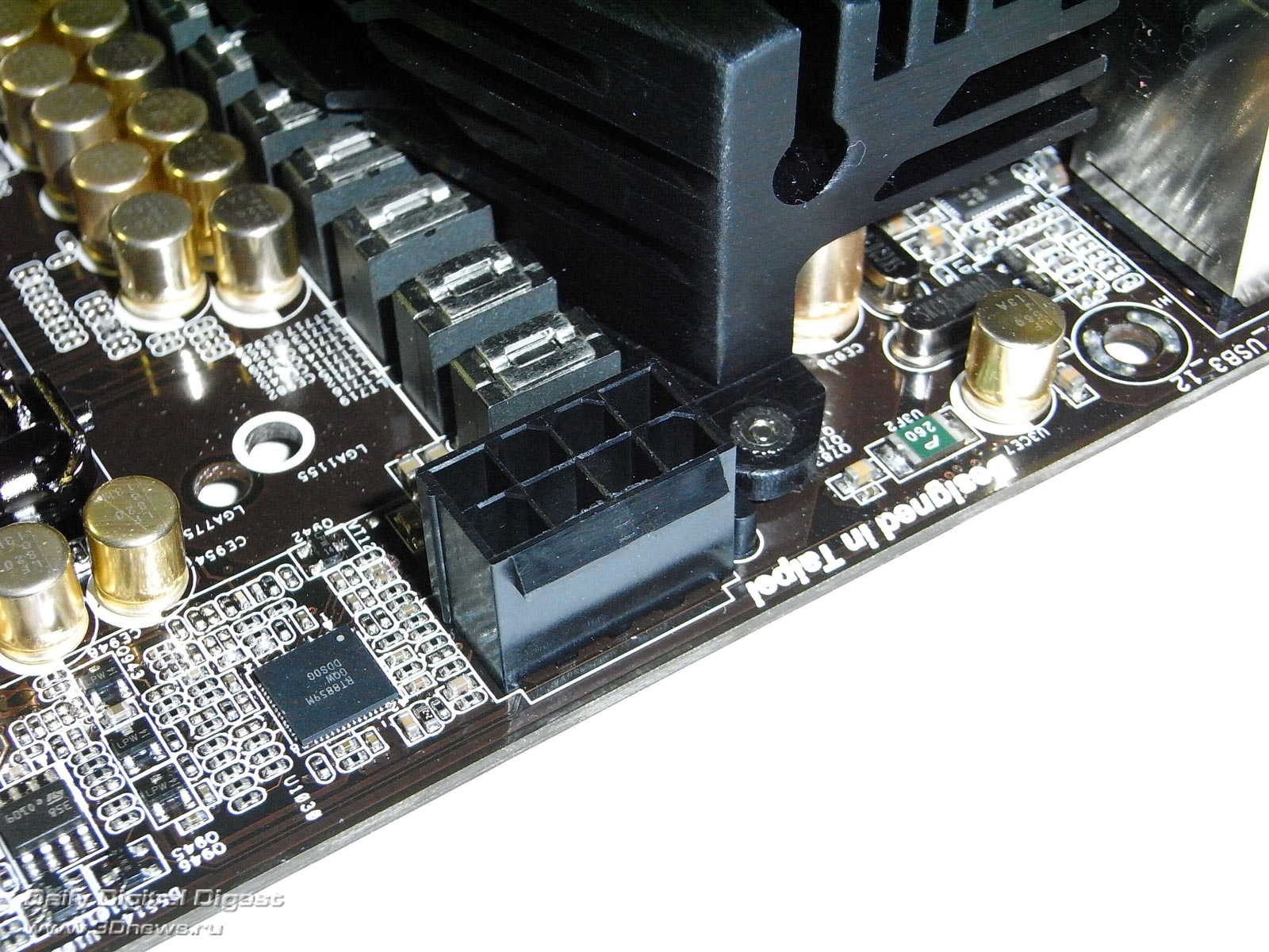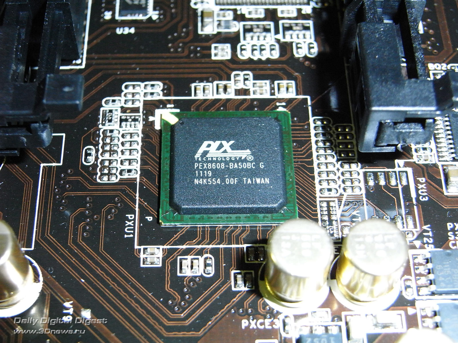 Комплектация платы оказалась на удивление полной и сбалансированной. Во-первых, пользователь получает достаточное количество кабелей SerialATA и пару переходников питания, которые будут полезными при недостаточном количестве соответствующих разъемов у блока питания. Во-вторых, в коробке можно найти специальную панель (черного цвета) на лицевую часть корпуса, на которую выведены два порта USB 3.0. Также в эту панель пользователь может установить 2,5-дюймовый жесткий диск. Если у пользователя белый корпус, то панель можно разобрать и вывести порты USB 3.0 на заднюю панель корпуса. Для этого в комплектации предусмотрена специальная металлическая пластина. В-третьих, присутствует еще одна планка с парой портов USB 2.0, а также портом PS/2 для устаревших клавиатур и мышек. На наш взгляд, это наиболее элегантное решение для поддержки подобной периферии. Также отметим наличие аудиокабеля и соединительных мостов для SLI-конфигураций из двух и трех видеокарт. Что касается документации, то она выполнена в стандартном стиле ASRock: толстая книжка с краткой информацией о функциях платы, которая продублирована на большом количестве языков, и небольшая брошюра с описанием настроек BIOS на английском языке. Также отметим, что DVD-диск имеет полный набор драйверов и утилит, которые устанавливаются через удобную оболочку: ![]() ⇡#Плата ASRock Z68 Extreme7Главной особенностью платы ASRock Z68 Extreme7 является наличие пяти полноразмерных PEG-слотов, причем второй слот поддерживает шину PCI Express спецификации 3.0, в случае использования одной видеокарты. В случае использования двух или трех видеокарт распределение линий осуществляется по схемам 16+0+16 и 16+0+8+0+8; а на четвертый PEG-слот всегда выделяется четыре линии шины PCI-E. Реализация подобных схем потребовала от разработчиков применения нескольких нестандартных решений. Во-первых, для поддержки шины PCI Express v3.0 были использованы свитчи нового поколения. Во-вторых, для увеличения количества линий PCI-E на плату был установлен чип NVIDIA NF200. Этот шаг позволил инженерам распоряжаться не 16 линиями, а уже 32. В-третьих, на плату был установлен мост PCI Express PLX PEX8608: Именно это позволило выделить на четвертый PEG-слот четыре линии шины, без какого-либо ущерба для остальных периферийных контроллеров. Тут же добавим, что на плате установлен один слот PCI Express x1 и один слот PCI, функциональность которого обеспечивается дополнительным чипом ASMedia ASM1083: Понятно, что топовая графическая подсистема предъявляет особые требования к качеству и стабильности питания. Поэтому инженеры ASRock разработали довольно мощный преобразователь, а также установили на плате целых три разъема питания. Основной расположен на нижнем краю платы, дополнительный 8-контактный — на левом краю (также позволяет подключать 4-контактный кабель), а 4-контактный разъем (типа Molex) — в центре платы. Рядом с процессорным разъемом установлены два разъема питания для соответствующего кулера: 4-контактный разъем CPU_FAN1 и 3-контактный CPU_FAN2. Кроме этого, на плате присутствуют три 3-контактных разъема и один 4-контактный (на левом краю платы). На плате установлено четыре 240-контактных слота DIMM для модулей памяти DDR3, причем без какой-либо цветовой индикации, облегчающей установку модулей в двухканальный режим. В результате пользователю придется открывать документацию, в которой указано, что для такого режима пла