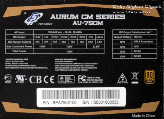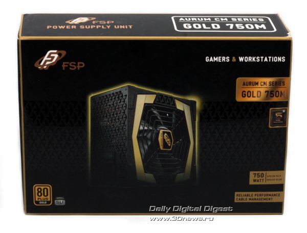 Сегодня мы знакомим наших читателей с недавно побывавшим на тестовом стенде лаборатории 3DNews блоком питания AURUM GOLD CM 750 (AU-750M) производства компании FSP Group. Новый модельный ряд AURUM GOLD CM 90 Plus, представленный на сегодняшний день тремя моделями AU-550M, AU-650M и AU-750M мощностью 550 Вт, 650 Вт и 750 Вт соответственно, является флагманской линейкой производительных блоков питания БП FSP, ориентированных на использование в мощных игровых системах. ![]() В семействе AURUM GOLD CM 90 Plus, как и положено топовой линейке, воплощены все самые современные технологические наработки компании, такие как чип FSP MIA IC для высокой производительности и надёжной защиты, технология Arrow Flow для эффективного охлаждения компонентов, система плоских кабелей Low Profile Flat Cabling для оптимизации воздушных потоков внутри корпуса ПК, а также новая схемотехника шин 12 В, Hybrid Synergy 12V Rail Design, обеспечивающая максимальную нагрузку каналов питания при использовании любых типов видеокарт. Кроме того, для блоков питания AURUM CM характерен элитный дизайн корпуса с "объёмным" покрытием, а также высокий КПД, соответствующий требованиям стандарта 80PLUS Gold. Подробные характеристики рассматриваемой сегодня модели приведены в таблице ниже.