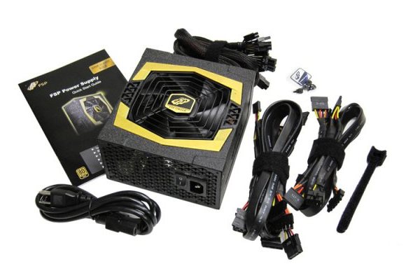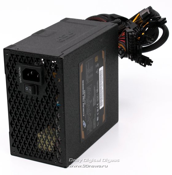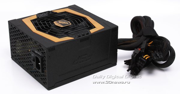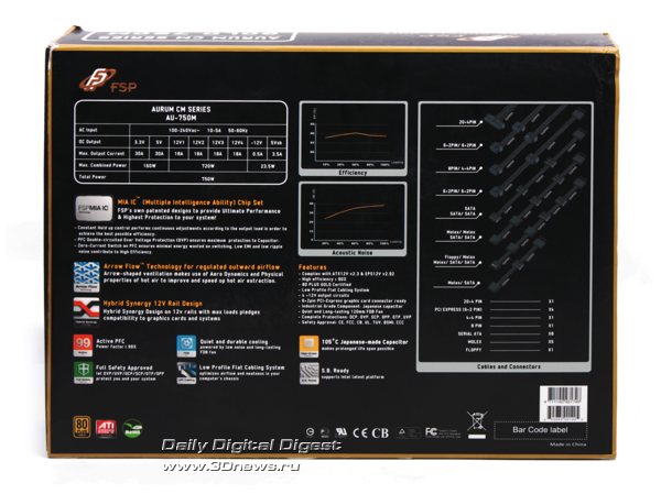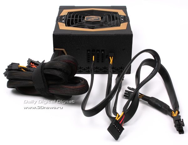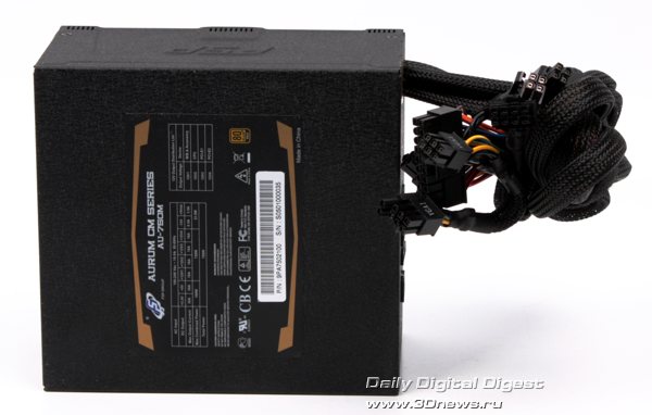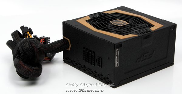 ⇡#Комплект поставки. КонструкцияРозничная упаковка FSP AURUM CM 750 проста и функциональна: дизайн в тёмных тонах с характерными элементами золотистого оттенка, подчёркивающими "золотую" сертификацию модели. На обратной стороне упаковки размещено максимальное количество полезной информации о БП, включая паспортные характеристики входных и выходных цепей, полный расклад по кабельному хозяйству, сведения о ключевых технологиях. ![]() ![]() Внутри коробки мы находим собственно блок питания, комплект съёмных кабелей, силовой кабель, стяжки на липучках, крепёж, инструкцию, гарантийный талон и наклейку с логотипом FSP. Как видите, в комплекте лишь то, что действительно необходимо для работы, без маркетинговых "рюшек" вроде дополнительных мешочков или сумочек. ![]() Принадлежность к "премиальной" элитной серии дизайнеры FSP решили выразить не сувенирной комплектацией, а оформлением дизайна самого блока питания. Уникальное шероховатое "объёмное" покрытие почему-то названо в пресс-релизе "покрытием под гранит", хотя, на ощупь это напыление напоминает скорее поверхность антрацита. Что, впрочем, ни на йоту не умаляет благородного вида блока с золотыми элементами оформления логотипа и декоративного обрамления решётки вентилятора. ![]() Как гласит официальное описание модели, "стрельчатая" вентиляционная решётка "обеспечивает хорошую вентиляцию и превосходное охлаждение", но есть всё же подозрение, что решётка с отверстиями-стрелочками, пришедшая на замену привычной решётке с "сотами", скорее маркетинговое изобретение, нежели рациональное. ![]() Компоновку корпуса можно назвать классической для большинства современных блоков питания с крупным вентилятором на нижней плоскости: разъёмы для подключения модульных кабелей с противоположной стороны от внешней плоскости с выключателем, разъёмом под силовой кабель питания и декоративной вентиляционной решёткой во всю нижнюю плоскость. ![]() ⇡#Кабельная системаСистема кабелей модели AURUM CM 750 включает в себя как встроенные, так и модульные элементы: