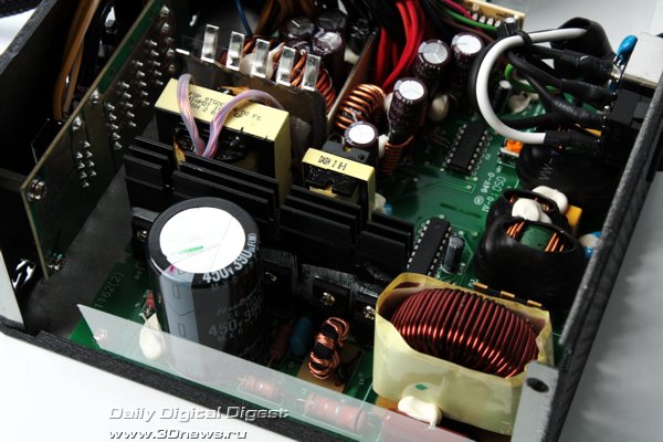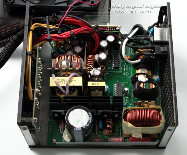 ![]() ![]() Ключевая особенность дизайна съёмных кабелей из комплекта блока питания AURUM CM 750 – плоские шлейфы, позволяющий при надлежащей укладке оптимизировать потоки охлаждающего воздуха внутри корпуса системы. ![]() ⇡#Новые технологии. Взгляд изнутри![]() Серия блоков питания AURUM CM поддерживает новую технологию FSP MIA IC (Multiple Intelligence Ability). Новый чип MIA IC, на разработку которого, согласно официальным данным, в FSP затратили порядка 3 лет, позволяет добиться максимальной производительности при обеспечении высокой степени защиты системы по всем ключевым параметрам, включая защиту от перенапряжения (OVP), недостаточного напряжения (UVP), перегрузки по току (OCP), короткого замыкания (SCP) и перегрузки по мощности (OPP). Иными словами, чип MIA IC представляет собой универсальный запатентованный контроллер, на который возложено управление большинством ключевых функций БП. Система охлаждения блока питания AURUM CM 750 выполнена на базе 120-мм вентилятора MGA12012HF-A25 производства компании Protechnic Electric. Ключевые характеристики вентилятора таковы: гидродинамические подшипники (FDB), напряжение питания 12 В, максимальный ток 0,4 A, максимальная скорость вращения 2400 об/мин, максимальный воздушный поток 84,8 кубического фута в минуту (CFM), 2-проводная система питания и управления с PWM, габариты 120х120х25 мм. Максимальный шум системы охлаждения заявлен на уровне менее 21 дБ. ![]() В серии AURUM CM применена "фирменная" технология Arrow Flow, хорошо известная по предыдущим блокам питания премиальных серий FSP. Суть технологии сводится к тому, что в процессах, формирующих оптимальную аэродинамику охлаждающих потоков воздуха внутри блока питания, задействованы все элементы конструкции, включая специальный профиль рёбер лопастей вентилятора, вентиляционные отверстия, профили радиаторов охлаждения и даже компоновку крупных элементов схемы. ![]() ![]() Первичные цепи преобразователя напряжения выполнены по однотактной схеме, с применением электролитического конденсатора номиналом 390 мкФ, 450 В. Все электролитические конденсаторы, используемые при производстве блока питания AURUM CM 750, имеют японское происхождение и отличаются длительным сроком эксплуатации при максимальной температуре до 105 °C. ![]() Радиаторы системы охлаждения невелики, что является следствием применения современной схемотехники с высоким КПД и небольшим рассеиванием энергии в виде тепла. Монтаж, пайка, крепление крупных компонентов и изоляция в критичных местах выполнены качественно. ⇡#Методика тестированияСо времени наших последних статей о блоках питания методика тестирования, применяемая в лаборатории 3DNews, изменений не претерпела. Ознакомиться с ней в полном объёме можно, например, в этой статье. График, составляемый по результатам исследования коэффициента полезного действия (КПД) тестируемых блоков питания, содержит эталонные показатели по стандартам семейства 80PLUS, а также минимальные требования базового стандарта ATX12V версии 2.2. ⇡#Результаты тестированияЗаполняем параметры нагрузки тестового стенда согласно маркировке модели. ![]() Прогон нагрузочных характеристик блока питания AURUM CM 750 при динамических нагрузках продемонстрировал предсказуемо стабильные результаты при вполне допустимых (не более 3% во всём диапазоне и не более 2% в реально рабочей области) отклонениях от номинала. ![]() Результаты измерения статическ