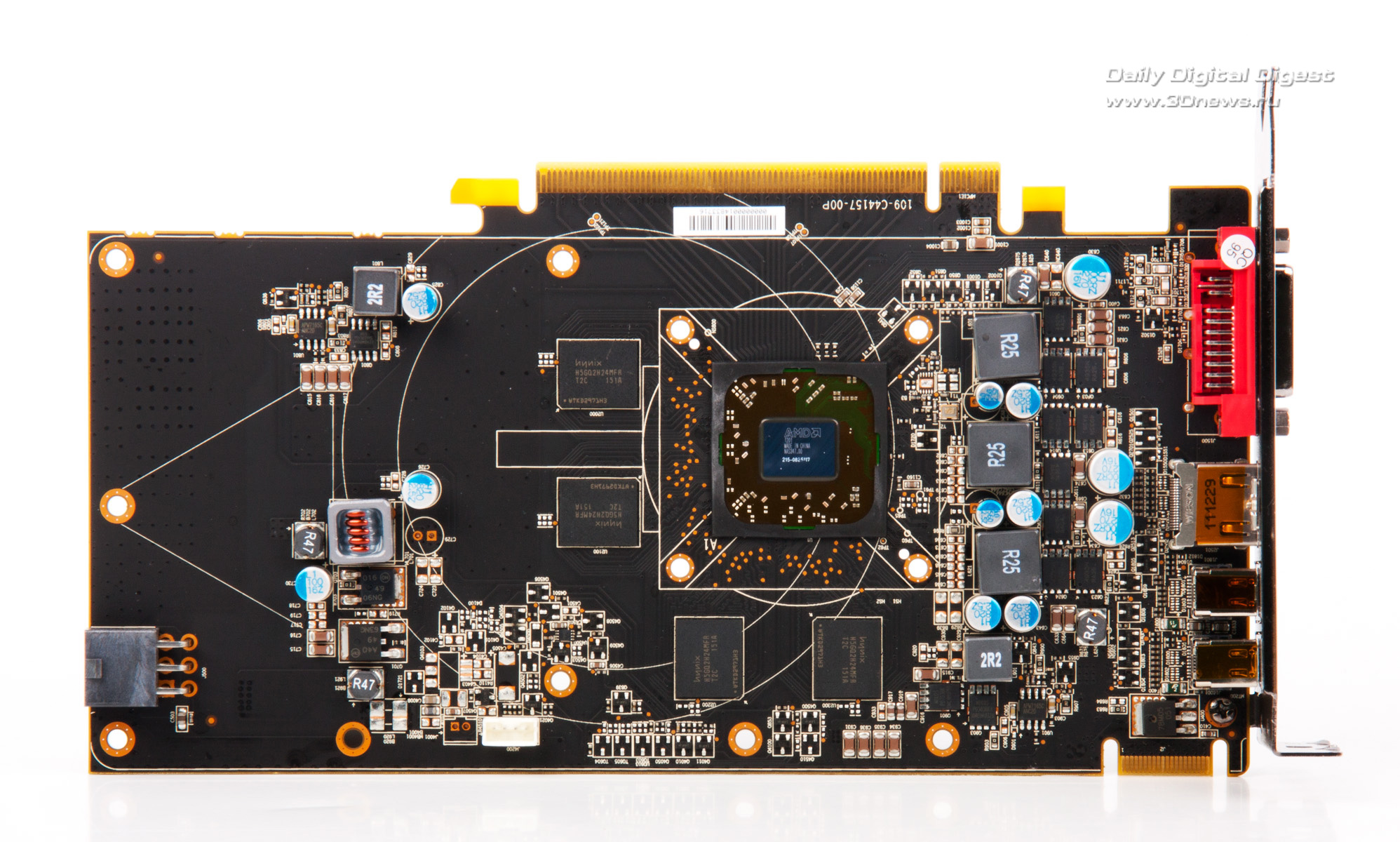 Вместе с картой поставляется пачка бумажной документации, переходники с DVI на D-Sub и с Mini HDMI на DVI, мостик CrossFireX и «медалька» с лейблом Black Edition. XFX R7770 BE SO: конструкция В этой карте используется фирменный кулер открытого типа с двойными вентиляторами. Похожую конструкцию мы уже видели в Radeon HD 7950 производства той же компании и особого восторга, прямо скажем, не испытали. Возможно, для более слабой карты она придется кстати. У R7770, конечно же, радиатор меньше и легче, чем у R7950. Нет испарительной камеры, только небольшая медная пластина, с которой контактирует GPU, а память вообще обходится без дополнительного охлаждения. Но заметим, что, как и в случае с XFX R7950, кулер работает достаточно тихо даже на полных оборотах. По набору и расположению видеовыходов Radeon HD 7700 не отличается от старших карт в серии. XFX R7770 BE SO: плата Карта основана на PCB референсного дизайна. По сравнению с Radeon HD 7950 и 7970 плата гораздо меньше и выглядит проще, есть большие участки, не занятые навесным монтажом. Дополнительное питание подается по единственному шестиконтактному разъему. В системе питания используются шесть катушек индуктивности, трехфазный контроллер STM L6788A и три однофазных чипа APW7165C. Судя по расположению этих компонентов, можно предположить, что процессор питается от четырех фаз и по одной фазе остается на ядра микросхем памяти и буферы ввода-вывода. Сама память набрана чипами Hynix H5GQ2H24MFR-T2C со штатной тактовой частотой 1250 (5000) МГц. То есть, вопреки обычной практике, XFX не только не взяла чипы с запасом по частоте, а даже, наоборот, немного разогнала их сверх номинала.