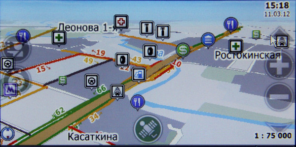 Почти идеально выбраны уровни прозрачности элементов управления и их расположение относительно карты. Почти во всех случаях пользователь может одновременно мониторить маршрут и управлять отдельными функциями, с карты не нужно уходить. Заметьте, как ненавязчиво выглядят полупрозрачные кнопки в левой части экрана (с изображением гаишника и буквой Ё), вызывающие дополнительные меню. А вот как отображаются эти самые дополнительные меню:
