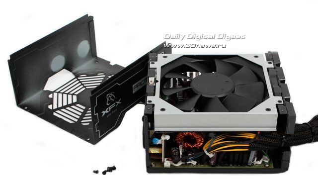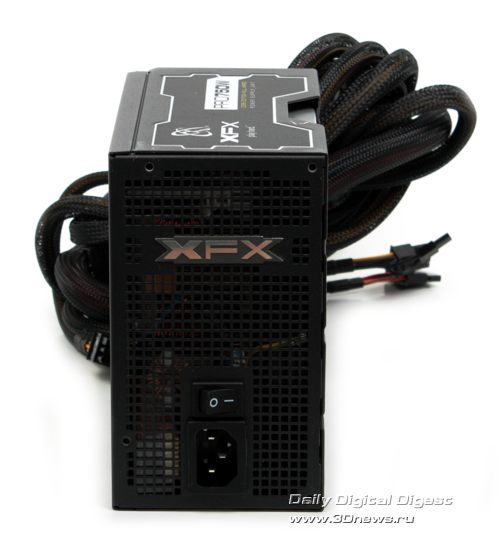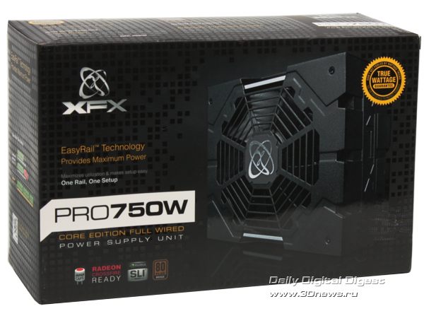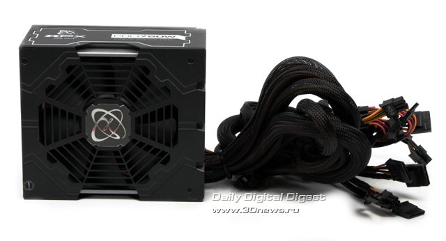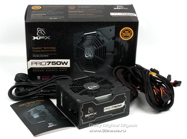 Судя по совокупности характеристик, перед нами типичный современный 750-Вт блок питания со встроенными кабелями, единой шиной питания +12В и КПД порядка 81-85%. То есть без особых звёзд с неба, но всё на достойном уровне, включая, будем надеяться, цену. ⇡#Комплект поставки. КонструкцияМногослойная розничная упаковка блока питания PRO 750W Core Edition Full Wired выполнена в чёрно-серых оттенках, кроме изображения собственно устройства на лицевой стороне указаны основные сертификации, а на обратной графически отражены основные технологии модели, включая вышеупомянутую технологию единой шины +12 В, EasyRail. ![]() ![]() Комплект поставки включает сам блок питания, силовой кабель, бумажное руководство пользователя и крепёж. ![]() Корпус PRO 750W Core Edition Full Wired выполнен в том же причудливом стиле, что и у побывавшей ранее в нашей лаборатории модели 850W Black Edition. ![]() Стальные пластины сложной формы штамповки, покрытые стойкой матовой краской, соединены внахлёст, создавая впечатление сложного многослойного дизайна, а большой 135-мм вентилятор утоплен вглубь корпуса и закрыт дополнительной декоративной решёткой с логотипом XFX. ![]() ![]() ![]() Разве что лопасти вентилятора у рассматриваемой сегодня модели обычного чёрного цвета (в отличие от кислотно-зелёного у Black Edition). Зато вентиляционные отверстия у XFX PRO 750W Core Edition Full Wired имеют фирменный профиль XFX: не привычный сотовый и даже не новомодный стрельчатый, а просто квадратный. ![]() Кабельное хозяйство БП PRO 750W Core Edition Full Wired, как явно видно из названия, полностью интегрировано, ничего съёмного в этой конструкции не предусмотрено. Полный список имеющихся в наличии разъёмов выглядит следующим образом:
