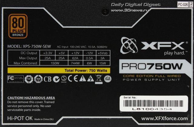 Блок питания XFX PRO 750W "бронзовой" версии Full Wired