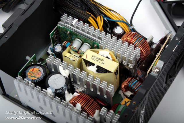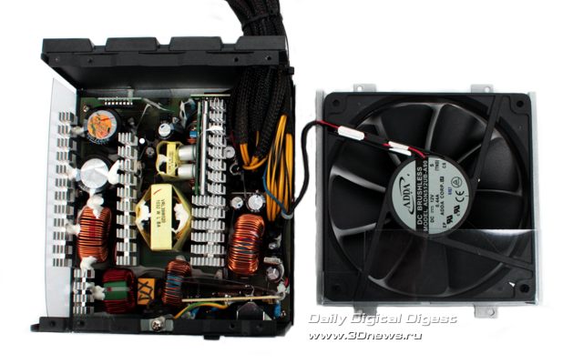 Теперь снимем кожух и ознакомимся с начинкой БП, конструкцией системы охлаждения и компоновкой модели. При разборке попутно уточним, что шасси всех блоков питания XFX имеет схожую конструкцию, и даже снятие кожуха не уменьшает жёсткость конструкции, поскольку система охлаждения крепится не к нему, как это практикуется у подавляющего большинства современных БП, а на специальной стальной рамке, которую тоже придётся снять, чтобы рассмотреть компоненты схемы. ![]() ![]() ![]() Система охлаждения модели PRO 750W Core Edition выполнена на 135-мм бесщёточном вентиляторе ADN512UB-A90 габаритами 135х135х25 мм с двухпроводным питанием. Вентилятор с номинальным напряжением питания 12 В и максимальным током 0,44 А произведен компанией ADDA. Капитан Очевидность на основании найденных в Google характеристик подсказывает, что в конструкции используются шариковые подшипники, при этом максимальная скорость вращения составляет порядка 2500 об/мин, а весит пропеллер порядка 220 г. Лопасти вентилятора примерно на треть ширины накрыты прозрачной пластиковой накладкой, призванной обеспечить формирование специфических воздушных потоков внутри корпуса для оптимального охлаждения всех элементов конструкции. ![]() Внутренняя компоновка модели PRO 750W Core Edition вновь отчётливо напомнила дизайн авторства SeaSonic. В первичной цепи использовано два включённых параллельно электролитических конденсатора ёмкостью 220 и 330 мкФ с рабочим напряжением до 400 В, отдельными платками выполнены модуль защиты и PWM. Любопытно отметить, что в спецификации этой модели на русскоязычном зеркале производителя для 750-Вт модели указано отсутствие DC-DC преобразователей для шин +3,3 В и +5 В, однако в действительности такой преобразователь в одноплатном исполнении присутствует. В заявленное отсутствие позолоты контактов поверим на слово. ![]() В целом исполнение блока питания очень качественное, особенно внушают уважение разводка выходных кабелей питания, безупречная пайка компонентов, надёжная изоляция и крепёж, а также толковое использование внутреннего объёма за счёт применения алюминиевых радиаторов со сложным профилем. ⇡#Методика тестированияСо времени наших последних статей о блоках питания методика тестирования, применяемая в нашей лаборатории, изменений не претерпела. Ознакомиться с ней в полном объёме можно, например, в этой статье. График, составляемый по результатам исследования коэффициента полезного действия (КПД) тестируемых блоков питания, содержит эталонные показатели по стандартам семейства 80PLUS, а также минимальные требования базового стандарта ATX12V версии 2.2. ⇡#Результаты тестированияЗаполняем параметры нагрузки тестового стенда согласно маркировке модели. ![]() Всегда приятно видеть стабильные результаты тестирования в автоматическом кросс-нагрузочном режиме, а результатам, показанным моделью PRO 750W Core Edition, можно только позавидовать. ![]() Результаты тестирования БП PRO 750W Core Edition в режиме статической нагрузки с ручной регулировкой, проведённые в процессе снятия характеристик для построения графика КПД, также оказались предсказуемо стабильными. ![]() Построение графика зависимости КПД от уровня нагрузки также прошло без неожиданностей, сертификация 80PLUS Bronze полностью подтвердилась на практике. ![]() Итоги Блок питания XFX PRO 750W Core Edition Full Wired на отлично прошёл все наши тесты и получает исключит