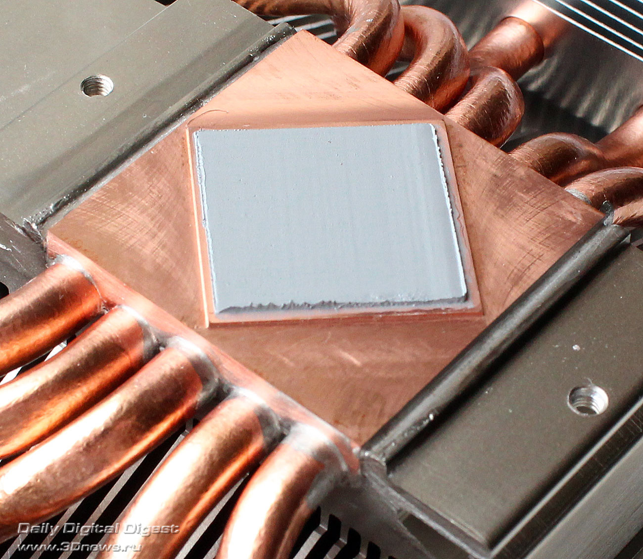 ⇡#ВведениеШвейцарская компания ARCTIC COOLING AG продолжает развивать линейку кулеров для видеокарт Accelero. Не успели мы протестировать Accelero PLUS II и получить на тестирование Accelero Xtreme 7970, как компания анонсировала универсальный Accelero Xtreme III и гибридный Accelero Hybrid. Столь завидная для многих других производителей периодичность выпуска новых видеокулеров объясняется довольно просто — Arctic делает без оговорок лучшие системы охлаждения для видеокарт, и наверняка они играют одну из главных ролей в доходах компании. Кроме того, уже первые образцы Accelero Xtreme получились удачными настолько, что существенных изменений в конструкцию кулеров этой линейки не вносится с начала 2009 года, когда появился первый Accelero Xtreme GTX 280. Спустя три года Arctic лишь оснащает базовую модель новыми креплениями, наделяя её совместимостью с современными видеокартами, а также вносит несущественные изменения в комплектацию. Посмотрим, есть ли что-нибудь новенькое в Accelero Xtreme 7970. ⇡#Упаковка и комплектацияНовинка поставляется в традиционном для Arctic пластиковом блистере с картонными вкладышами внутри, на которых обладателям этого кулера обещаны на 34 градуса Цельсия более низкие температуры графического процессора и в девять раз меньший уровень шума в сравнении с эталонным кулером AMD Radeon HD 7970: Всё это звучит и выглядит исключительно оптимистично. Как будет на самом деле, узнаем уже совсем скоро. Несмотря на компактность упаковки, в ней, помимо самого кулера, уместилось множество алюминиевых радиаторов для микросхем видеопамяти и силовых элементов видеокарты, двухкомпонентный термоклей, переходник на разъём PATA-типа, комплект крепления, решетчатая планка на заднюю панель корпуса системного блока, усилительная пластина с мягкой подкладкой и фирменная наклейка Arctic: Arctic Accelero Xtreme 7970 выпускается в Китае. На кулер предоставляется шестилетняя гарантия. Рекомендованная стоимость, традиционно высокая для продукции этой компании, составляет 97,95 доллара США. ⇡#Особенности конструкцииКак уже было сказано выше, внешне Accelero Xtreme 7970 не отличается от предыдущих версий. Всё те же три 92-мм вентилятора толщиной 10 мм в пластиковом кожухе и две секции радиатора на пяти медных тепловых трубках диаметром 6 мм, проходящих сквозь медное основание. Размеры кулера составляют 288х104х54 мм, а масса — 653 грамма. Для Accelero Xtreme 7970 заявлены предельные 300 ватт тепловой нагрузки, чего более чем достаточно для самых мощных однопроцессорных видеокарт. Радиатор состоит из 77 алюминиевых пластин размерами 92х21 мм и ещё 7 пластин размерами 60х21 мм, напрессованных на трубки с межрёберным расстоянием 1,8 мм: Толщина самих пластин не изменилась — она составляет 0,3 мм. Расчётная площадь радиатора по-прежнему равна 3070 см2. Непосредственно над теплосъёмником установлен дополнительный алюминиевый радиатор размерами 95х92 мм, рассеивающий тепло с верхней части трубок в основании кулера. Сами тепловые трубки расставлены в пластинах радиатора равномерно на расстоянии 12-13 мм друг от друга, а в основании уложены в желобки и аккуратно пропаяны: Главное отличие Accelero Xtreme 7970 от его братьев — фрезерованный квадрат на основании, который примерно на 1 мм выше самой поверхности основания. Как известно, кристалл графических процессоров Tahiti (AMD Radeon HD 7970 и HD 7950) находится чуть ниже защитной металлической рамки, поэтому для обеспечения полноцен