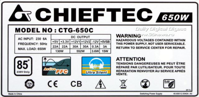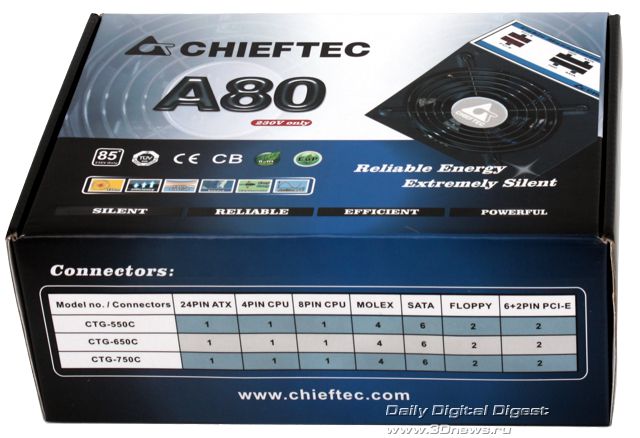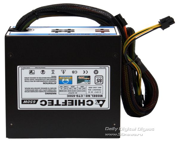 Оценивая эффективность современных компьютерных блоков питания, мы больше всего внимания обращаем на их коэффициент полезного действия (КПД) при определённой нагрузке – как правило, речь об уровнях 20%, 50% и 100%. В то же время за скобками обычно остаётся не менее важное требование, нормируемое стандартом 80PLUS. А именно — сохранение этого уровня эффективности для всех встречающихся в мировой практике вариантов питающих напряжений, то есть в диапазоне 100-240 В. Если быть ещё точнее, подтверждение нормам стандарта 80PLUS разных уровней (базовый, Bronze, Silver, Gold, Platinum и т.д.) производится для двух сетевых напряжений: 115 и 230 В. В обоих случаях нормируемый БП должен показать КПД не ниже определённого для каждой категории уровня. Впрочем, для устройств под силовые сети с более низким питающим напряжением стандарт изначально регламентирует менее высокий КПД, обычно на один процент, местами на два процента, и любой школьник знает, почему в таких цепях наблюдаются более заметные токовые потери при преобразовании, – иначе бы мы, к примеру, не строили высоковольтных линий электропередач. К чему это мы? К тому, что сегодня на испытательном стенде в лаборатории 3DNews не совсем обычный блок питания. Модель CTG-650C из новой серии А-80 от компании Chieftec интересна тем, что официально её КПД заявлен на уровне 85% и более, но… только для сетей 220-240 В. ![]() Иными словами, каким бы идеальным ни был этот блок питания, без поддержки силовых сетей 100-120 В он не может получить никакого сертификата по стандарту 80PLUS. В то же время какое дело до 100-120-В розетки покупателю из Европы или стран СНГ? В общем-то, никакого. В плюсы такого решения можно сразу записать меньшую цену за счёт менее жёстких требований к поддержке диапазона питающих напряжений, к минусам – если это можно назвать минусом — разве что отсутствие общепринятой наклейки 80PLUS. Стоит отметить, что рассматриваемая сегодня модель Chieftec CTG-650C изначально нацелена на массовый рынок доступных решений. Она представляет собой разумный выбор между двумя крайностями: покупкой корпуса с неведомым блоком питания с неизвестными характеристиками и приобретением отдельного БП в премиум-упаковке с кучей дополнительных «рюшечек». В настоящее время в серию БП Chieftec A80 входит девять моделей мощностью от 350 до 750 Вт, при этом три из них – мощностью 550, 650 и 750 Вт — имеют модульный дизайн (от остальных моделей отличаются наличием буквы С в названии). Модель CTG-650C – как раз из этого числа. В общем, пора приступать к тестированию. Начнём по традиции с характеристик, заявленных на сайте производителя.