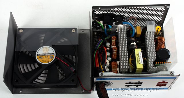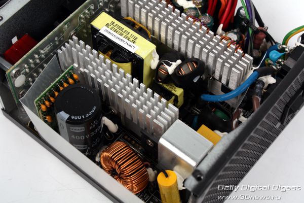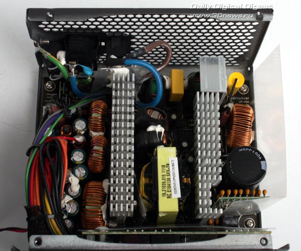 То есть в несъёмном виде выполнены только кабели, в любом случае используемые при конструировании системы, все остальные разведены модульным способом. ![]() Снимем кожух и рассмотрим внимательно конструктивное исполнение и систему охлаждения БП. ![]() Применённый в конструкции 7-лопастный 120-мм вентилятор c подшипниками скольжения имеет маркировку S1202512L и производится хорошо известной китайской компанией Globe Fan. Номинальное напряжение питания модели составляет 12 В, максимальный ток 0,18 А, максимальная скорость вращения 2000 об/мин, максимальный шум 34 дБ, максимальный воздушный поток 50 CFM, габариты 120х120х25 мм. Достаточно часто встречающаяся модель вентилятора во многих блоках питания мощностью 500-750 Вт. ![]() Внутренние воздушные потоки, как хорошо заметно на фото выше, формируются благодаря специальной накладке из прозрачного пластика, прикрывающей примерно треть поверхности лопастей. Компоновку БП нельзя назвать экстраординарной: типичная однотактная схемотехника первичного преобразования с большим электролитическим конденсатором ёмкостью 330 мкФ и рабочим напряжением 400 В, отдельная плата модуля защиты. Популярная нынче схема DC-DC-преобразователя для шин +3,3 В и +5 В не просматривается, из чего напрашивается логический вывод: высокого КПД удалось достичь традиционными средствами, сэкономив, но при этом пожертвовав лишь поддержкой неевропейских питающих силовых цепей. ![]() В плюсы конструкции можно записать тот факт, что ради снижения себестоимости производства в Chieftec всё же не пошли на ухудшение качественных характеристик выходных напряжений: все (или подавляющее большинство) фильтрующие компоненты запаяны, конструкция не выглядит "выщипанной", как это часто бывает с блоками питания OEM-серий. Разводка и экранировка выходных кабелей питания, пайка компонентов, изоляция, крепёж выполнены безупречно. ![]() ⇡#Методика тестированияСо времени наших последних статей о блоках питания методика тестирования, применяемая в нашей лаборатории, изменений не претерпела. Ознакомиться с ней в полном объёме можно, например, в этой статье. График, составляемый по результатам исследования коэффициента полезного действия тестируемых блоков питания, содержит эталонные показатели по стандартам семейства 80PLUS, а также минимальные требования базового стандарта ATX12V версии 2.2. ⇡#Результаты тестированияЗаполняем параметры нагрузки тестового стенда согласно маркировке модели. ![]() Результаты испытаний в автоматическом кросс-нагрузочном режиме показали, что CTG-650C демонстрирует стабильность во всём диапазоне нагрузок, хотя оптимальные результаты всё же показывает при большой или максимальной нагрузке ключевых каналов питания. ![]() Тестирование БП в режиме статической нагрузки с ручной регулировкой, проведённое в процессе снятия характеристик для построения графика КПД, подтвердило уже полученный результат: минимальное (один-два процента) отклонение от номинальных напряжений наблюдается при максимальной нагрузке. Более того, в процессе снятия характеристик мы кратковременно перегрузили 12-вольтные шины выше паспортных значений (в процессе эксперимента – более 700 Вт на протяжении примерно 20 минут), и даже при такой критической нагрузке полученные результаты оставались на высоте. ![]() Построенный в результате замеров график зависимости КПД от ур