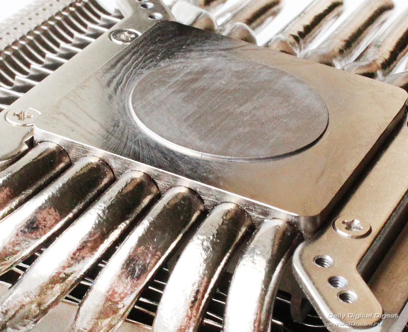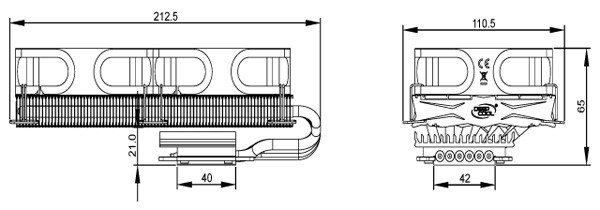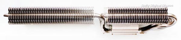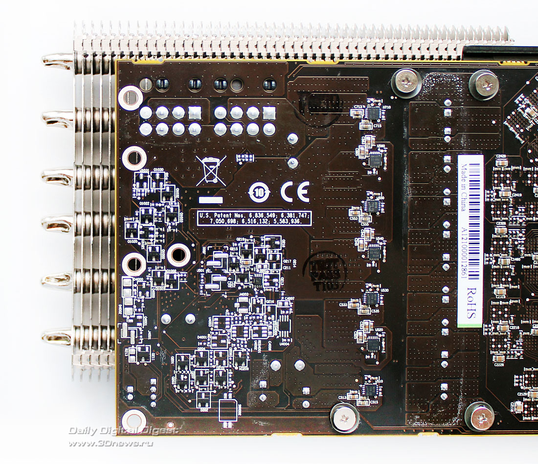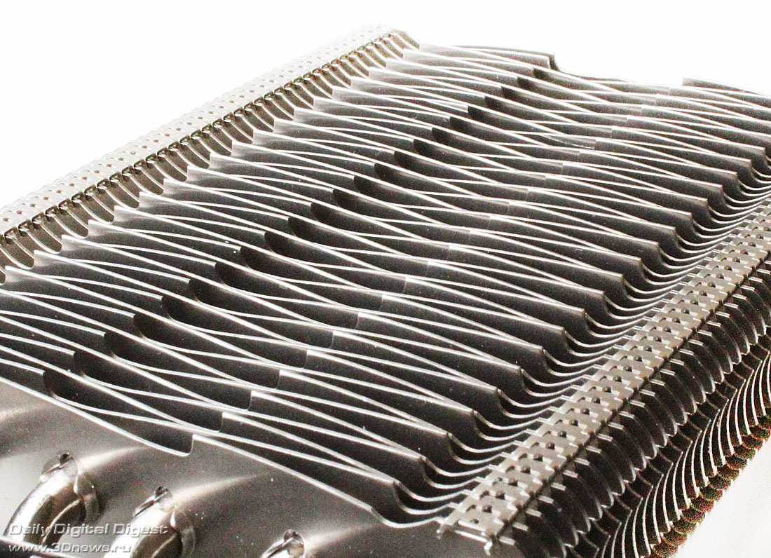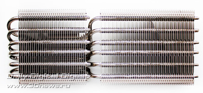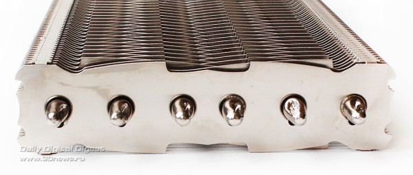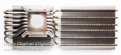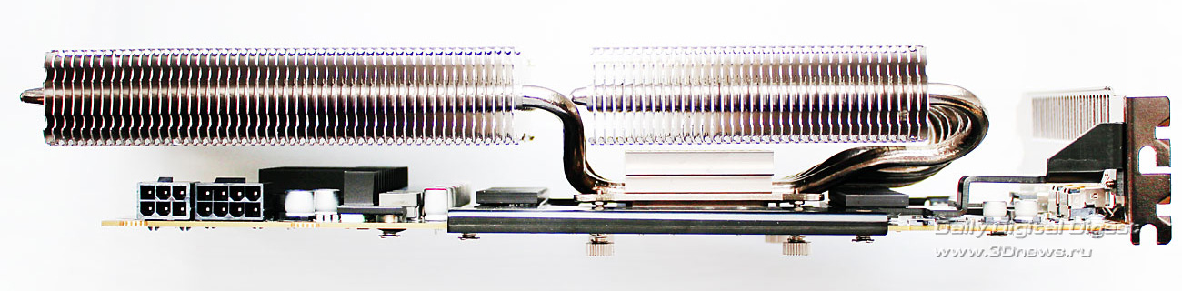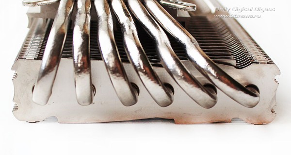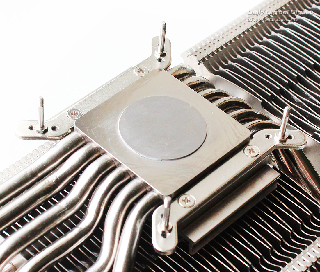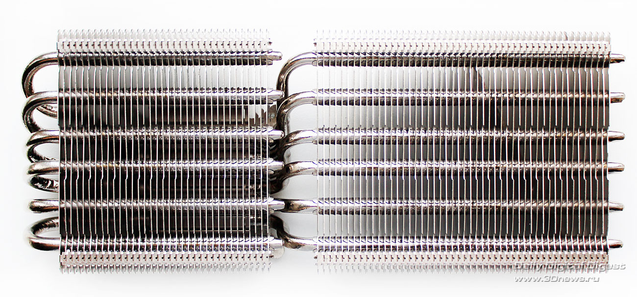 Вентиляторы в комплект поставки Deepcool Dracula не входят. Более детально весь набор компонентов Dracula можно посмотреть по следующей схеме: Кулер по-прежнему выпускается в Китае. Ранее его рекомендованная стоимость составляла 55 долларов США, но теперь по непонятным причинам она выросла до 75 долларов США, хотя ничего кардинально в его конструкции или комплектации не изменилось. Гарантийный срок — два года. ⇡#Особенности конструкцииНикелированная конструкция Deepcool Dracula состоит из двенадцати медных тепловых трубок, выходящих из медного же основания и пронизывающих две независимые секции радиатора: Трубки диаметром 6 мм выходят из основания в разные стороны двумя «пакетами», по шесть штук в каждом. Над основанием системы охлаждения установлен дополнительный тонкий радиатор. В большой секции радиатора — 53 алюминиевые пластины, а в малой — 31 пластина. Толщина алюминиевых рёбер, припаянных к трубкам с межрёберным расстоянием 2 мм, составляет 0,45 мм: Размеры радиатора равны 254х100х44 мм и более детально с ними можно ознакомиться по последующей схеме: Весит радиатор 556 грамм, что не так и много по современным меркам. Одной из его особенностей является переменная высота торцов рёбер, созданная с помощью их оригинальной формы и за счёт смещения относительно друг друга на трубках: Благодаря этому, должно снижаться сопротивление воздушному потоку вентиляторов, при этом сохраняется высокая эффективность кулера на низких скоростях. Тепловые трубки пронизывают радиатор равномерно, с расстоянием 9–11 мм друг от друга: Все места сопряжений пластин радиатора и тепловых трубок, а также трубок и основания кулера пропаяны. Конструкция прочная и не имеет даже малейших люфтов. В основании трубки лежат в желобках с расстоянием 1-1,5 мм друг от друга: Контактная поверхность основания новой ревизии Dracula имеет круглый выступ, за счёт которого кулер и контактирует с низко посаженными кристаллами новых графических процессоров AMD. При этом прежняя зеркальная обработка исчезла, а её место заняла весьма посредственно обработанная поверхность: Ладно хоть, к её ровности сложно предъявить какие-либо претензии, отпечаток на графическом процессоре AMD «Tahiti» получился идеальным: Кстати, в подтверждение того, что заявление о двенадцати тепловых трубках Dracula — не просто маркетинговый ход, приведём фото разобранного основания радиатора с одного их китайских сайтов: Действительно трубок двенадцать. Правда, сложно сказать, эффективнее ли такая конструкция, чем если бы через основание просто проходили шесть тепловых трубок. По крайней мере, пайка здесь очевидна. ⇡#Cовместимость и установка на видеокартуПроцедура установки Deepcool Dracula на любую из поддерживаемых кулером видеокарт предельно проста. Для того, чтобы определить, какие из монтажных планок приворачивать к основанию кулера и в какие отверстия вворачивать шпильки крепления, можно воспользоваться следующим чертежом: ![]() Такое обилие монтажных отверстий на креплениях Dracula делает этот кулер максимально универсальным, а его совместимость с видеокартами может быть ограничена размерами или какими-то оригинальными печатными платами с нестандартным расположением компонентов. Для закрепления радиатора на графическом процессоре видеокарты используются шпильки с резьбой (их несколько вариантов в комплекте), которы