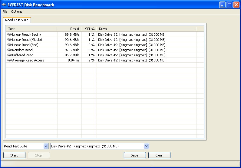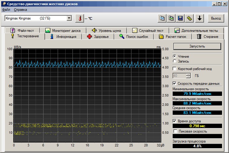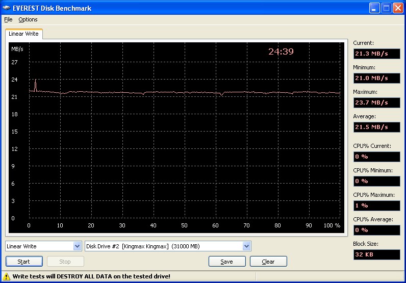 Для тестирования использовались программы HD Tune Pro 5.0 и Lavalys EVEREST Ultimate Edition 5.5. Результаты представлены ниже. Тестирование скорости чтения накопителя Kingmax UD-09 в программе Lavalys EVEREST Ultimate Edition Тестирование скорости чтения накопителя Kingmax UD-09 в программе HD Tune Pro Тестирование линейной скорости записи накопителя Kingmax UD-09 в программе Lavalys EVEREST Ultimate Edition Порядка 90 Мбайт/с при чтении и не менее 20 Мбайт/с при записи — для флешки это очень хорошие результаты, которые удовлетворят потребности большинства пользователей в скоростном обмене данными. Не нужно идти заваривать чай, копируя с такого накопителя современный видеофайл высокой чёткости или небольшую коллекцию аудиозаписей. ⇡#ВыводыКак мы и предполагали в самом начале, флеш-накопитель Kingmax UD-09 представляет собой крепкого середнячка в своём классе по производительности, но по такому параметру, как цена-качество, бьёт рекорды. При аналогичных показателях скорости конкуренты нашей новинки стоят в 1,5-2 раза дороже. Так, за новые модели Apacer AH352 и Kingston DataTraveler Elite 3.0 в версиях 32 Гбайт просят соответственно 2 000 и 1 800 рублей, в то время как за новинку Kingmax нужно заплатить чуть больше тысячи. При этом вы получаете высокоскоростной накопитель со стильной внешностью и пятилетней гарантией. Если Вы заметили ошибку — выделите ее мышью и нажмите CTRL+ENTER.
