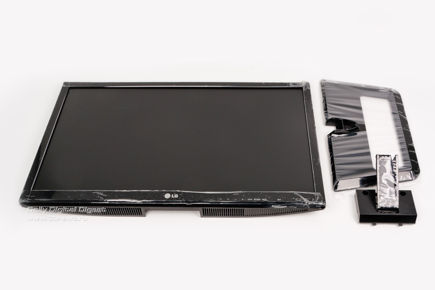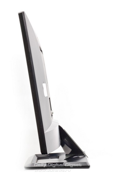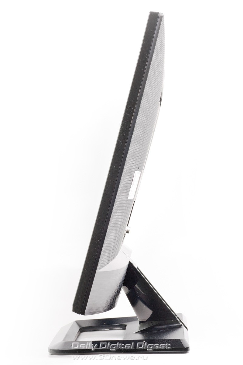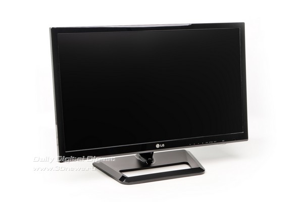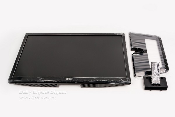 LG M2752D — комплект поставки Комплектация средняя, однако если учесть, что LG M2752D — это в первую очередь телевизор, то кабеля D-Sub to D-Sub здесь могло и не быть. Конечно, хотелось бы видеть еще и кабель HDMI to HDMI, но это уже на усмотрение производителя. На подавляющем большинстве телевизоров и мониторов присутствует наклейка с основными достоинствами устройства, где также указан перечень применяемых технологий. Еще лет десять назад этот цветастый стикер был чем-то сродни заворачиванию пульта дистанционного управления в полиэтиленовый пакет — то есть элементом обязательным. Сегодня же эта наклейка, как правило, отрывается и выбрасывается вместе с упаковочными материалами. Так вот, компания LG даже в такой мелочи пошла навстречу пользователю — стикер вложен в инструкцию по эксплуатации, чтобы каждый сам решил, стоит его наклеивать на монитор или использовать как-нибудь иначе. Уверены, что обязательно найдутся желающие украсить им, например, холодильник. При сборке необходимо сначала установить основание на опору, и уже затем всю эту конструкцию присоединить непосредственно к панели, для чего обязательно понадобится отвертка. Дальше достаточно выставить комфортный угол наклона дисплея — и можно приступать к работе. LG M2752D — составные части конструкции ⇡#Конструкция, сборкаДизайн модели — наитипичнейший для современного телевизора, то есть предельно лаконичный. В принципе, такой подход полностью оправдывает себя, потому и используется годами. Действительно, ведь в этом случае ничего не отвлекает от работы. На черном глянце передней панели присутствуют лишь хорошо различимый логотип фирмы, надписи органов управления и едва заметный сенсор пульта дистанционного управления. Что касается видеовходов, то, как мы уже упоминали, здесь царит небывалое разнообразие. При желании можно подключить даже видеомагнитофон! Ну и какой же телевизор обходится без антенного разъема? Разумеется, здесь он тоже присутствует. К сожалению, блок питания внешний, это не очень удобно. По всей видимости телевизионная начинка просто не оставила для него места. Кроме того, здесь присутствуют два аудиоразъема, которые позволяют не только воспроизводить звук через встроенные колонки (в случае использования аналоговых видеоинтерфейсов), но и подключить более качественную внешнюю акустику, а также наушники. Стоит отметить наличие одного порта USB: его нельзя использовать в качестве разветвителя при работе с компьютером, зато в него всегда можно засунуть флешку и посмотреть какой-нибудь фильм при помощи встроенного в телевизор медиаплеера. Опора, к сожалению, достаточно простая — она обладает лишь одной степенью свободы. Регулировка осуществляется путем наклона панели вперед и назад. Стоит отметить, что шарнир довольно тугой — для того чтобы изменить положение телевизора, приходится прикладывать значительные усилия. Вилка двухжильного шнура питания загнута под прямым углом. Подобное решение уже встречалось нам в модели Samsung S27A850. Такой подход не только позволяет подключить монитор в полностью занятый блоками питания удлинитель-«пилот», но и продлить срок эксплуатации шнура. Все органы управления сгруппированы в правой нижней части экрана, и все они сенсорные. К сожалению, встроенной подсветки кнопок нет, и это не лучшим образом сказывается на управлени