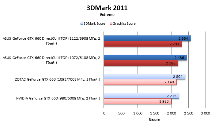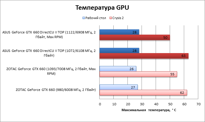 ⇡#Разгон, температура, энергопотреблениеПодняв до максимума лимит энергопотребления карты (Power Target) и включив систему охлаждения на полные обороты, мы смогли увеличить и без того высокую базовую частоту GPU (1072 МГц) еще на 50 МГц, получив в результате 1122 МГц. Для сравнения: ZOTAC с референсной PCB позволил разогнать GPU только до 1093 МГц, что лишь немногим выше, чем штатная тактовая частота у ASUS GTX 660 DirectCU II TOP. Видеопамять разогналась со штатных 6108 до 6908 МГц. Система охлаждения на максимальных оборотах создает заметный шум, но в штатном режиме довольно тихая. По энергопотреблению ASUS GTX 660 DirectCU II TOP в нашем бенчмарке оказался на 21 Вт прожорливей карты на референсной PCB. А вот дополнительный разгон лишь незначительно увеличил этот результат. ![]() В штатном режиме система охлаждения карты, несмотря на превосходящий размер, не более эффективна, чем компактный кулер ZOTAC GeForce GTX 660. С вентиляторами на полной скорости температура GPU резко снижается. ![]() ⇡#Производительность3DMark 2011 3DMark показывает, что карта с референсной PCB даже при максимальном разгоне не достигает уровня ASUS GTX 660 DirectCU II TOP, работающей на штатных частотах. Разгон самой карты ASUS дает еще один заметный скачок баллов. ![]() ![]() Игровые тесты + Unigine Heaven 2 Эффект от заводского разгона ASUS GTX 660 DirectCU II TOP меняется от игры к игре. Заметный прирост фреймрейта по сравнению с референсными частотами наблюдается в Crysis 2, DiRT 3 и Call of Duty: Modern Warfare 3. Но нельзя не отметить, что в абсолютных показателях разница укладывается в 8 FPS в разрешении 1920х1080. Другие игры на повышенные частоты отреагировали вяло. Разгон вручную добавил еще два-четыре FPS в каждом бенчмарке. Но превосходство над разогнанной картой ZOTAC на референсной PCB несущественно с практической точки зрения. Кое в каких тестах ZOTAC даже чуть быстрее, что, скорее всего, объясняется погрешностью измерения. ![]() ![]() ⇡#ВыводыASUS GeForce GTX 660 DirectCU II TOP — одна из самых мощных реализаций GeForce GTX 660 на рынке. Ее неоспоримые достоинства — надежная PCB и эффективная система охлаждения. По умолчанию на карте установлена частота GPU, которая доступна для моделей на референсной PCB и без отбора кристаллов лишь при разгоне, близком к предельному. При этом у GeForce GTX 660 DirectCU II TOP остается существенный задел для разгона вручную. Но следует признать, что, несмотря на старания инженеров ASUS, польза от разгона GTX 660 не всегда соответствует приросту частоты. Так что выбирать 660-ю производства ASUS стоит скорее за теоретическую надежность, которую, к сожалению, никак не проверишь.