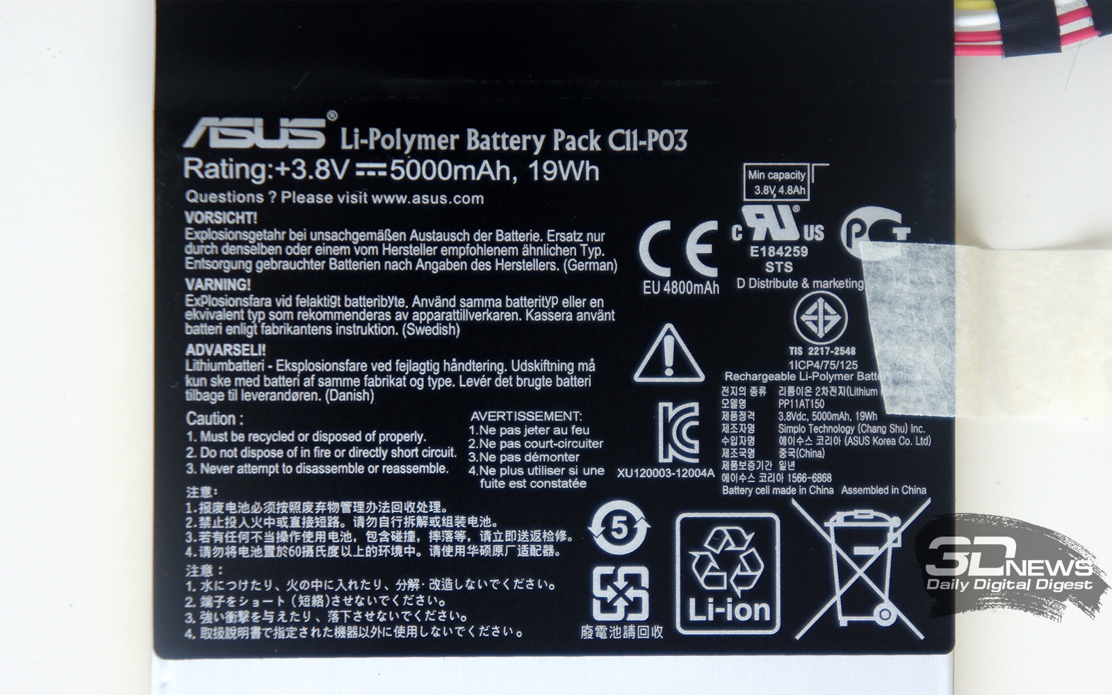 Наиболее важные детали все же пришлось демонтировать, дабы рассмотреть их обратную сторону. Скажем, на задней стенке батареи имеются ее подробные характеристики, которые, впрочем, мы уже успели привести выше. Напомним, емкость составляет 19 Вт*ч (3,8 В / 5000 мА*ч).