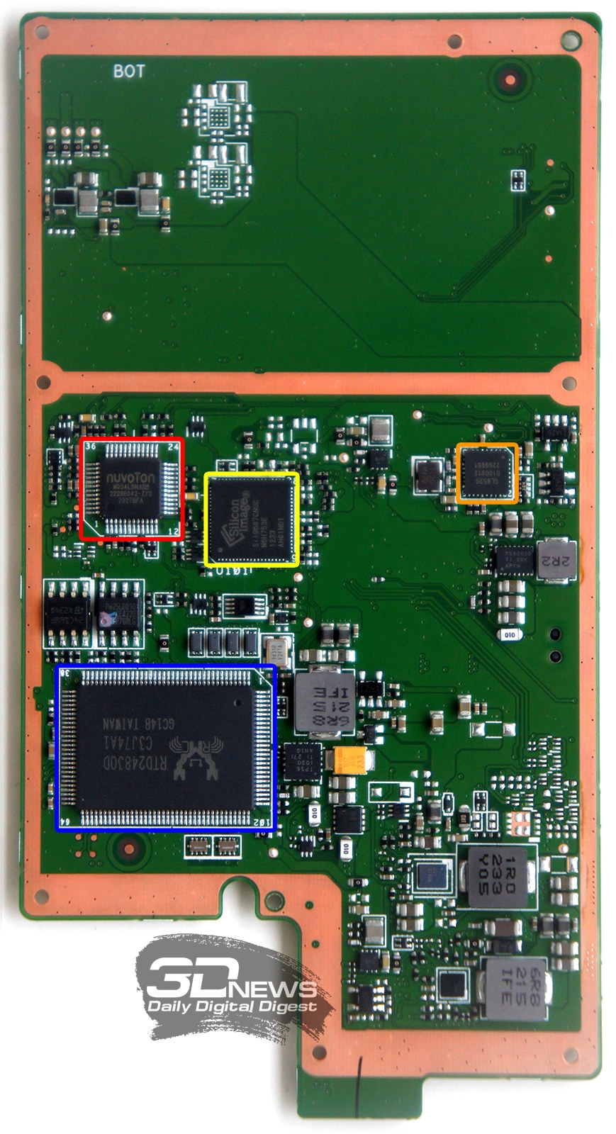 Все микросхемы расположены на тыльной стороне. Их заметно больше, чем мы ожидали. На борту есть даже пусть не самый мощный, но вполне настоящий ARM-процессор.