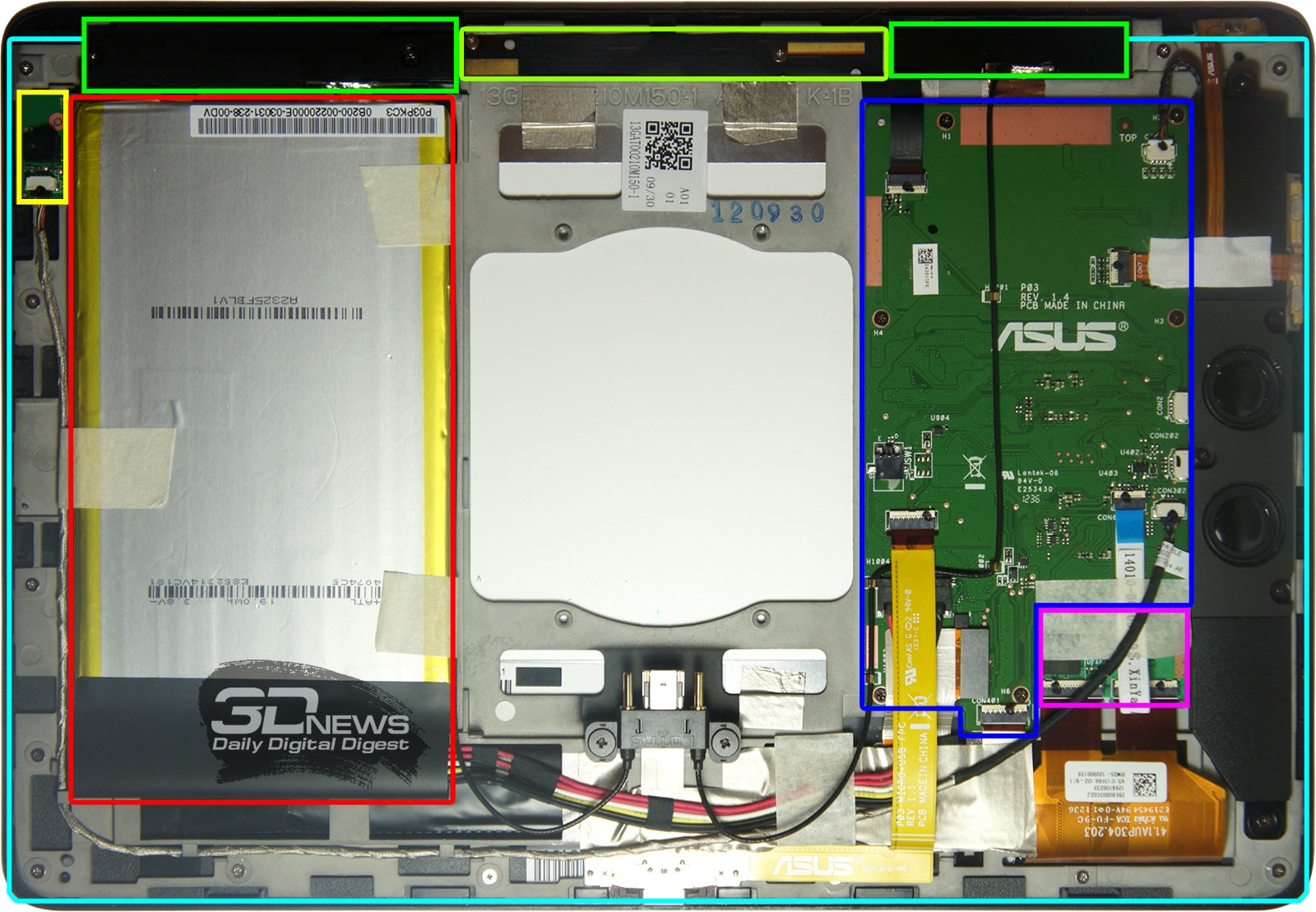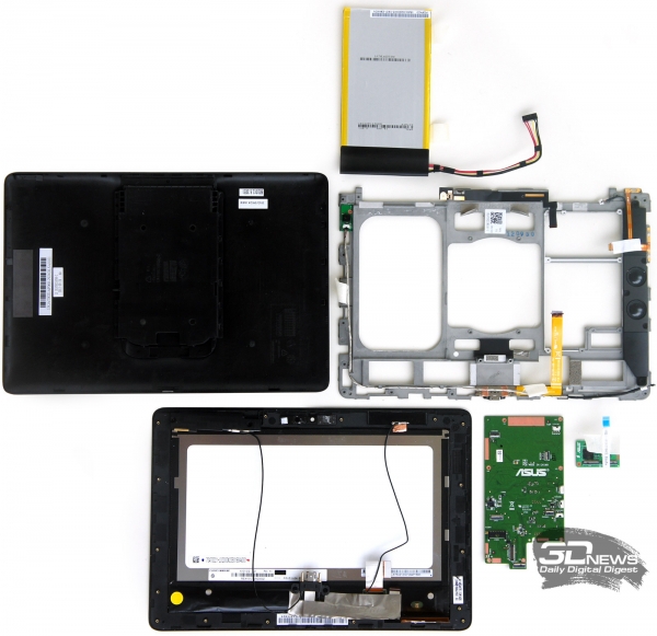 Примерно по трети пространства внутри корпуса занимают аккумуляторная батарея, материнская плата и пустота по центру – в том месте, где на спину планшета крепится смартфон.