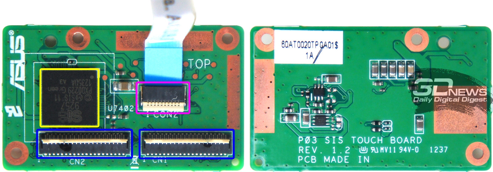 Контроллер сенсорной панели зачем-то распаян на отдельной небольшой плате. Даже если забыть об огромных пустошах в верхней части материнской платы, этого бы хватило, чтобы наглядно продемонстрировать: конструкторы совершенно не старались сэкономить пространство внутри корпуса.