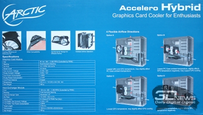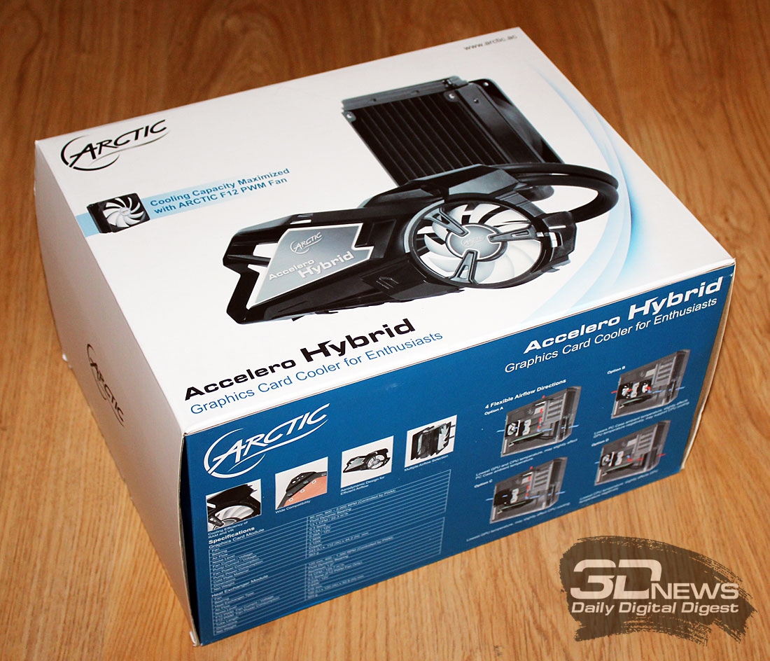 ⇡#ВведениеНовая система охлаждения ARCTIC Accelero Hybrid являет собой комбинацию жидкостного и воздушного охлаждения, построенную на известной всем платформе Asetek. В принципе, ничего кардинально нового инженеры швейцарской компании ARCTIC придумывать не стали, дополнив охладитель некоторыми уже имеющимися в их ассортименте компонентами. Интерес заключается в том, что Accelero Hybrid предназначена вовсе не для центрального процессора, как это можно было предположить, а для самых производительных и горячих видеокарт класса Hi-End. Давайте проверим, насколько удачной оказалась новинка и чем она нас с вами может впечатлить, а чем, быть может, и разочаровать. ⇡#Технические характеристики и рекомендованная стоимость