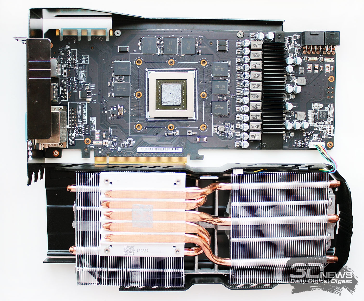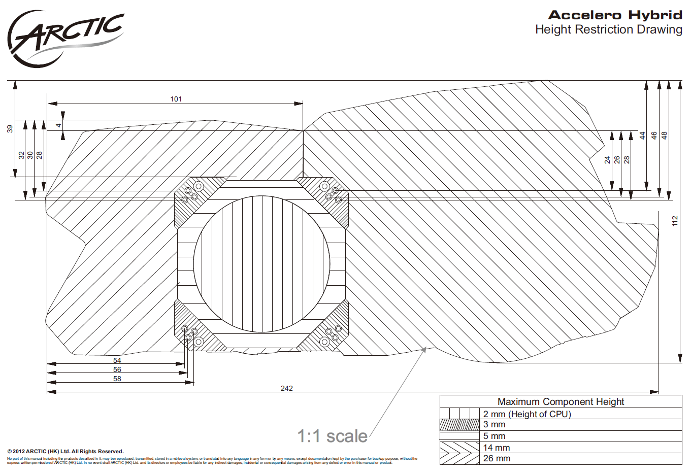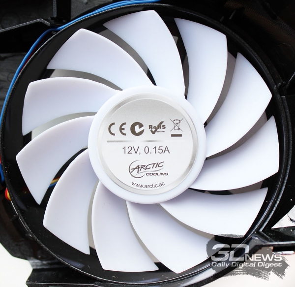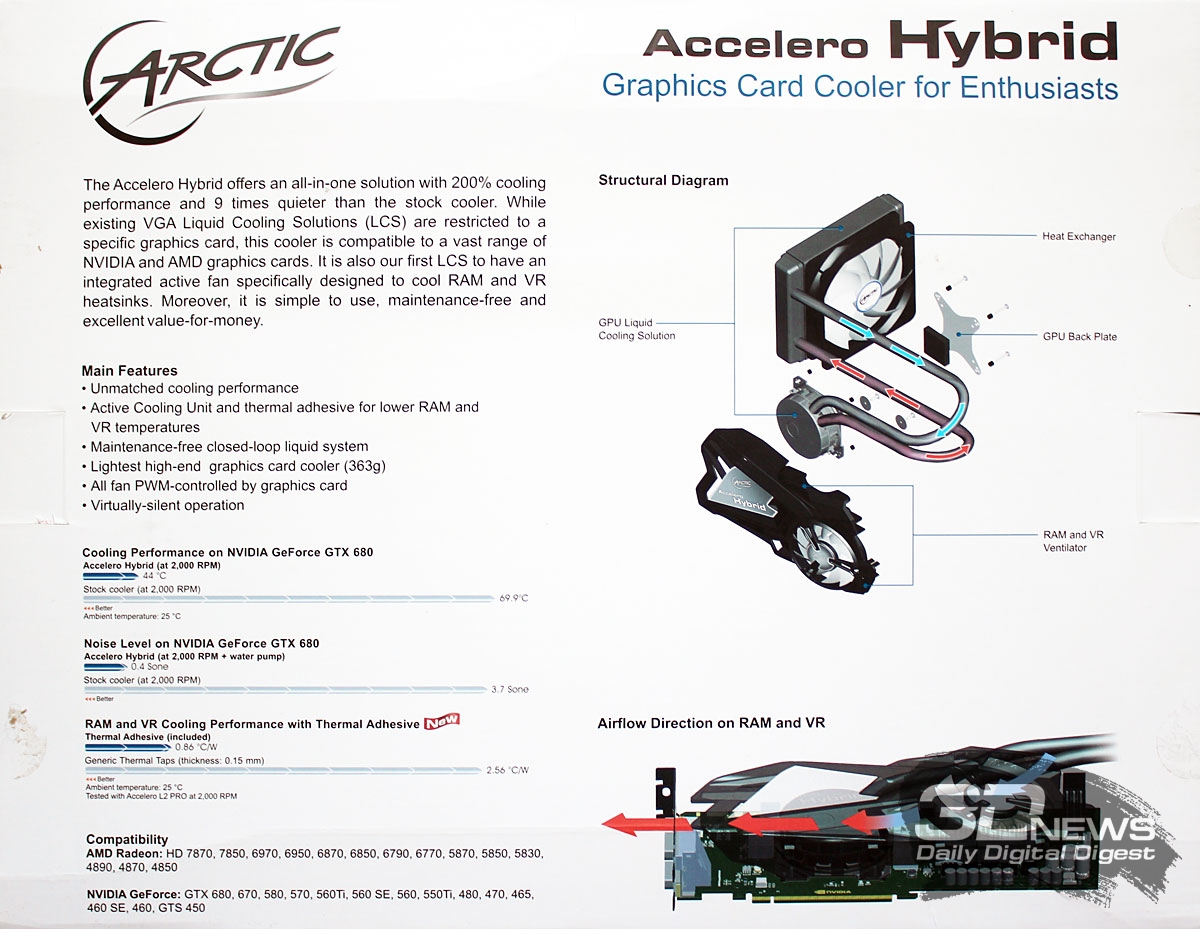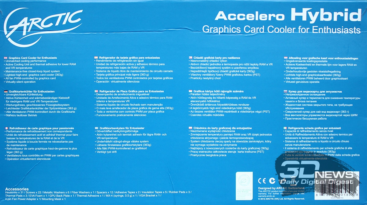 ⇡#Упаковка и комплектацияARCTIC Accelero Hybrid запечатана в большую картонную коробку с изображением самой системы на лицевой стороне: По информации на боковых и обратной сторонах можно узнать практически всё об этом кулере и даже ознакомиться с четырьмя возможными вариантами его установки в корпус системного блока: Внутри картонной оболочки находится ещё одна упаковка из гофрокартона с отсеками под кулер и аксессуары, закрытая пластиковой крышкой: В последнюю плотно вставлены алюминиевые радиаторы трёх различных типов, шприц с высокоэффективной термопастой ARCTIC MX-4 и та часть кулера, которая устанавливается на видеокарту: Набор аксессуаров довольно обширный — он включает в себя всё необходимое для сборки и установки кулера на видеокарту и в корпус системного блока, в том числе инструкции: Есть в числе компонентов Accelero Hybrid и термоклей, и даже термопрокладки. Разработанная в Швейцарии система выпускается в Китае и стоит 179,9 доллара США. Гарантия — 2 года. ⇡#Особенности конструкцииС первого взгляда на компоненты системы жидкостного охлаждения Accelero Hybrid становится понятно, что перед нами всё та же популярная платформа Asetek 570LC с узким радиатором, которую мы изучали год назад на примере системы Antec KÜHLER H2O 620: Система проста до безобразия: она состоит из помпы с медным водоблоком, двух гибких шлангов длиной 416 мм и алюминиевого радиатора. Радиатор самый обычный, размерами 150х120х27 мм и массой всего 330 грамм: 11 плоских трубок, между которыми находится алюминиевая гофролента, обеспечивают теплообмен, а хладагент на основе пропиленгликоля движется по трубкам от водоблока с помпой к радиатору и обратно: Компактная помпа высотой всего 28 мм с водоблоком в основании перекачивает жидкость от графического процессора к радиатору. Производительность её традиционно не указана в характеристиках, но мы не думаем, что её значение сможет нас впечатлить. Основание ровное, однако обработано оно весьма посредственно. Керамический подшипник помпы должен обеспечить ей 50 000 часов непрерывной работы. Ещё одним компонентом ARCTIC Accelero Hybrid является пластиковый кожух с 80-мм вентилятором, который устанавливается непосредственно на лицевую сторону видеокарты и предназначен для охлаждения её силовых элементов и модулей памяти: Конструкция его также очень проста, а 80-мм вентилятор оснащён PWM-управлением и может вращаться со скоростью от 900 до 2000 об/мин: В свою очередь, на радиатор устанавливается 120-мм вентилятор ARCTIC F12 PWM с чёрной рамкой и белой девятилопастной крыльчаткой: Эта же модель встречалась и на протестированном нами не так давно процессорном кулере ARCTIC Freezer i30. Она вращается в скоростном диапазоне от 400 до 1350 об/мин, максимальный воздушный поток заявлен на отметке 74 CFM, а уровень шума не должен превышать 0,3 сона. Электрические характеристики вентилятора приведены на наклейке статора: ![]() Здесь, в общем-то, ничего особенного: 12 В, 0,22 А и 2,64 Вт. Сколько прослужит его гидродинамический подшипник — в характеристиках не указано. ⇡#Совместимость и установка на видеокартуПеречень совместимых с ARCTIC Accelero Hybrid видеокарт вы уже видели выше в таблице, он достаточно обширен. Однако это далеко не всё, что может помочь при установке. Самое главное — размеры устанавливаемого на графический процессор модуля водоблока и помпы, а также самого пластикового кожуха. В помощь поль
