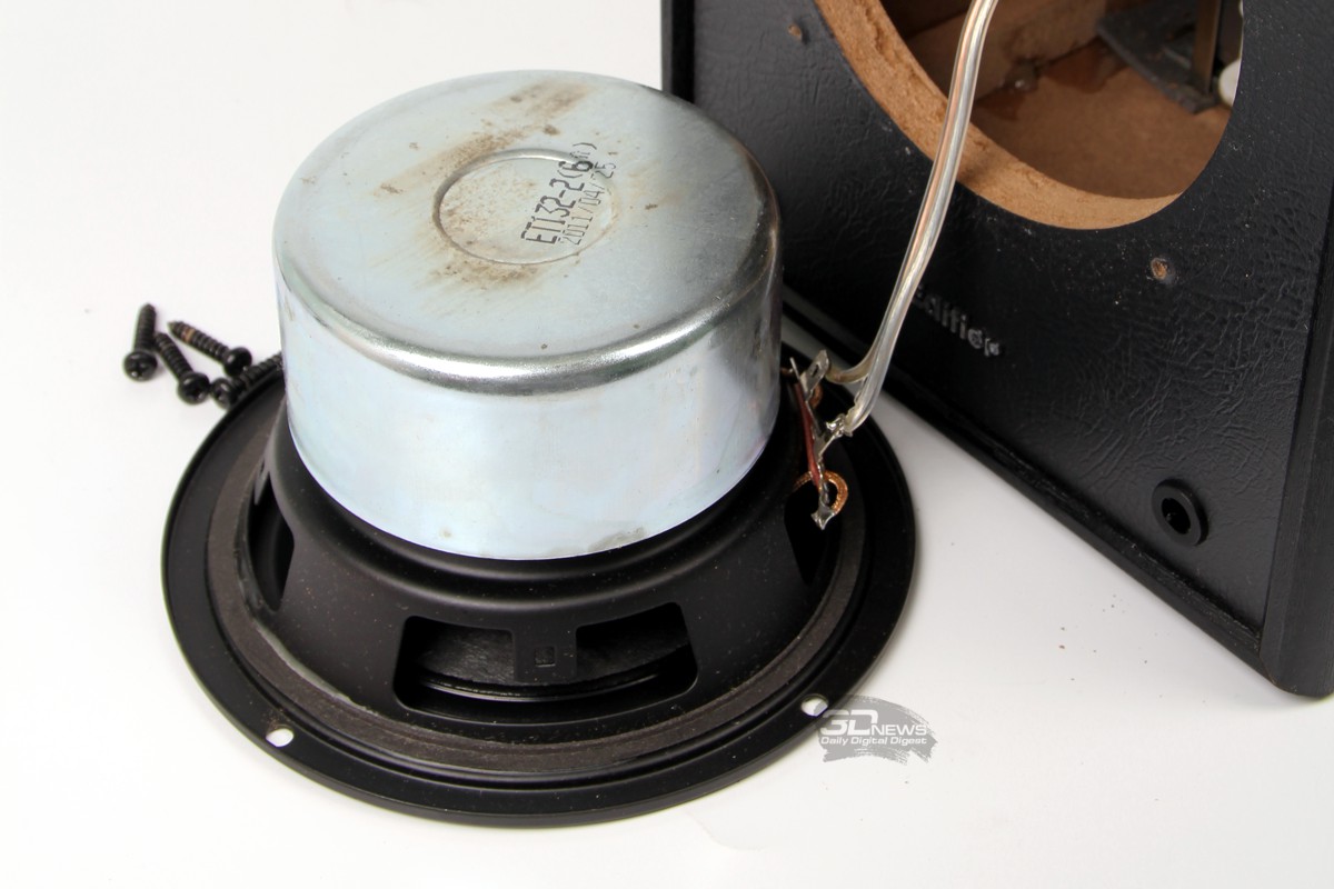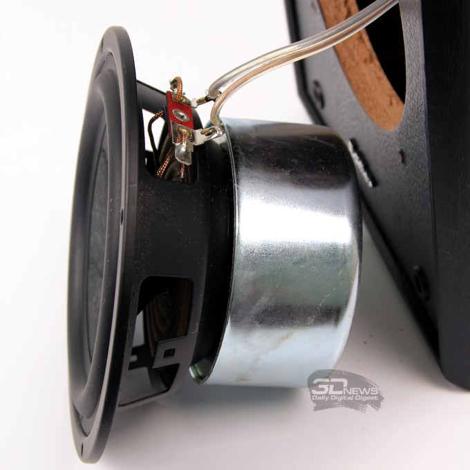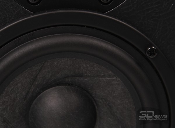 Именно из-за этой жёсткости низкочастотный диапазон начинается только с 46 Гц, но зато такое исполнение позволяет значительным образом избавиться от резонансных пиков на «изломных» участках АЧХ. Сопротивление динамика составляет 6 Ом.