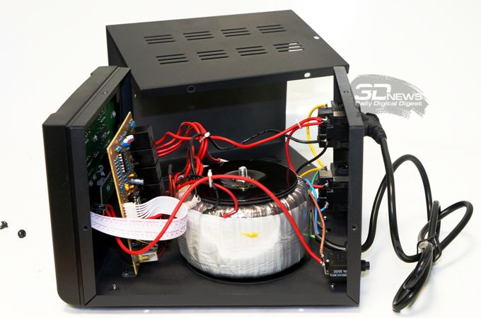 Прибор относится к классу автотрансформаторных преобразователей со ступенчатым регулированием напряжения путём переключения отводов силового автотрансформатора с помощью силовых реле. В классическом варианте исполнения подобных устройств можно встретить традиционный трансформатор, набранный из ш-образных пластин. Тороидальный трансформатор – относительная редкость и приятная неожиданность.
