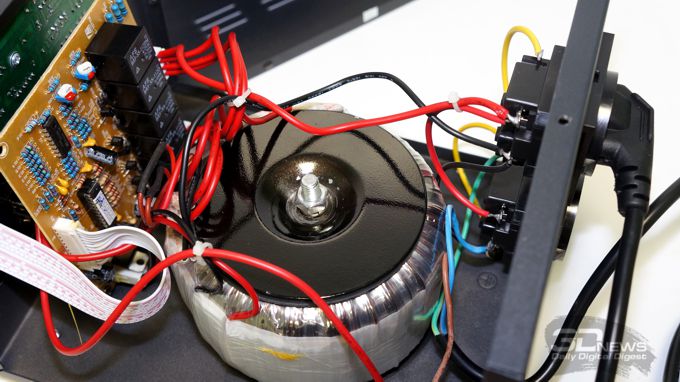 Так и есть: перед нами старый, добрый тороидальный трансформатор, составляющий основной вес устройства и играющий в данном случае ключевую роль в формировании стабильного выходного напряжения.