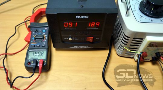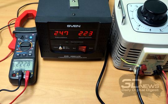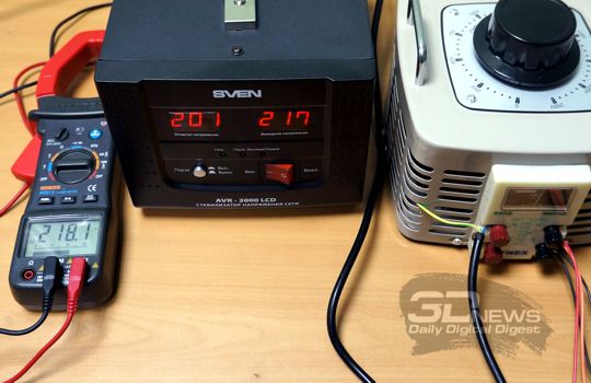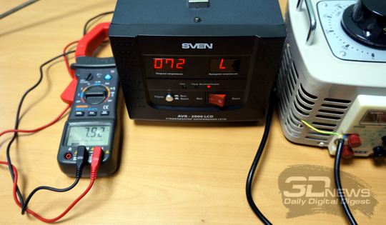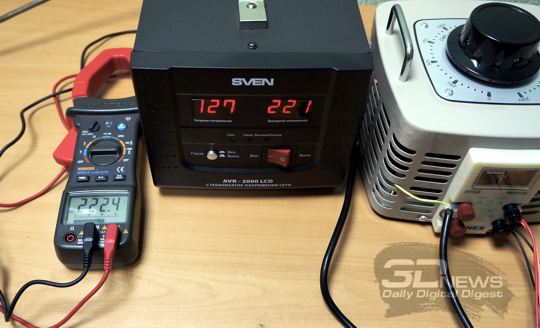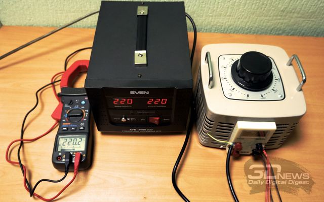 Для тестирования столь специфического устройства, которым является стабилизатор сетевого напряжения SVEN AVR-2000 LCD, особенно со столь широким заявленным диапазоном входных напряжений силового питания, был привлечён классический лабораторный автотрансформатор (ЛАТР) с регулировкой выходного напряжения переменного тока в диапазоне 0-250 В, при этом заведомо достаточной мощности — 2 кВ*А. Нагрузки для получившейся системы были выбраны разные: сначала это был тривиальный электрический масляный радиатор, затем, когда опасение что-нибудь спалить прошло, в дело пошли мощный настольный компьютер и ноутбук класса DTR с постоянным сетевым питанием.