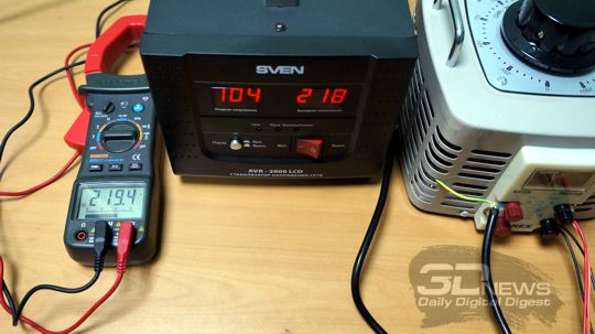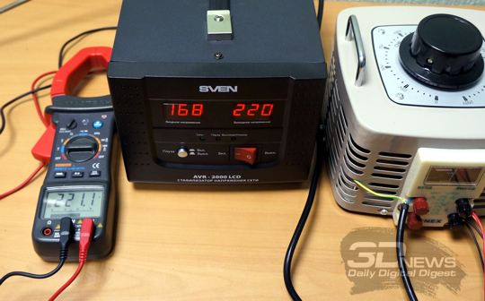 Результаты, для большей наглядности, мы приводим в виде фотографий, на которых одновременно видны установки ЛАТРа, показания входного и выходного напряжений по версии цифровых индикаторов стабилизатора SVEN AVR-2000 LCD, а также измерительных клещей.
