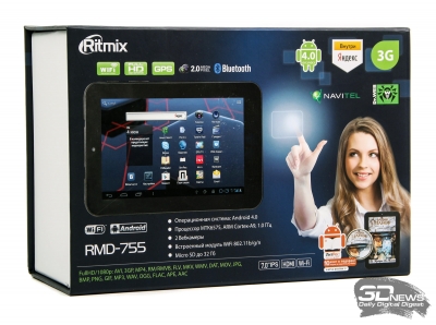 Планшетные компьютеры достигли такого уровня развития, что практически любой из представленных на рынке способен совместить в себе сразу несколько устройств. Например, новинка от Ritmix вполне успешно сочетает в себе сразу три гаджета: непосредственно планшет, мобильный телефон и автомобильный навигатор. Если судить по комплекту поставки, RMD-755 создавался именно как планшет-навигатор. И в этом нет ничего удивительного: многие вендоры сейчас делают ставку на устройства подобного класса в бюджетном сегменте. Компания Ritmix одна из первых представила такой гаджет, поэтому её планшет заслуживает особого внимания и тщательного тестирования. ⇡#КомплектацияЗаводская упаковка Ritmix RMD-755 Когда мы в первый раз увидели еще запечатанную коробку с новеньким гаджетом, нас хватил лёгкий шок: уж очень она была большой для компактного семидюймового планшета. На всех её сторонах продублированы изображения устройства и указаны его основные технические и функциональные возможности, да так, что на коробке практически не осталось свободного пространства. Стандартный комплект поставки Ritmix RMD-755 Как выяснилось, упаковка Ritmix RMD-755 оказалась такой объемной неспроста: у гаджета фантастически богатая комплектация, включающая в себя большинство всех мыслимых аксессуаров для планшета. Комплект поставки включает в себя: