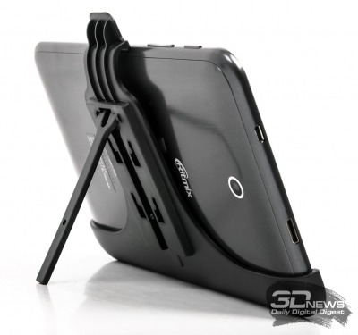 Аксессуары, поставляющиеся вместе с Ritmix RMD-755 ⇡#Внешний видЛицевая сторона Ritmix RMD-755 С виду, в частности с лицевой стороны, все планшеты достаточно сильно друг на друга похожи. Вот и наш сегодняшний испытуемый не обзавелся какими-либо отличительными чертами. Впрочем, немного необычной может показаться разная ширина рамки для хвата: если держать планшет в горизонтальной ориентации, с правой стороны её ширина составит более двух сантиметров, в то время как для трех остальных сторон этот показатель не достигает и полутора. Вроде мелочь, а такое различие легко заметно даже невооруженным глазом. В левой части панели расположен глазок 0,3-Мп фронтальной веб-камеры. Боковые торцы и задняя сторона Ritmix RMD-755 Элементы управления и интерфейсы вполне удобно разбросаны по всем боковым сторонам гаджета. Как и в большинстве планшетных ПК, кнопка включения/блокировки устройства и «качелька» регулировки громкости занимают положенное им место на верхней грани. Видеовыход miniHDMI и интерфейс microUSB находятся на левом торце планшета. На противоположную грань помещены прорези стереодинамиков и комбинированный 3,5-мм аудиовход/выход. На нижнем торце, под пластиковыми заглушками, спрятались слоты для SIM- и microSD-карточек. Задняя панель Ritmix RMD-755 пластиковая, шершавая и текстурированная. Благодаря этому планшет удобно лежит в руках и не норовит из них выскользнуть. На ней расположены глазок основной, двухмегапиксельной камеры, логотип вендора, серийный номер устройства и некоторые технические сведения. Крышка несъемная, её покрытие вполне устойчиво к мелким царапинкам, но отпечатки пальцев оставляет на себе с большой охотой. Собрано устройство качественно, но пару недочетов от наших внимательных глаз скрыть все-таки не удалось: при внешнем воздействии пластик ожидаемо поскрипывает и прогибается, а на экран выползают характерные цветные разводы. Зато сам корпус достаточно надежен и на вид внушает доверие: если относиться к гаджету бережно, он должен жить долго и счастливо. ⇡#Технические характеристики