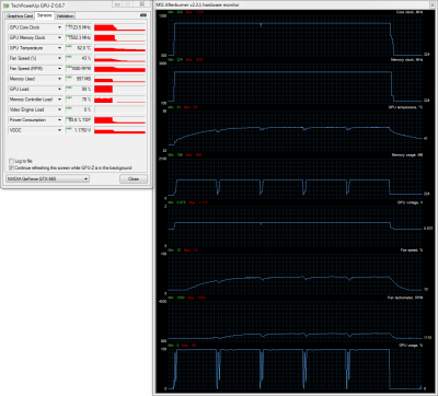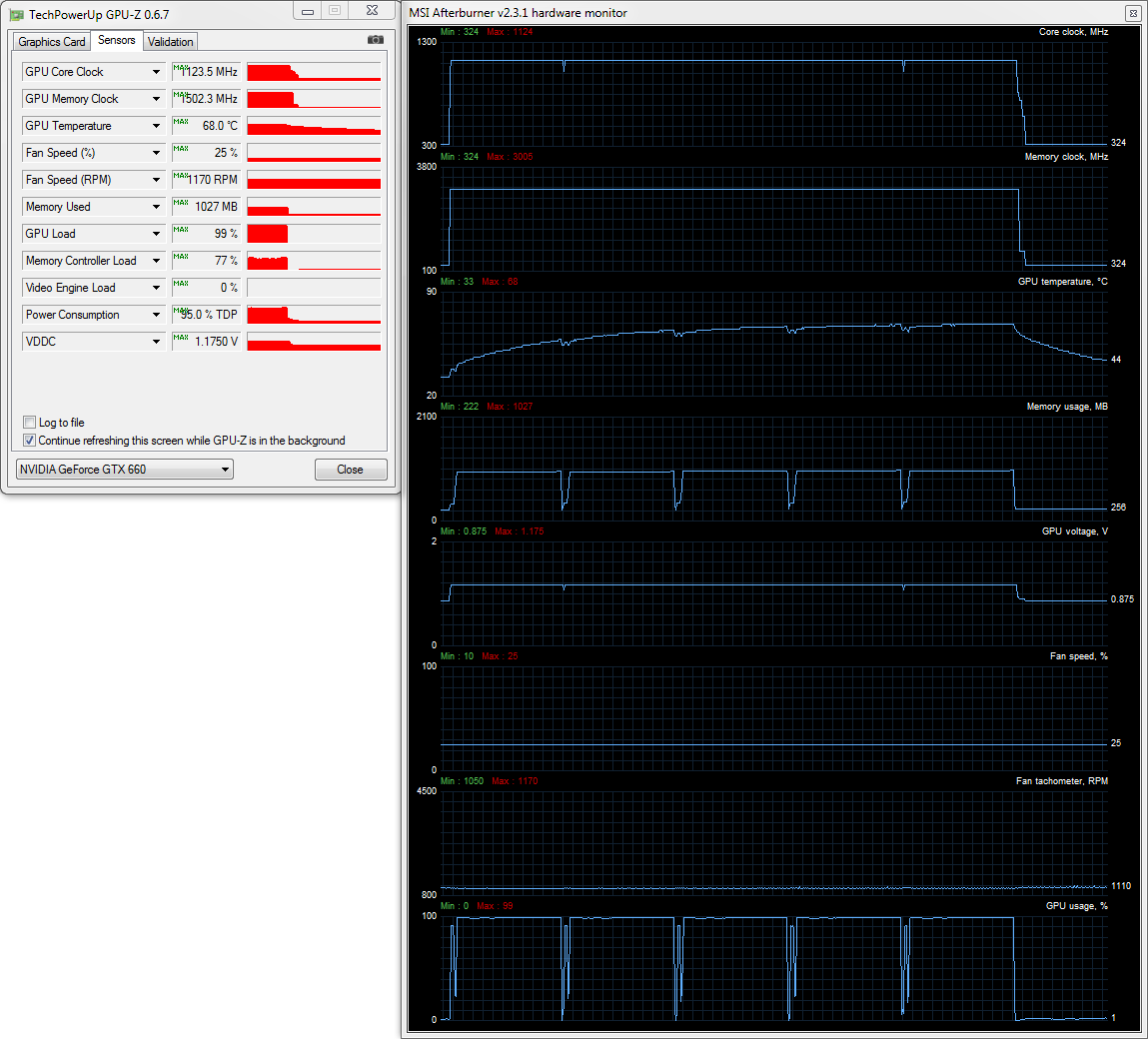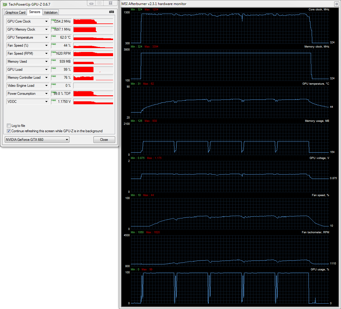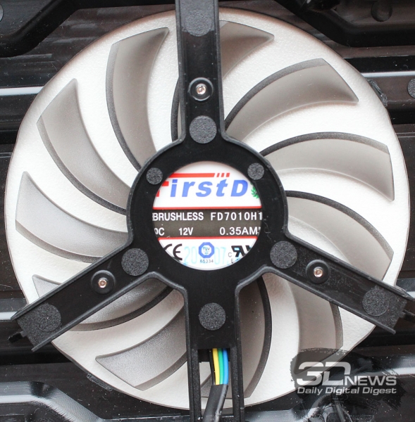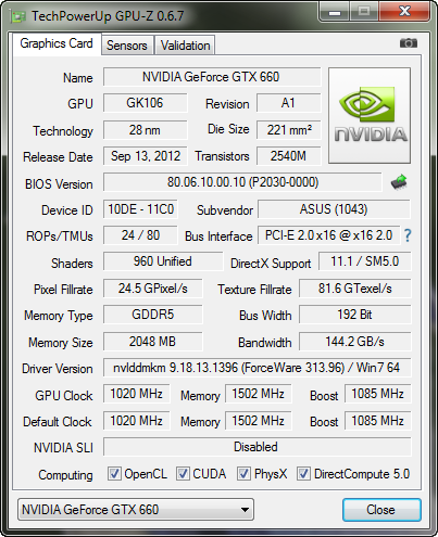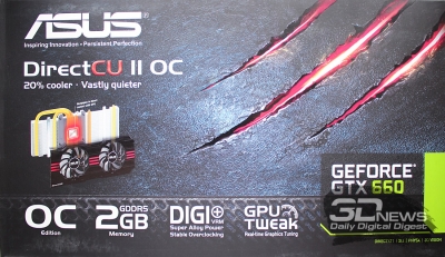 ⇡#Упаковка и комплектацияВидеокарта ASUS GeForce GTX 660 DirectCU II OC поставляется в большой и очень красивой коробке со следами когтей на лицевой стороне (напоминают следы Росомахи из «Людей-икс»): Ниже приведены основные характеристики видеокарты, а на обратной стороне коробки вся информация о продукте изложена максимально полно, с описанием его особенностей и достоинств. Внутрь красочной картонной коробки вставлена ещё одна, только теперь простая чёрная коробка из толстого картона. В её центре в полиэтилене и зафиксирована видеокарта: Такая упаковка достаточно надёжна, но всё же крепление видеокарты в центре коробки хотелось бы видеть более основательным, чем простой пакет. Комплектация состоит из компакт-диска с драйверами и утилитами, инструкции по быстрой установке и переходника DVI-to-D-Sub: К сожалению, нет ни кабеля для подключения дополнительного питания, ни бонусов в виде игр или купонов на их скачивание. Выпускается ASUS GeForce GTX 660 DirectCU II OC в Китае и стоит 239 долларов США, что всего на 20 долларов США дороже эталонных образцов GeForce GTX 660. На видеокарту предоставляется трёхлетняя гарантия. ⇡#Особенности видеокартыВидеокарты ASUS легко узнаваемы благодаря неповторимому дизайну системы охлаждения DirectCU II, которая закрывает всю лицевую сторону. При взгляде на видеокарту возникает приятное ощущение от строгости и выдержанности стиля: Рифлёный кожух системы охлаждения с ярко-красными вставками изумительно гармонирует с матовыми лопастями двух вентиляторов, и даже выходящие за верхний край печатной платы тепловые трубки не создают ощущения громоздкости продукта, хотя ASUS GeForce GTX 660 DirectCU II OC заметно больше эталонной видеокарты NVIDIA. Её размеры составляют 259х132х38 мм. Видеокарта оснащена стандартным набором выходов: DVI-I и DVI-D (Dual-Link), HDMI и DisplayPort, совмещённым с решёткой для частичного выброса нагретого воздуха за пределы корпуса системного блока: Один разъём MIO для создания 2-way SLI-конфигурации и один шестиконтактный разъём для подключения дополнительного питания установлены на своих штатных местах: ASUS указывает для своей видеокарты максимальный уровень энергопотребления — 150 ватт, что на 10 ватт выше аналогичного значения для эталонных карт NVIDIA. Однако рекомендуемая мощность блока питания для системы с одной такой видеокартой не изменилась и составляет 450 ватт. Как и в топовых видеокартах, ASUS вновь радует любителей оверклокинга, наделив свой продукт уникальной печатной платой с усиленной системой питания: На питание графического процессора отведено сразу шесть фаз, на память — две, а на цепи питания — одна фаза: Фирменная цифровая система питания DIGI+ вкупе с технологией Super Alloy Power, предполагающей использование только высококачественных и долговечных компонентов, позволяет на 30% снизить наводки, на 15% повысить энергоэффективность и в 2,5 раза продлить срок службы в сравнении с эталонными продуктами. В её основе — цифровой контроллер ASP1212: Всё это позволяет надеяться не только на высокий оверклокерский потенциал, но и на долговечность работы видеокарты на повышенных частотах. Графический процессор нашей ASUS GeForce GTX 660 DirectCU II OC выпущен на Тайване на 32-1 неделе 2012 года (начало августа), он относится к ревизии А1: Он состоит из 2540 млн транзисторов, которые образуют 960 унифицированных шейдерных процессоров, 80 текстурных блоков и 24 блоков растровых опер