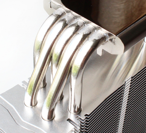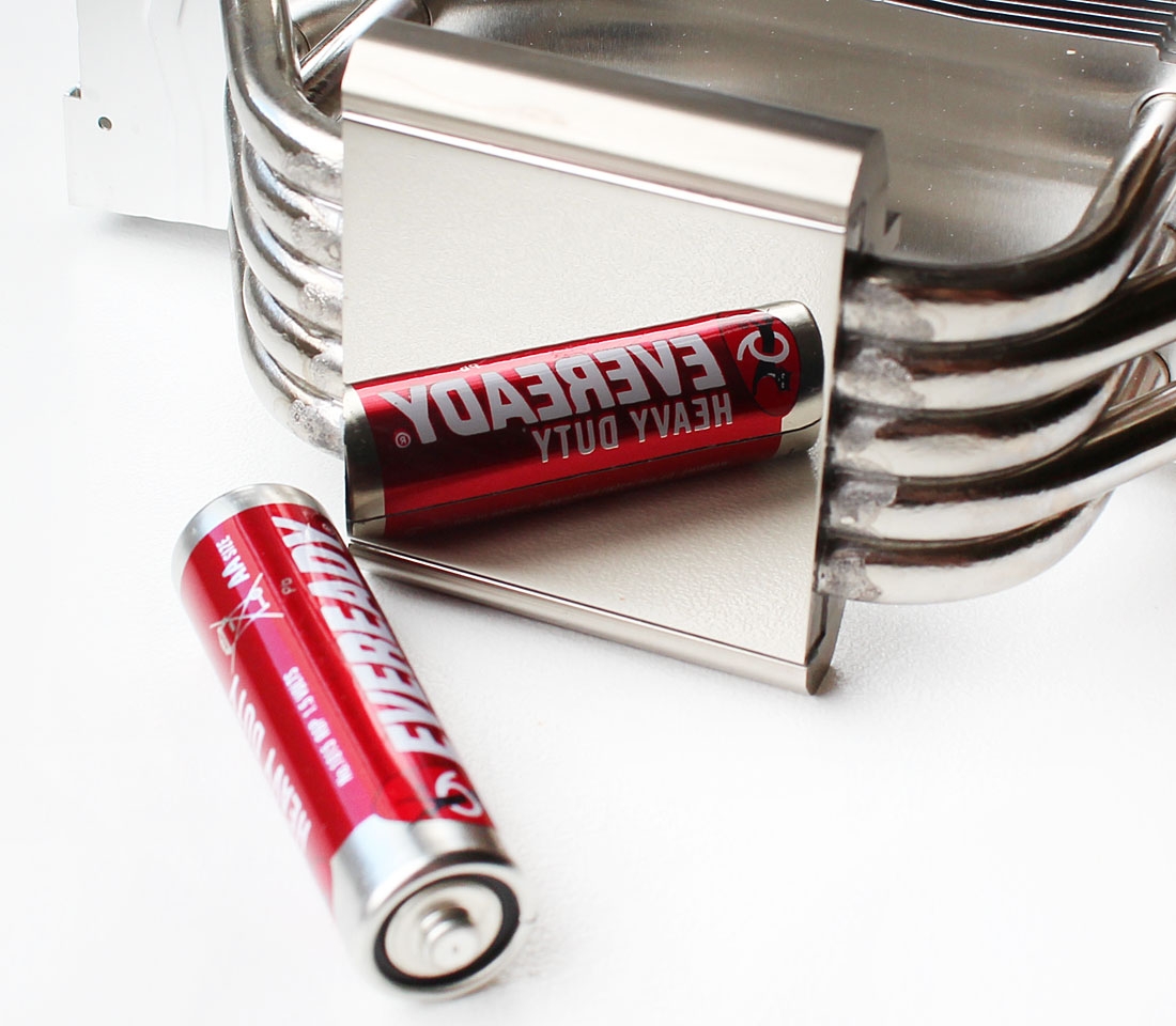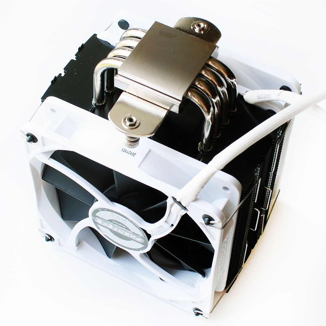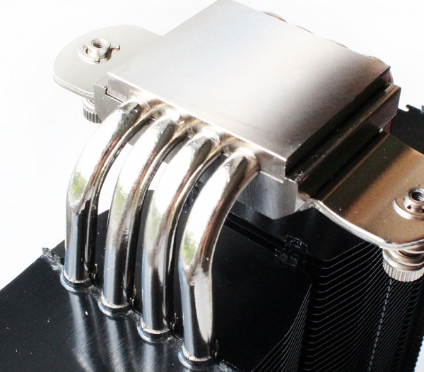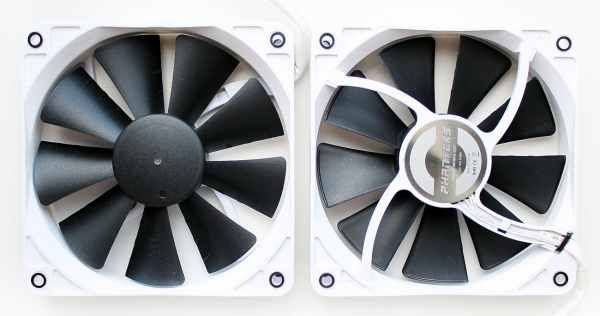 Наверняка наши постоянные читатели помнят великолепный старт первого кулера компании Phanteks — PH-TC14PЕ, поэтому и от нового Phanteks PH-TC12DX ожидания должны быть достаточно высокими. Запечатан он в просторную картонную коробку, боковые стороны которой испещрены всякого рода информацией о кулере и использованных в нём технологиях. Внутри находятся две вставки из вспененного полиэтилена, между которыми и зафиксированы радиатор с вентиляторами, а в отдельном отсеке этими вставками зажата картонная коробочка с аксессуарами. В ней — запечатанные пакетики с аксессуарами. Входят в комплект и инструкции по установке на различных языках, и Y-образный кабель. Рекомендованная стоимость новинки составляет 50 долларов США. Гарантия — 5 лет. Phanteks PH-TC12DX выпускается в четырёх цветах: чёрном, серебристом, синем и красном. Нам на тесты был предоставлен чёрный вариант данного кулера. Сначала давайте посмотрим на радиатор. Это небольшая конструкция башенного типа размерами 157х126х57 мм и весом всего 560 граммов. В нём применены две запатентованные технологии Phanteks — P.A.T.S. (Physical Anti-Oxidant Thermal Shield) и C.P.S.C. (Cold Plasma Spraying Coating), используемые также и в топовой модели компании. «Башня» состоит из двух независимых половинок, каждая из которых, в свою очередь, складывается ещё из двух половинок пластин, припаянных к тепловым трубкам. Это напомнило нам небезызвестный кулер Prolimatech Megahalems, у которого радиатор состоит из двух секций алюминиевых пластин, сочленённых на тепловых трубках. Общее количество пластин в каждой секции Phanteks PH-TC12DX равно 48, плюс одна общая декоративная пластина с отштампованным названием компании-производителя сверху. Толщина пластин радиатора равна 0,3 мм, а межрёберное расстояние — 2,0 мм. Расчётная площадь радиатора очень скромна по современным меркам — всего 5690 см2. В Phanteks PH-TC12DX используются четыре медные никелированные тепловые трубки диаметром 6 мм, пронизывающие медное основание. Контакт обеспечен пайкой, что обещает нам высокую скорость теплообмена и эффективность. Каждая из трубок лежит в желобке на расстоянии двух миллиметров от соседней. Минимальная толщина основания под трубкой равна 2,0 мм. Размеры контактной поверхности медного никелированного основания составляют 40х37 мм. Обработано оно достаточно неплохо, хоть и без зеркальной полировки. Самое главное, что основание ровное — даже на нашем процессоре со слегка выпуклым по центру теплораспределителем мы получили отпечатки по всей поверхности основания. На кулер устанавливаются два 120-мм вентилятора Phanteks PH-F120S. Это собственная разработка компании. Вентиляторы со 112-мм крыльчаткой оснащены PWM-управлением, благодаря которому могут изменять свою скорость в диапазоне от 800 до 1800 об/мин, создавая воздушный поток 23,0–68,5 CFM, статическое давление 0,39–2,07 мм H2O и уровень шума 21,9–27,6 дБА. Под металлической накладкой на 41-мм статоре вентиляторов скрыт фирменный подшипник UFB (Updraft Floating Balance) с заявленным сроком службы 150 000 часов, или более 12 лет непрерывной работы. Электрические характеристики «вертушек» также на уровне: по результатам наших измерений, каждый вентилятор потребляет не более 1,8 Вт и стартует с 4 В. Длина четырёхпроводных кабелей в оплётке составляет 400 мм. В качестве антивибрационных демпферов используются силиконовые кольца, вставленные в отверстия крепления вентиляторов, а само закрепл