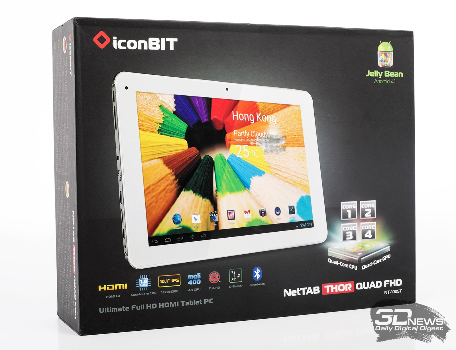 iconBIT THOR QUAD FHD — информация о системе и «железе» планшета ⇡#КомплектацияiconBIT THOR QUAD FHD — заводская коробка Гаджет поставляется в объемной коробке из плотного картона, в которую производитель заботливо уложил множество полезных аксессуаров. К устройству не нужно ничего приобретать отдельно — все необходимое покупатель получает вместе с самим планшетом, и это очень удобно для начинающих пользователей. Стандартный комплект поставки включает в себя следующее: