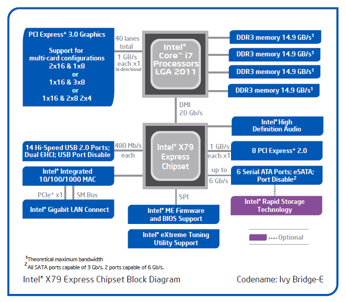 Многие IT-издания в последнее время грешат тем, что стараются загнать приверженцев традиционных компьютерных систем в глубокую депрессию, обрушивая на них потоки объективной и субъективной информации о сокращении рынка ПК и близости заката всей этой отрасли. И в целом такие мрачные прогнозы имеют право на жизнь, но с одной важной оговоркой: они не должны касаться высокопроизводительных игровых систем. Согласно имеющимся данным, продажи дорогого игрового железа и компьютеров для энтузиастов на его основе не демонстрируют тенденции к сокращению, а ряд аналитиков даже высказывается в пользу уверенного роста данного рыночного сегмента в течение ближайших нескольких лет. Однако даже если отмести всякие мысли о том, что традиционные производительные системы на базе x86-архитектуры могут вскорости кануть в Лету, совершенно очевидно, что с замедлением прогресса в части их аппаратной начинки нам всё же придётся смириться. Разработчики процессоров и графических ускорителей поддались общему порыву и переориентировали значительную часть своих инженерных ресурсов в сторону бурно растущего сегмента мобильных систем, а потому появление новых поколений десктопных CPU и GPU происходит теперь значительно реже. Более того, при этом случаются и такие казусы, как Haswell. Компания Intel решила убить одним выстрелом двух зайцев и в начале лета подсунула для десктопных систем новую процессорную микроархитектуру, явно ориентированную на мобильные применения. К чему это привело, мы хорошо знаем: LGA1150-процессоры нового поколения не предлагают роста тактовых частот и разгоняются хуже предшественников, вызывая своими улучшениями в быстродействии одно лишь разочарование. Однако, имея в виду Haswell, обижаться на Intel всё-таки рановато, так как этот процессор – решение не самого верхнего уровня. Для настоящих энтузиастов традиционных настольных систем у компании имеется обособленная платформа LGA2011, обновление которой также не заставило себя долго ждать. Уже через неделю на прилавках компьютерных магазинов должно появиться свежее семейство процессоров, основывающееся на принципиально новом дизайне Ivy Bridge-E, которое, возможно, позволит нам простить Intel её предательство интересов убеждённых почитателей традиционных десктопных платформ. Выход семейства Ivy Bridge-E в свет предполагает возрождение анонсированной в ноябре 2011 года десктопной платформы LGA2011, для которой до сих пор выпускались лишь CPU c более чем зрелым дизайном Sandy Bridge-E, изготавливаемые по далеко не самому современному 32-нм техпроцессу. Теперь же LGA2011-процессоры будут переведены на более новую (но не самую последнюю) модификацию микроархитектуры и на 22-нм технологические нормы. Правда, в отсутствие реальной конкуренции Intel не видит необходимости в серьёзном пересмотре своей передовой десктопной платформы, поэтому ни значительного роста тактовых частот, ни увеличения количества вычислительных ядер не предполагается. ![]() Иными словами, флагманские процессоры компании Intel пока что принципиально не изменятся и продолжат располагать лишь шестью ядрами с поддержкой технологии Hyper-Threading. Зато при этом немного снизится их тепловыделение, а также добавится официальная поддержка графической шины PCI Express 3.0 и более скоростной памяти стандарта DDR3-1866 SDRAM. Сама же платформа остаётся насквозь старой: с про