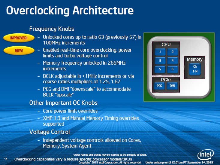 Официальные спецификации только укрепляют веру в привлекательность Core i7-4820K. С точки зрения тактовых частот этот процессор не уступает Core i7-4770K, при этом обладая увеличенным объёмом кеша третьего уровня, контроллером памяти с существенно более высокой пропускной способностью и поддержкой вдвое большего количества линий PCI Express. В сравнении же с Core i7-3820 у представителя семейства Ivy Bridge-E тактовая частота даже немного поднялась, а в названии добавилась литера K. Intel здраво рассудила, что неограниченными оверклокерскими функциями должны обладать любые процессоры для флагманской платформы LGA2011, поэтому у нового четырёхъядерника для платформы LGA2011 больше нет никаких блокировок базового множителя. ![]() Таким образом, в теории Core i7-4820K может стать отличным вариантом для тех пользователей, которые по тем или иным причинам оказались расстроены особенностями старших процессоров Haswell. Одна из главных претензий к новейшим процессорам Haswell – по поводу их оверклокерских свойств. Тепловыделение у носителей этой микроархитектуры возросло, а вот ситуация с теплоотводом была искусственно испорчена Intel, которая вместо эффективного термоинтерфейса стала помещать между процессорным кристаллом и крышкой процессора весьма посредственную термопасту. В результате типичными частотами, достижимыми при разгоне LGA1150-четырёхъядерников c использованием воздушных кулеров, стали достаточно скромные по современным меркам 4,3-4,5 ГГц. Процессорный дизайн Ivy Bridge-E в этой связи готов преподнести две новости. Начнём с плохой: полупроводниковый кристалл Ivy Bridge-Е, лишённый графического и заблокированных вычислительных ядер, создаёт очень высокую плотность теплового потока. Как это ни удивительно, но по плотности теплового излучения Ivy Bridge-E превосходит не только шестиядерные Sandy Bridge-E (примерно в полтора раза), но даже и четырёхъядерные Ivy Bridge или Haswell (примерно на 5-7 процентов). Это внушает определённое беспокойство о том, что на пути разгона новинок вновь может встать уже привычное препятствие в виде перегрева процессорных ядер. И в этой связи теплопроводность материала под закрывающей процессорный кристалл крышкой приобретает чуть ли не ключевое значение. К счастью, хорошая новость заключается в том, что в Ivy Bridge-E в качестве такого термоинтерфейса вновь применяется высокоэффективный припой. И это значит, что тепло с новых процессоров для платформы LGA2011 может сниматься без лишних препятствий, а увеличение мощности системы охлаждения легко конвертируется в рост максимально достижимых при разгоне частот. Что же касается тех инструментов, которые предлагает для разгона новый процессорный дизайн, то тут каких-либо изменений по сравнению с Sandy Bridge-E практически нет. Все Ivy Bridge-E обладают свободным коэффициентом умножения, в дополнение к чему существует возможность смены с 100 на 125 МГц (и в некоторых случаях на 167 МГц) частоты базового генератора. Частота DDR3-памяти способна изменяться в неограниченных пределах с шагом 266 МГц, а кроме того, заявлена поддержка более новой версии профилей XMP 1.3. ![]() Оверклокерских нововведений в Ivy Bridge-E всего два. Добавлена поддержка разгона в реальном времени (без необходимости перезагрузки для вступления настроек в силу), а также до 63 увеличен максимальный поддерживаемый множитель. Теперь – о практике. Вооружившись одним из самых луч