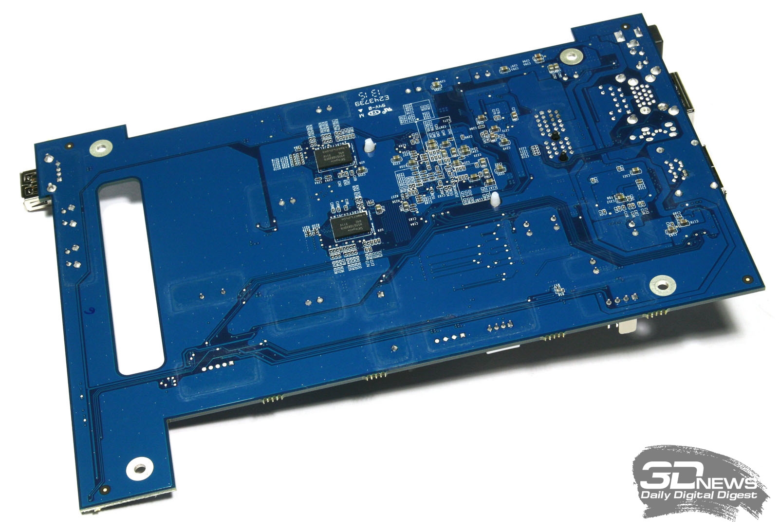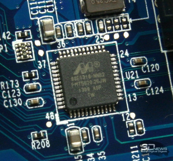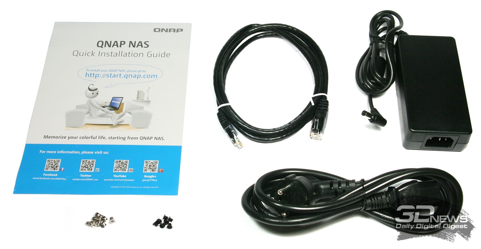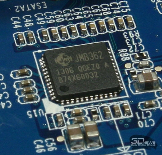 Системная плата NAS QNAP TS-220 Новинка работает под управлением достаточно часто встречающейся в сетевых накопителях SoC Marvell Kirkwood 6282 с тактовой частотой 1,6 ГГц. Процессор имеет встроенные интерфейсы SATA II и USB 2.0, а также контроллеры для NAND-памяти и оперативной памяти DDR2/3. Чип отличается низким тепловыделением, а потому нередко можно наблюдать картину, когда Marvell Kirkwood 6282 работает даже без пассивного охлаждения в виде радиатора. Но в QNAP экономить на радиаторах не стали, а потому за перегрев аппаратной начинки волноваться не стоит. Модуль памяти DSL DDR3-1066 Оперативная память у QNAP TS-220 несменная. Всего на системной плате размещено четыре модуля Hynix H5TQ1G83DFR-H9C DDR3-1333. Производительность памяти ограничена возможностями аппаратной платформы, поэтому частота работы ОЗУ составляет всего 1066 МГц. Сетевой интерфейс Marvell Alaska 88E1318 Передачу данных обеспечивает гигабитный интерфейс Marvell 88E1318. Контроллер eSATA JMicron JMB362 Ну а работа портов eSATA стала возможной благодаря наличию на системной плате соответствующих контроллеров JMB362 производства тайваньской компании JMicron Technology. Остаётся загадкой, что же скрывается под вторым радиатором чёрного цвета, но, если судить по отсутствию в остальных местах платы контроллера USB 3.0, именно ему разработчики QNAP TS-220 решили снижать температуру. Выяснять, какой именно контроллер скрывается под приклеенным на него радиатором, мы не стали. Не исключено, что это довольно распространённая микросхема производства тайваньской компании Etron Technology Inc. ⇡#КомплектацияКомплект поставки NAS QNAP TS-220 Устройство поставляется в достаточно крупной для двухдисковой модели картонной коробке светлых оттенков, внутри которой, помимо самого NAS, мы обнаружили следующие аксессуары: