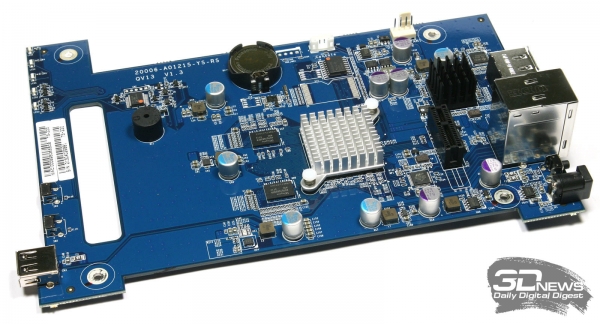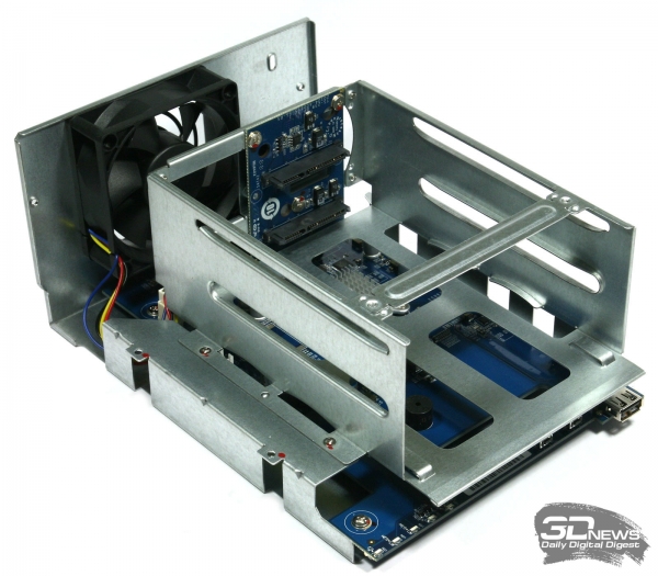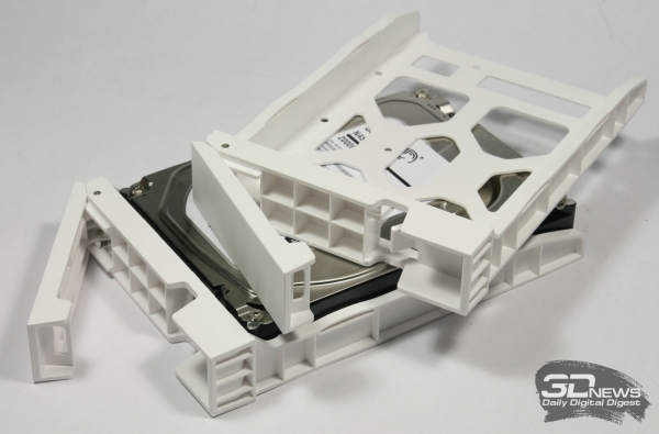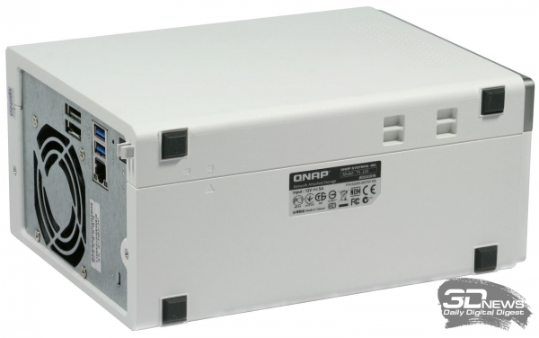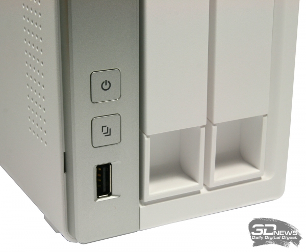 Ни компакт-диска с ПО, ни руководства пользователя в коробке не оказалось, но это вовсе не ошибка укладчика. Вместо них был найден листок бумаги с симпатичной картинкой и интернет-адресом стартовой страницы, на которой можно найти не только инструкцию по установке и началу работы, но и полный комплект ПО, включая последнюю версию фирменной ОС QTS. ⇡#Внешний вид и эргономикаВнешний вид NAS QNAP TS-220 В отличие от большинства других NAS производства QNAP, модель QNAP TS-220 выполнена из белоснежного пластика с единственной серой вставкой на передней панели. Почти везде пластик имеет выраженную шероховатость и отлично противодействует появлению на корпусе устройства пыли и отпечатков пальцев. Единственным исключением является узкая лакированная полоса, проходящая по верхней части корпуса. Пыль к ней, конечно, прилипает, но на белой поверхности она совсем не видна. NAS QNAP TS-220: вид снизу Конструкция корпуса у QNAP TS-220 классическая, но с изюминкой. Его основу составляет металлический каркас, закрытый снаружи двумя массивными пластиковыми панелями. Нюанс заключается в том, что здесь несущим является не только внутренний металлический каркас, как у других NAS, но и пластиковые части корпуса. Пластик традиционно покрывает почти все грани, кроме задней металлической панели с разъёмами. Даже нижняя поверхность корпуса в данном случае пластиковая. На ней наклеены четыре резиновые ножки, на которые и опирается NAS. Интерфейсы лицевой панели Основное пространство лицевой панели занято дисковыми салазками. Интерфейсы расположены лишь на вертикальной серой вставке. В самом низу находится единственный у устройства порт USB 2.0. Этот порт предназначен в первую очередь для копирования данных с внешних накопителей, поэтому не совсем ясна причина, по которой разработчики установили здесь USB именно второй версии, а не более производительной третьей. Над портом разместились две квадратные кнопки, одна из которых активирует операцию копирования с подключённого внешнего носителя, а другая управляет питанием устройства. Ещё выше расположены пять разноцветных индикаторов, информирующих пользователя об активности жёстких дисков сетевого порта и режиме работы NAS. Интерфейсы задней панели Все остальные интерфейсы расположены на задней панели. Кроме отмеченных в спецификации портов USB 3.0 и eSATA, а также сетевого интерфейса RJ-45, здесь же находится кнопка оперативной перезагрузки накопителя, гнездо для подключения адаптера питания и отверстие для крепления замка безопасности типа Kensington. Уделили внимание создатели NAS и некоторым приятным мелочам. Так, например, рядом с гнездом питания расположен пластиковый хомутик для укладки кабеля. Ну а большая часть задней панели занята вентиляционной решёткой 70-миллиметрового вентилятора, который протягивает воздух через весь корпус накопителя, забирая его снаружи через многочисленные отверстия в пластиковых панелях. ⇡#Установка жёстких дисков и внутреннее строениеОтсек жёстких дисков Салазки жёстких дисков у QNAP TS-220 не имеют каких-либо дополнительных замков безопасности и фиксируются в корпусе — после того как вы до упора прижмёте их пластиковые ручки. Ощущения чёткой фиксации не наблюдается, поэтому на всякий случай лучше дополнительно убедиться в надёжности установки дисков, слегка толкнув их рукой внутрь. Салазки дл