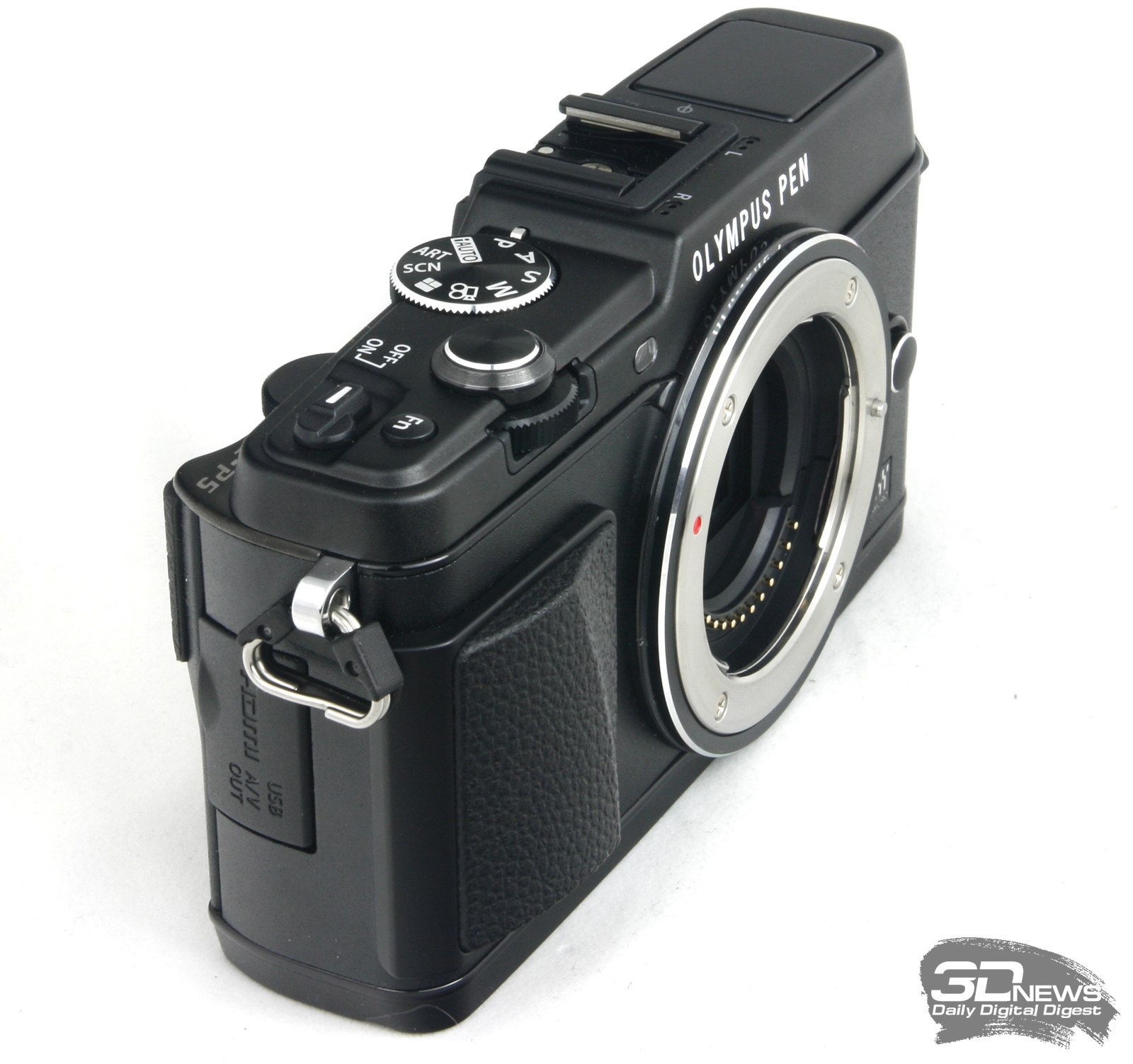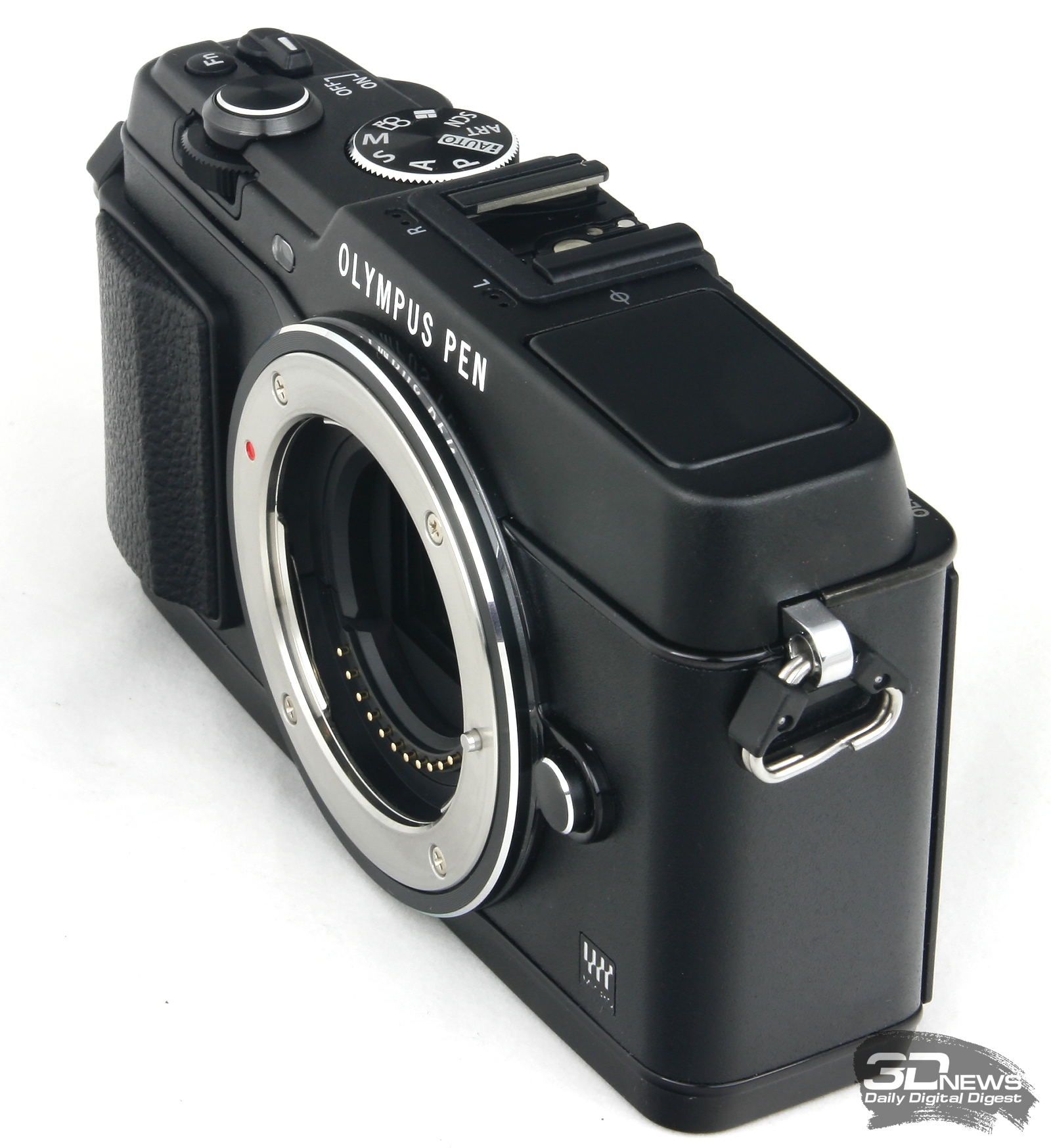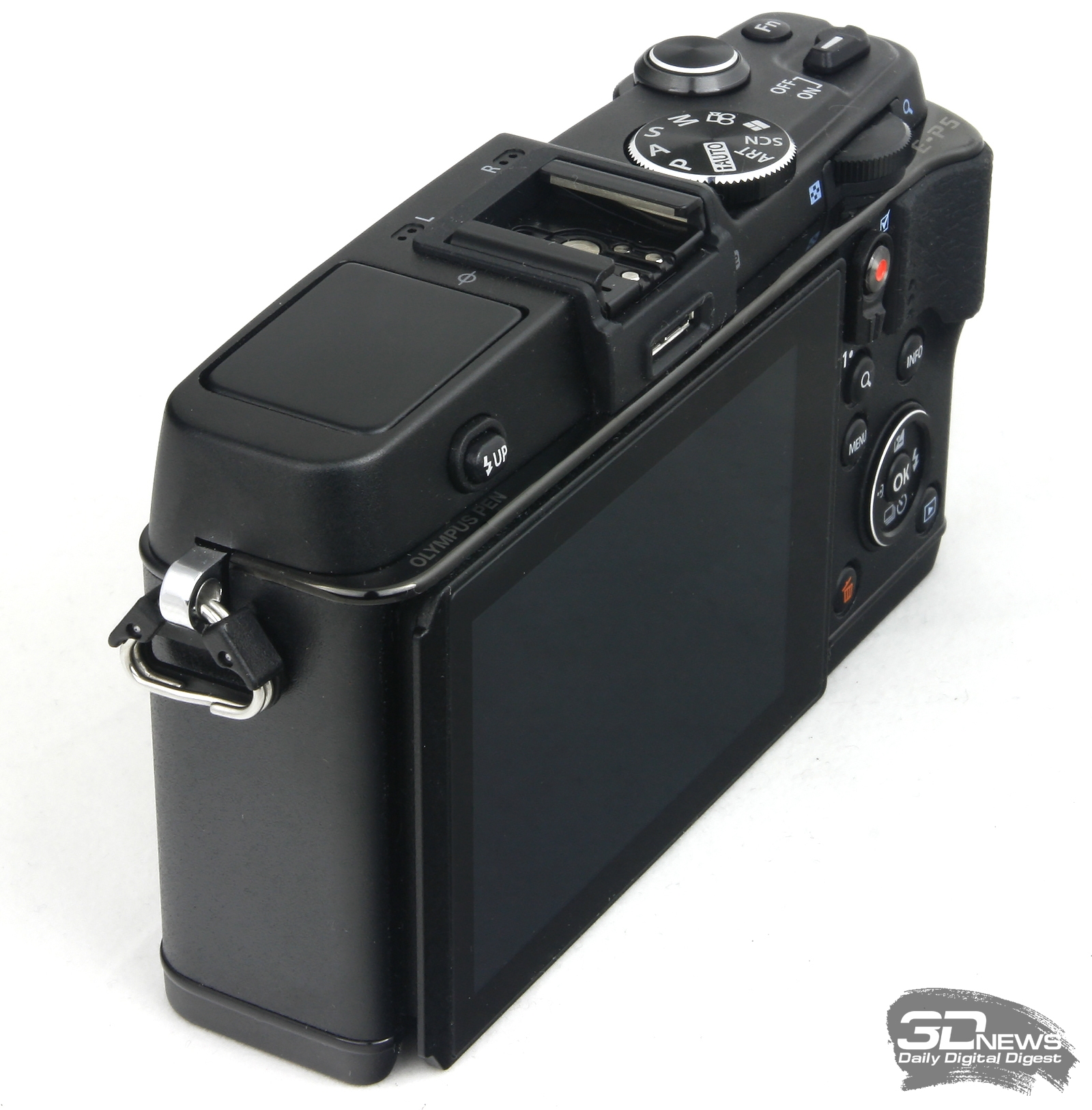 ⇡#Внешний вид и удобство использованияНачиная с первого поколения старшей модели в линейки PEN тыльную сторону традиционно украшал высокий диск управления. Да, настолько высокий, что его скорее можно было назвать некой бочкой, нежели диском. В новинке же сзади находится классический и привычный узкий диск. Кроме того, спереди появился лицевой диск управления, как и подобает недешёвой камере. Привычную клавишу питания заменил отдельный рычажок. Хромированных деталей стало гораздо меньше, из-за чего — с субъективной точки зрения — камера выглядит чуть скучнее предка. Впрочем, если учесть, что со времён презентации E-P3 появилось премиальное семейство OM-D, подобное упрощение внешности в теории должно уменьшить конкуренцию внутри модельного ряда компании. Материалы и качество сборки, как и прежде, на высоте, и тут нет ни единого замечания. Все детали подогнаны безупречно, а при попытке скручивания и сдавливания корпуса он совершенно не поддаётся и не издаёт никаких звуков. С лицевой стороны находятся байонет, лампа подсветки автофокуса и фронтальный диск управления. Лицевая накладка на вид отдалённо напоминает кожу. У новинки накладка съёмная, но снять ее не так уж просто, тогда как в E-P3 её легко можно было отсоединить, открутив монеткой один винт. С тыльной стороны изменения ещё более серьёзные. Со времён первой камеры семейства PEN E-P органы управления от модели к модели практически не изменялись. В новинке же перемен достаточно много. Появился наклонный дисплей. Кроме этого, произошла рокировка клавиш перехода в режим просмотра и входа в основное меню, кнопка перехода в режим просмотра миниатюр вовсе пропала, ведь её функцию теперь выполняет тыльный диск управления. Но и это ещё далеко не всё. На месте высокого диска управления появилась резиновая накладка, которая облегчает фиксацию в руке слегка потяжелевшей камеры. Немаловажным отличием является отсутствие диска управления по периметру многофункциональной клавиши, к которому пользователи камер PEN E-P уже успели привыкнуть за прошедшие несколько лет. Но всё же одним из наиболее интересных новшеств является рычаг рядом с клавишей видеозаписи. Чисто интуитивно, не покрутив диски и не пощёлкав рычажком, понять, что же это за рычаг и что он делает в режиме видео, весьма сложно. Обозначен он невнятной пиктограммой галочки, вписанной в квадрат, — поди догадайся. На самом деле функция рычажка весьма интересна, да и управление камерой он здорово упрощает. При его установке в положение 1 тыльный и лицевой диски отвечают за управление выдержкой и диафрагмой (либо выдержкой/диафрагмой и компенсацией экспозиции в режимах установки экспопары A и S соответственно), как и в большинстве других камер с двумя дисками управления. При установке рычага в положение 2 диски управления отвечают за выбор настройки баланса белого и чувствительности. На самом деле это чрезвычайно удобно — чтобы понять, насколько, это нужно попросту попробовать. Кроме того, данный рычаг позволяет управлять функциями клавиши видеосъёмки (начало/остановка записи и применение функций). Также на тыльной стороне находится кнопка механического замка подъёмной вспышки и разъём подключения аксессуаров. Сверху расположились подъёмная вспышка, «горячий башмак», пара микрофонов, диск выбора режимов съёмки, кнопка спуска 