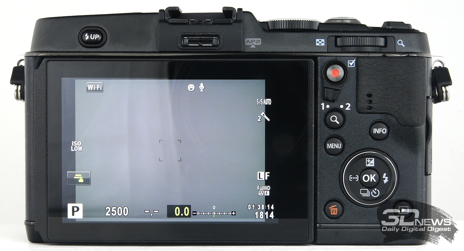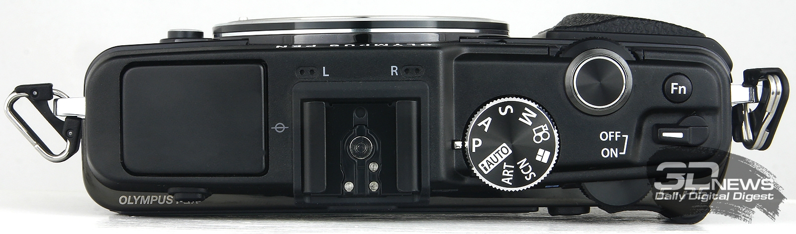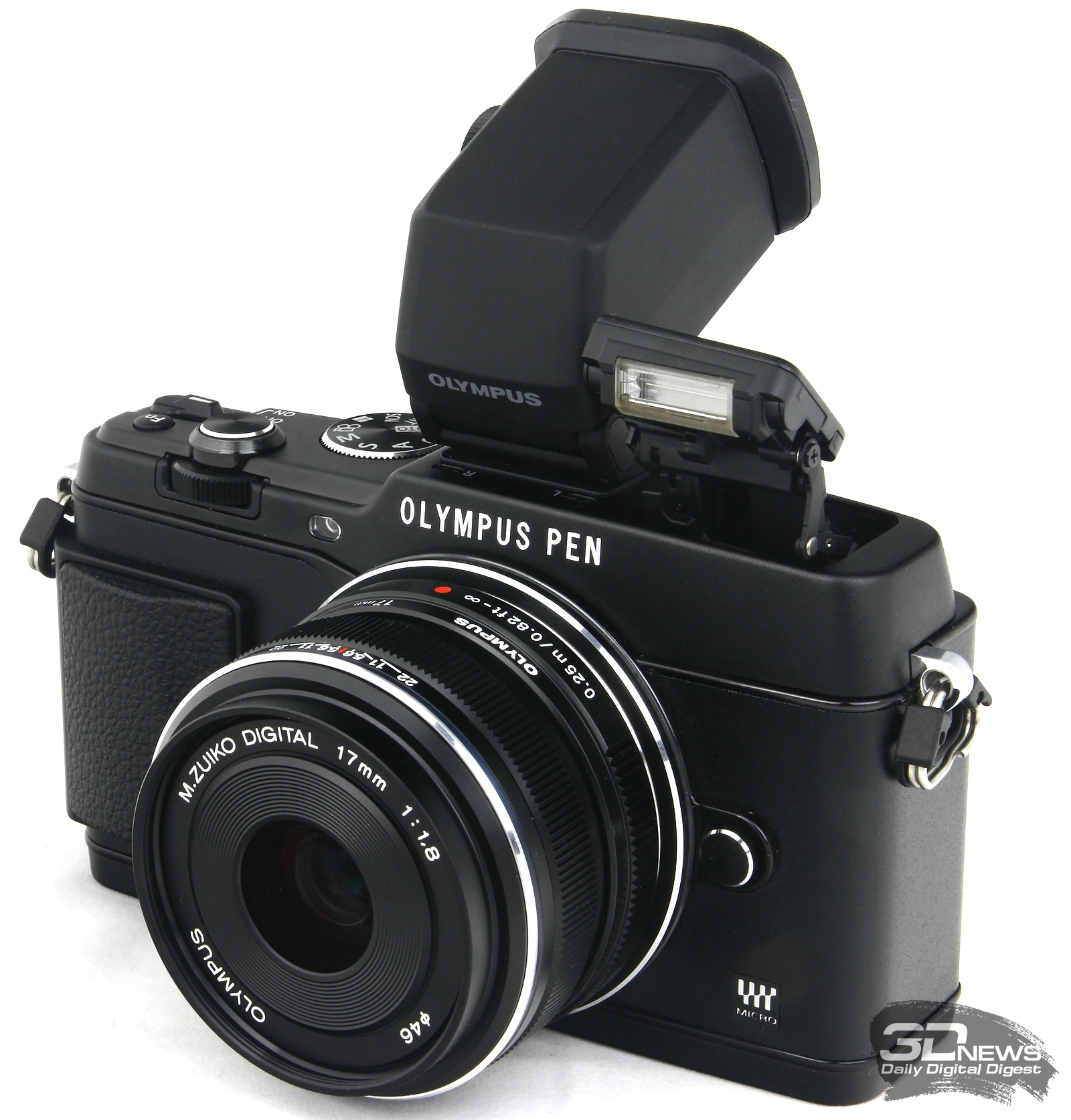 ⇡#Внешний вид и удобство использованияНачиная с первого поколения старшей модели в линейки PEN тыльную сторону традиционно украшал высокий диск управления. Да, настолько высокий, что его скорее можно было назвать некой бочкой, нежели диском. В новинке же сзади находится классический и привычный узкий диск. Кроме того, спереди появился лицевой диск управления, как и подобает недешёвой камере. Привычную клавишу питания заменил отдельный рычажок. Хромированных деталей стало гораздо меньше, из-за чего — с субъективной точки зрения — камера выглядит чуть скучнее предка. Впрочем, если учесть, что со времён презентации E-P3 появилось премиальное семейство OM-D, подобное упрощение внешности в теории должно уменьшить конкуренцию внутри модельного ряда компании. Материалы и качество сборки, как и прежде, на высоте, и тут нет ни единого замечания. Все детали подогнаны безупречно, а при попытке скручивания и сдавливания корпуса он совершенно не поддаётся и не издаёт никаких звуков. С лицевой стороны находятся байонет, лампа подсветки автофокуса и фронтальный диск управления. Лицевая накладка на вид отдалённо напоминает кожу. У новинки накладка съёмная, но снять ее не так уж просто, тогда как в E-P3 её легко можно было отсоединить, открутив монеткой один винт. С тыльной стороны изменения ещё более серьёзные. Со времён первой камеры семейства PEN E-P органы управления от модели к модели практически не изменялись. В новинке же перемен достаточно много. Появился наклонный дисплей. Кроме этого, произошла рокировка клавиш перехода в режим просмотра и входа в основное меню, кнопка перехода в режим просмотра миниатюр вовсе пропала, ведь её функцию теперь выполняет тыльный диск управления. Но и это ещё далеко не всё. На месте высокого диска управления появилась резиновая накладка, которая облегчает фиксацию в руке слегка потяжелевшей камеры. Немаловажным отличием является отсутствие диска управления по периметру многофункциональной клавиши, к которому пользователи камер PEN E-P уже успели привыкнуть за прошедшие несколько лет. Но всё же одним из наиболее интересных новшеств является рычаг рядом с клавишей видеозаписи. Чисто интуитивно, не покрутив диски и не пощёлкав рычажком, понять, что же это за рычаг и что он делает в режиме видео, весьма сложно. Обозначен он невнятной пиктограммой галочки, вписанной в квадрат, — поди догадайся. На самом деле функция рычажка весьма интересна, да и управление камерой он здорово упрощает. При его установке в положение 1 тыльный и лицевой диски отвечают за управление выдержкой и диафрагмой (либо выдержкой/диафрагмой и компенсацией экспозиции в режимах установки экспопары A и S соответственно), как и в большинстве других камер с двумя дисками управления. При установке рычага в положение 2 диски управления отвечают за выбор настройки баланса белого и чувствительности. На самом деле это чрезвычайно удобно — чтобы понять, насколько, это нужно попросту попробовать. Кроме того, данный рычаг позволяет управлять функциями клавиши видеосъёмки (начало/остановка записи и применение функций). Также на тыльной стороне находится кнопка механического замка подъёмной вспышки и разъём подключения аксессуаров. Сверху расположились подъёмная вспышка, «горячий башмак», пара микрофонов, диск выбора режимов съёмки, кнопка спуска 