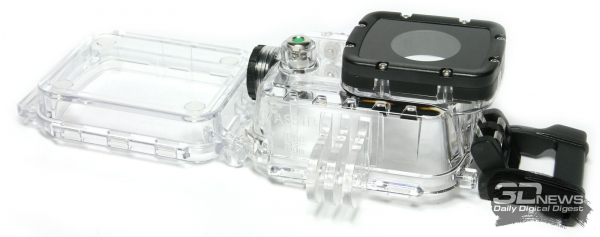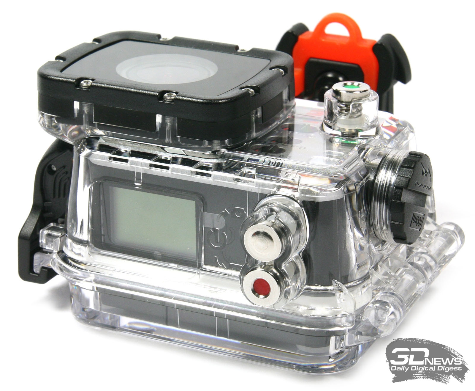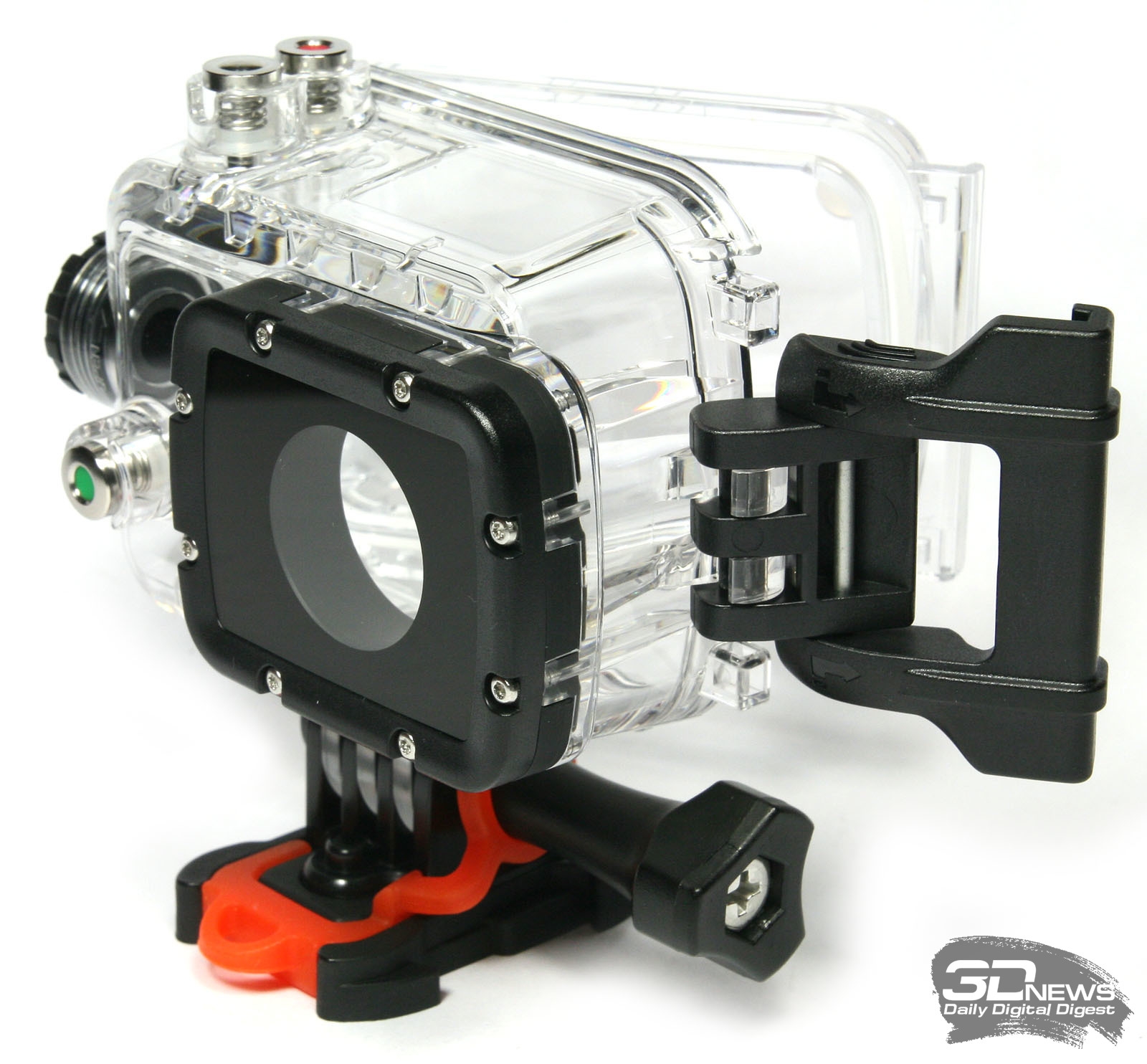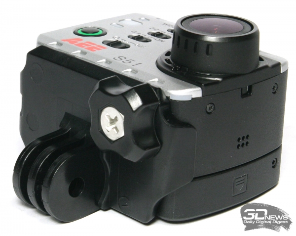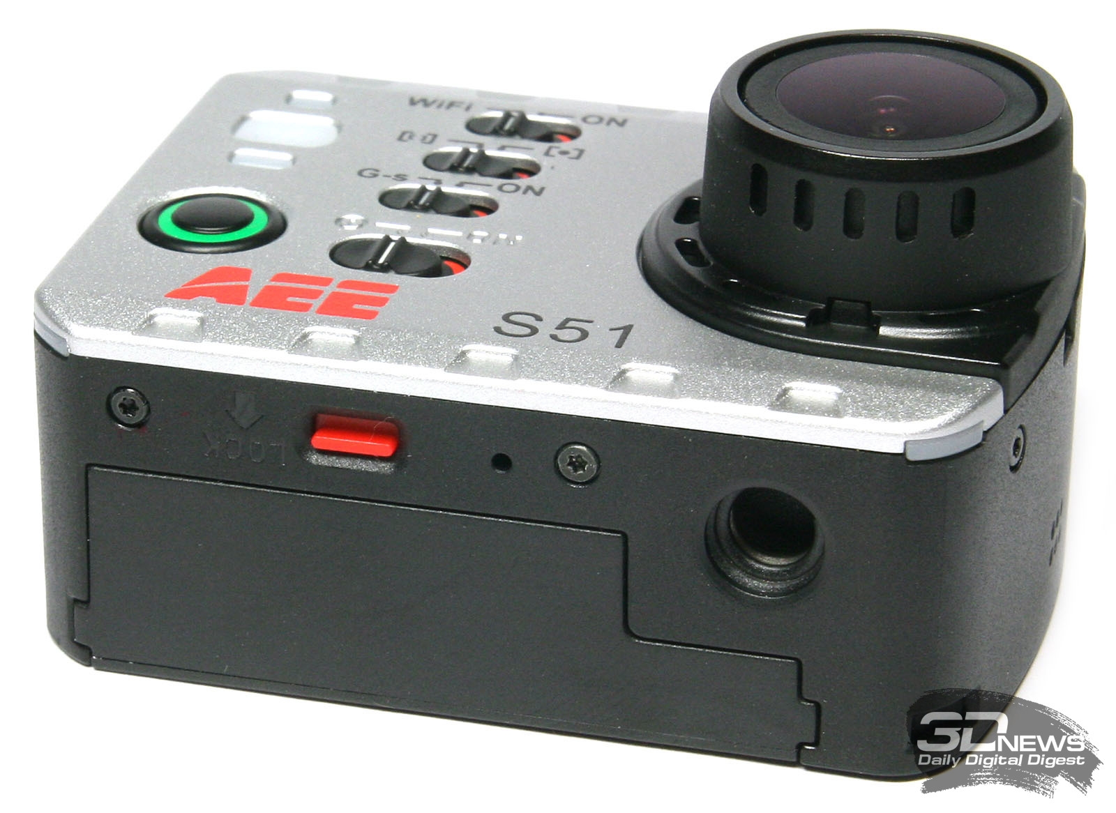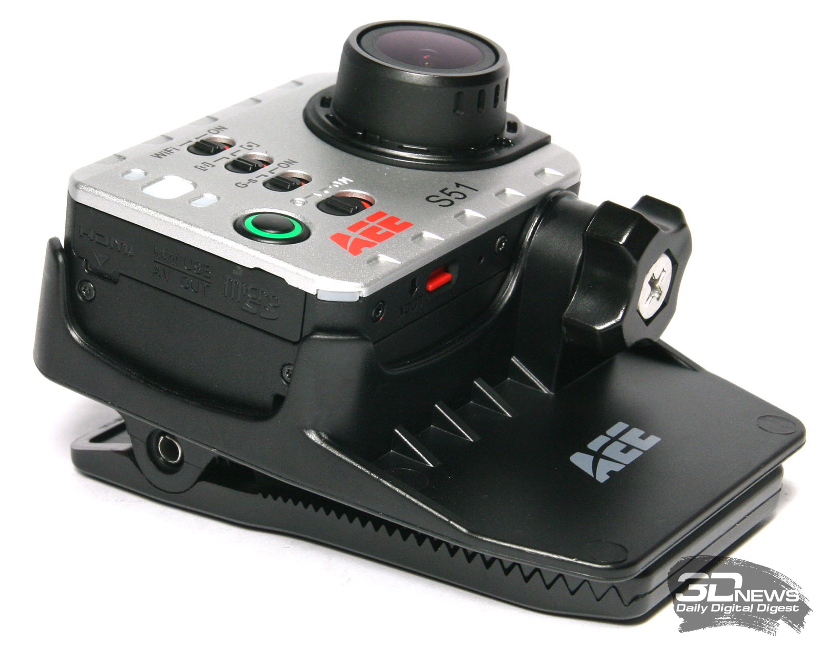 Набор аксессуаров внушает уважение, хотя некоторые варианты креплений, такие как ремешок или хомут для руля, всё-таки придётся приобретать дополнительно. ![]() Фирменный пульт ДУ имеет модуль Wi-Fi Кроме того, у модели AEE MagiCam S51 отсутствует пульт ДУ. Его функции по задумке производителей должен выполнять смартфон с Wi-Fi и установленной фирменной утилитой — или же придется приобрести пулт ТДУ дополнительно. ⇡#Внешний вид и аксессуарыНа передней панели сосредоточены сдвижные выключатели различных функций Все разъёмы плотно закрыты пластиковой крышкой На верхней панели камеры, кроме дополнительного дисплея, находятся кнопки управления съёмкой Нижнюю панель занимает аккумулятор и резьбовое отверстие для монтажа камеры По сравнению с предыдущими моделями новинка стала ещё больше походить на своего прямого конкурента — камеру GoPro HERO3, благодаря смещённому в сторону объективу. При этом AEE MagiCam S51 выглядит интереснее. Оригинальные элементы отделки корпуса из качественного прочного пластика, сдвижные переключатели, кнопки, индикаторы и дополнительный дисплей в верхней части — всё это не только грамотно расположено, но ещё и работает без каких-либо проблем. Камера во всепогодном корпусе Несмотря на обилие интерфейсов, основных органов управления съёмкой у AEE MagiCam S51 только три, и все они вынесены на внешний всепогодный корпус в виде крупных металлических кнопок, позволяющих управлять камерой вслепую. Два варианта задней дверцы внешнего герметичного корпуса Герметичный корпус рассчитан на погружение под воду на глубину до 100 м. По сравнению с аналогичным аксессуаром для модели AEE MagiCam SD21 он почти не изменился, но получил сменную заднюю дверцу для работы с камерой без блока с дисплеем, а также приобрёл оригинальную особенность, выгодно отличающую его от конкурентов. Всепогодный корпус На одной из боковых сторон прозрачного корпуса есть вывинчивающаяся крышка, в отверстие под которой можно подключить USB-кабель для питания камеры, а также освободить доступ к микрофону. Нырять под воду с кабелем питания не получится, а вот оставить такую конструкцию работать под дождём — это пожалуйста! Камера с различными типами креплений С набором основных креплений для плоских поверхностей мы уже знакомы. Камеру на них можно закрепить как в подводном боксе с помощью специального переходника, так и без него. В этом случае камера прикручивается к специальной платформе, которая вставляется в одну из площадок с клеевой основой или отверстиями под винтовое соединение. А вот крепёж в виде мощной клипсы — это новшество.
