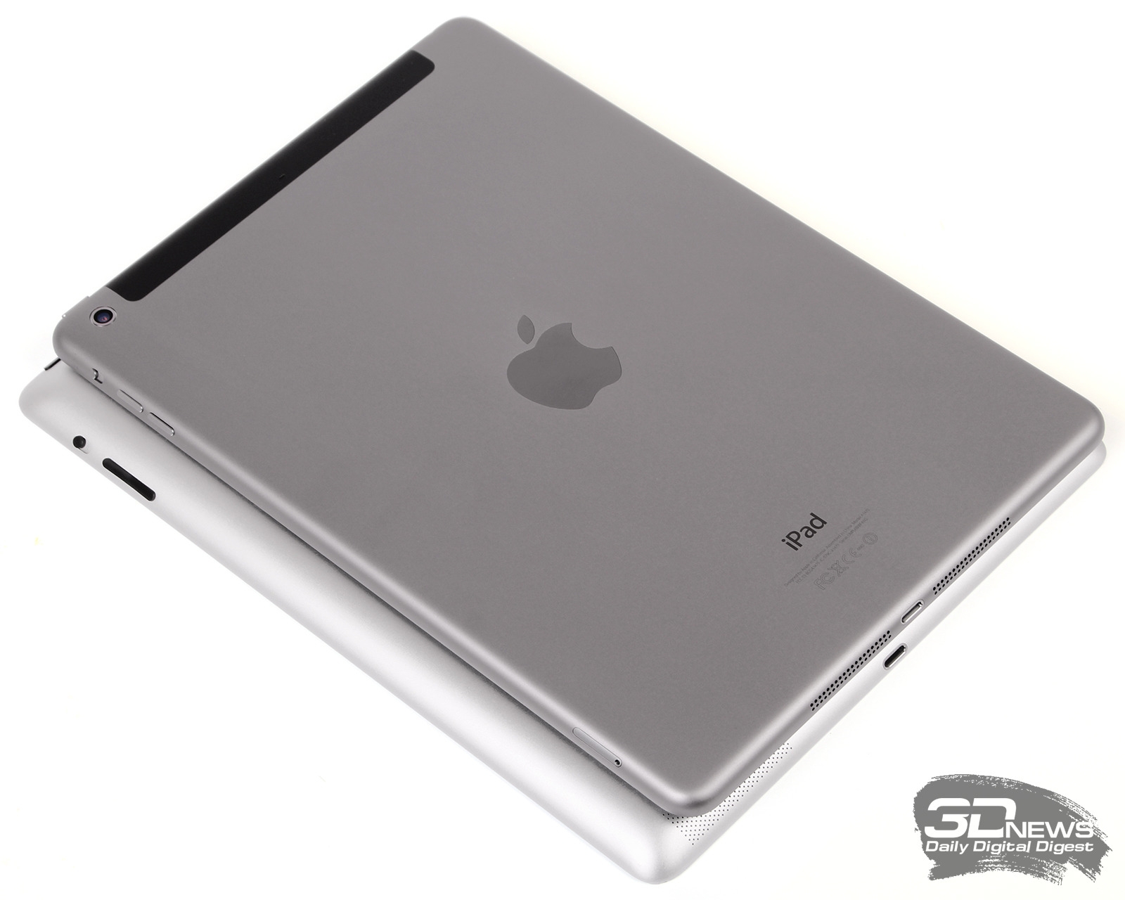 После массового появления планшетов с диагоналями дисплеев 7-8 дюймов интерес к классическим 10-дюймовым моделям сильно поубавился. Причем виноваты в этом были сами производители: они наращивали планшетам «мускулы», из-за чего эти устройства получались дорогими и тяжелыми. Ничего удивительного, что куда более компактные, легкие и доступные «семидюймовочки» в итоге стали более популярными. В Apple как следует проанализировали недостатки 10-дюймовых моделей и попытались единым махом устранить их все – вдохнув новую жизнь в уже, казалось, утратившую привлекательность категорию планшетов. Тут очень кстати пришелся новый процессор Apple A7, который только ленивый не пнул за «никому не нужную 64-битность». Но цимес в этом процессоре – не в 64-битных вычислениях как таковых. А в очень выгодном сочетании высокой производительности и невысокого энергопотребления – каковое сочетание в итоге и позволило сделать iPad Air таким, каким он стал. Впрочем, обо всем по порядку. ⇡#ДизайнОтделаться самым коротким в мире обзором, как с iPad Mini, на сей раз явно не получится: iPad Air – самое яркое, что происходило с полноразмерными «айпадами» за всю их историю, не считая, конечно, выхода самого первого iPad. Поменялось буквально всё — от дизайна и до архитектуры процессора, от количества динамиков и до внешности операционной системы. Начнем с дизайна. Тут как раз все просто: iPad Air – это такой iPad Mini, только большой. От Mini новому «айпаду» досталось буквально всё: пропорции, тонкая рамка по бокам от экрана, более прямые — чем у The New iPad – углы и даже две отдельных кнопки регулировки громкости на правом боку вместо монолитной «качельки». Кстати, теперь у 10-дюймового iPad, как и у Mini, есть стереодинамики, а также — впервые в истории айпадостроения — два микрофона. Название Air для нашего гостя более чем уместно: «айпад» стал примерно на 16 мм уже, на миллиметр короче и почти на 2 — тоньше. Главное при этом, что он теперь ощутимо легче: под iPad Air с LTE наши весы показывают 479 грамм, а под iPad 4 в той же «сотовой» версии – 662 грамма. Это действительно чуть ли не самое важное изменение в Air – один из авторов этого обзора в свое время переехал с iPad 3 на iPad Mini именно из-за того, что от 10-дюймовой версии уставали руки. От Air руки практически не устают — его без проблем можно держать на весу сколь угодно продолжительное время. Если раньше полноразмерный iPad был в два с лишним раза тяжелее Mini, то теперь – всего в полтора раза, что уже вполне приемлемо. Масса снизилась по нескольким причинам: во-первых, уменьшился сам планшет, во-вторых, тоньше и легче стали корпусные панели, в-третьих, использован более тонкий — и более легкий — дисплей, и в четвертых — ощутимо снизилась емкость батареи. Уменьшение толщины как самого корпуса, так и алюминиевого листа, из которого он сделан, а также стекла, которым накрыт дисплей, сказывается и на жесткости планшета. Согнуть iPad Air не получается, а вот продавить матрицу до появления разводов на экране — легко. В iPad 4 это сделать куда сложнее. Вместе с корпусом изменилась и окраска «айпадов» — теперь используется точно такой же вариант анодирования, как в iPad Mini или iPhone 5/5s. Не знаем, как будет с iPad Air, а вот на других устройствах оно имеет нехорошее свойство достаточно быстро скалываться и царапаться. Чтобы защитить «спинку» планшета от повреждений, Apple отныне предлагает чехлы Smart 
