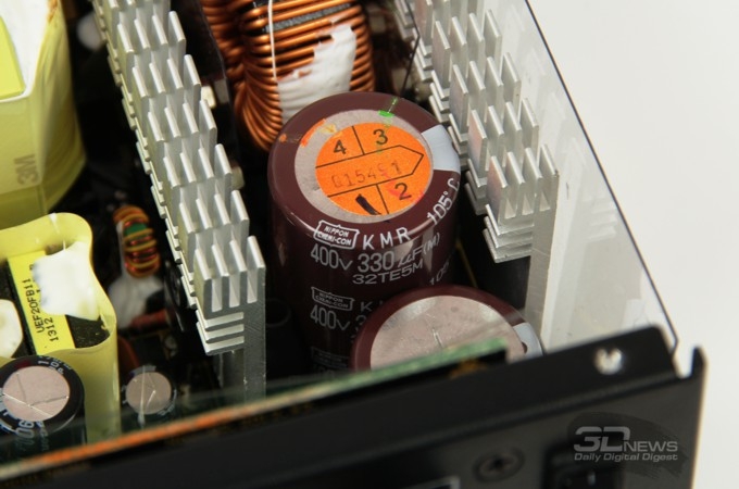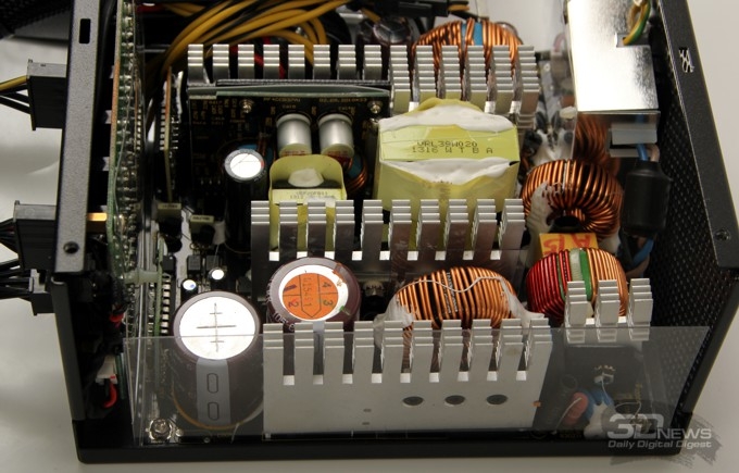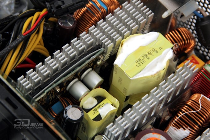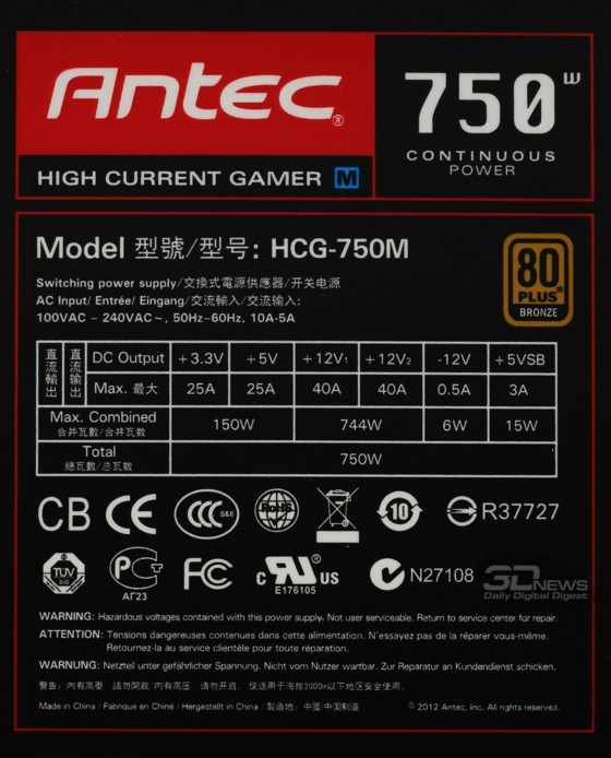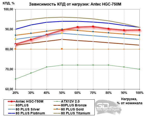 ![]() Входное преобразование напряжения у этой модели производится по однотактной схеме, в первичных цепях применён конденсатор ёмкостью 330 мкФ на рабочее напряжение 400 В. Вторичное преобразование по каналам +3,3 В и +5 В осуществляется с использованием конвертеров DC-DC. ![]() И ещё раз хотелось бы упомянуть серьёзную систему защиты CircuitShield, предохраняющую от перегрузки любого из выходов блока по отдельности (OCP), от перенапряжения (OVP), от понижения напряжения (UVP), от коротких замыканий (SCP), от перегрузки по мощности (OPP), от перегрева (OTP) и от резкого повышения силы тока (SIP). ![]() К монтажу, пайке, крепежу крупных элементов и общему исполнению электроники блока питания претензий нет — всё сделано опрятно, качественно, надёжно. ⇡#Методика тестированияС момента выхода наших последних обзоров БП методика тестирования, применяемая в лаборатории 3DNews, изменений не претерпела. Ознакомиться с ней в полном объёме можно, например, в этой статье. Оформление графика, составляемого по результатам исследования коэффициента полезного действия тестируемых блоков питания, содержит эталонные показатели по стандартам семейства 80PLUS, а также минимальные требования базового стандарта ATX12V версии 2.2. ⇡#Результаты тестированияЗаполняем параметры нагрузки тестового стенда согласно маркировке модели. ![]() В случае, когда производитель акцентирует продолжительный режим работы 24/7 и когда у нашего стенда есть запас по мощности, мы практикуем прогон основных характеристик с некоторым превышением токовых пределов, особенно по критически важным каналам +5 В и +12 В. Так получилось и в этот раз: даже для динамического кросс-нагрузочного тестирования суммарная нагрузка была увеличена примерно до 780 Вт. Как видите, для блока питания Antec HCG-750M небольшой перегруз совершенно нечувствителен — результаты в диапазонах реальных нагрузочных режимов получились с минимальным отклонением от идеала. ![]() Во время статических испытаний при ручных установках во всём диапазоне рабочих нагрузок для построения графика КПД модель также была испытана с нагрузкой, превышающей максимальную: на графике ниже, например, приведён скриншот при потребляемой энергии 834,29 Вт. Результаты во всех случаях получились отличные, выходные напряжения оставались в допустимых пределах даже при такой значительной перегрузке. ![]() График с результатами измерений коэффициента полезного действия модели Antec HCG-750M приведён ниже. Результаты полностью удовлетворяют требованиям стандарта 80PLUS Bronze, по которому сертифицирован этот блок питания, а в большей части нагрузочного диапазона — именно той, где, скорее всего, и будет производиться эксплуатация этой модели, — даже значительно превышают требования стандартов Silver и Gold. Отчасти такой запас можно связать с тем, что сертификация 80PLUS проводится одновременно для питающих напряжений сети переменного тока 110 и 220 В, и в первом случае высокий КПД достигается с большим трудом, но для нас, использующих только сети 220 В, эти жёсткие нормы оборачиваются процентом-другим прироста КПД, что не может не радовать. ![]() ⇡#ВыводыНа момент написания статьи блок питания Antec HCG-750M предлагался в московской онлайновой рознице по цене порядка 4 500–5 000 рублей. Для 750-Вт модели с КПД «бронзового уровня» такую цену можно охарактеризовать как верхний предел, особенно в связи с последним 