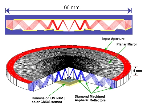 Исследователи взяли небольшой диск (прозрачный кристалл фторида кальция) и проделали в нем концентрические отверстия. Внешнее кольцо в этом устройстве служит для попадания света в данную систему. К диску применена «алмазная» огранка, а также задействуется набор отражателей, которые искусственно увеличивают оптический путь. В центре «линзы-оригами» расположен светочувствительный датчик, на который свет попадает после многократных отражений.